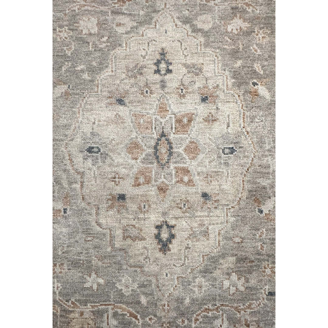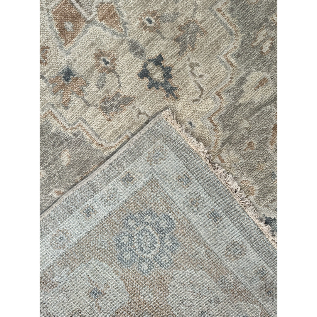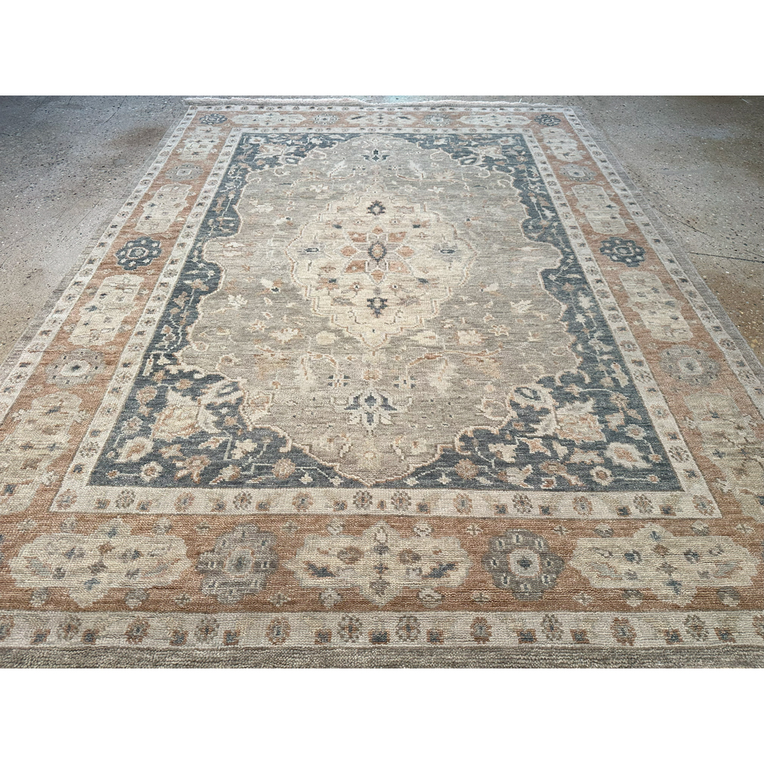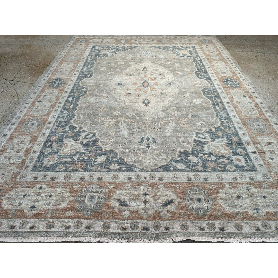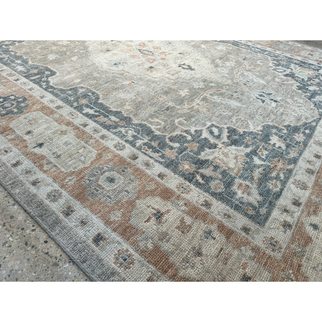 Anchor your space with the sophisticated charm of this transitional floral rug from the esteemed Lilah Collection. Measuring a generous 9′ x 12′ ft., this large area rug masterfully reinterprets a classic Persian medallion design for the modern home. Its surface is artfully distressed, giving the intricate floral patterns the soulful, time-worn character of a vintage heirloom. The design is rendered in a warm and versatile neutral palette, featuring a multi-tonal field of soft greys and beiges, a striking inner border in deep slate blue, and a wide outer border in rich tan. A soft, inviting pile adds a layer of comfort and visual texture, making it the perfect foundation for an elegant living room or a tranquil master bedroom where it will bring a sense of refined warmth to your home.