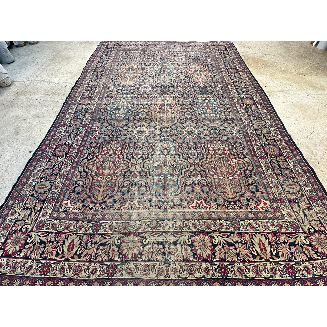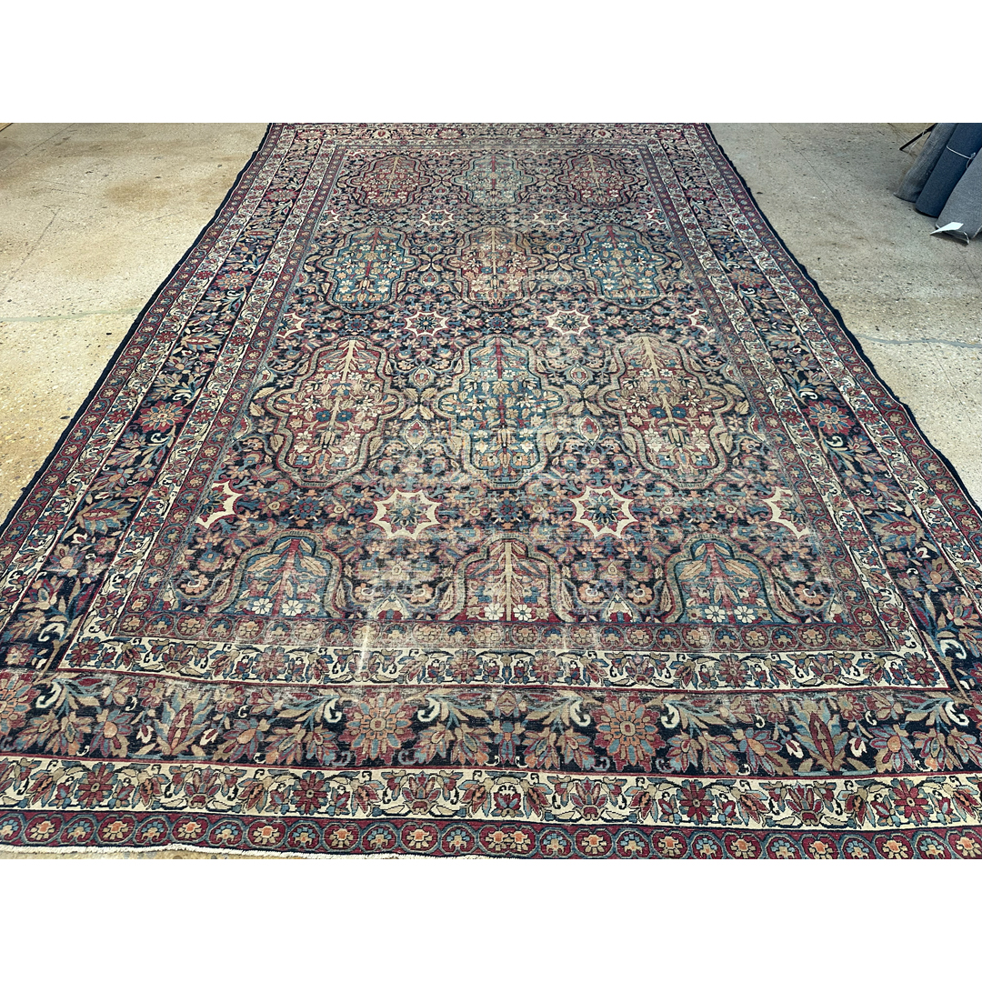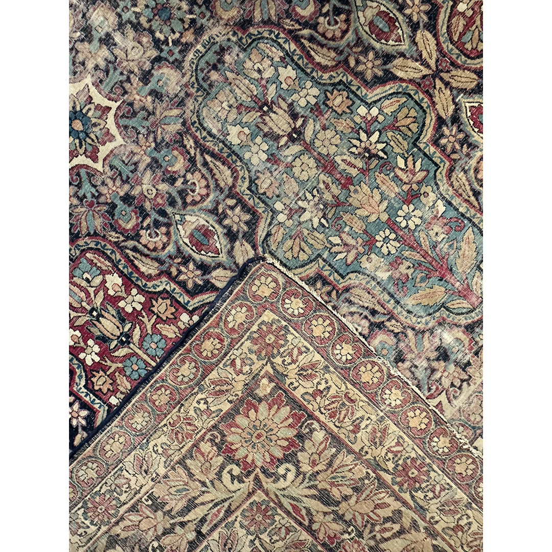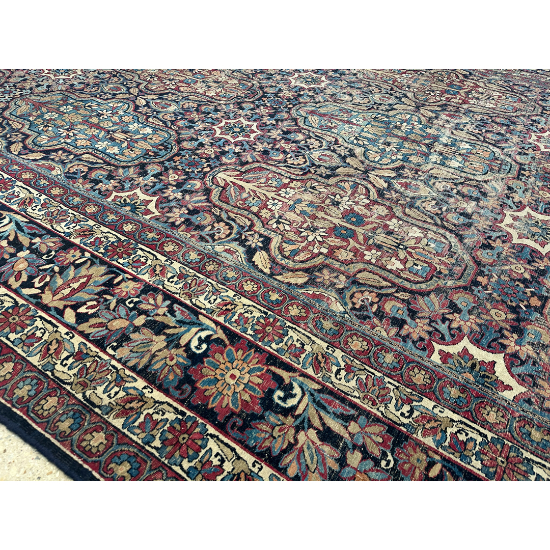 Immerse yourself in the grandeur of the 19th century with this lovely 8’9″ x 14’7″ ft. Lavar Kerman, a genuine 1880s Antique Persian Kermanshah rug. This exceptional masterpiece features a breathtakingly intricate, all-over design of repeating floral cartouches and elaborate botanical motifs, set against a rich, deep indigo and burgundy field. Expertly hand-knotted with remarkable precision, the rug showcases the tight weave and high-quality craftsmanship for which historic Kermanshah weavers are renowned. Its grand scale and sophisticated, time-softened palette make it a magnificent, historic foundation for a formal dining room, library, or great room.