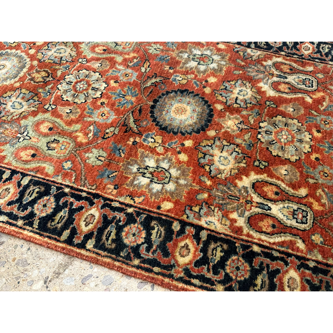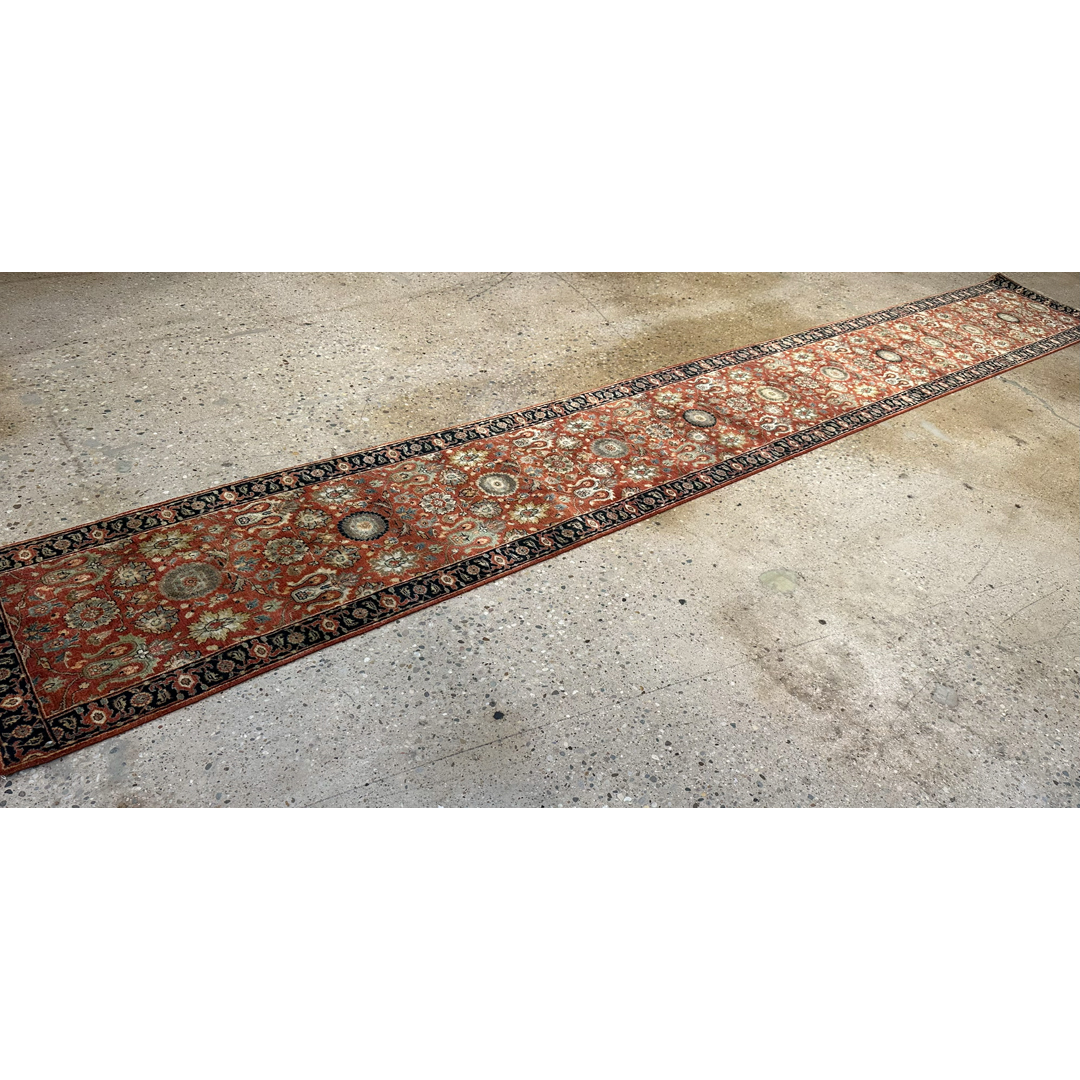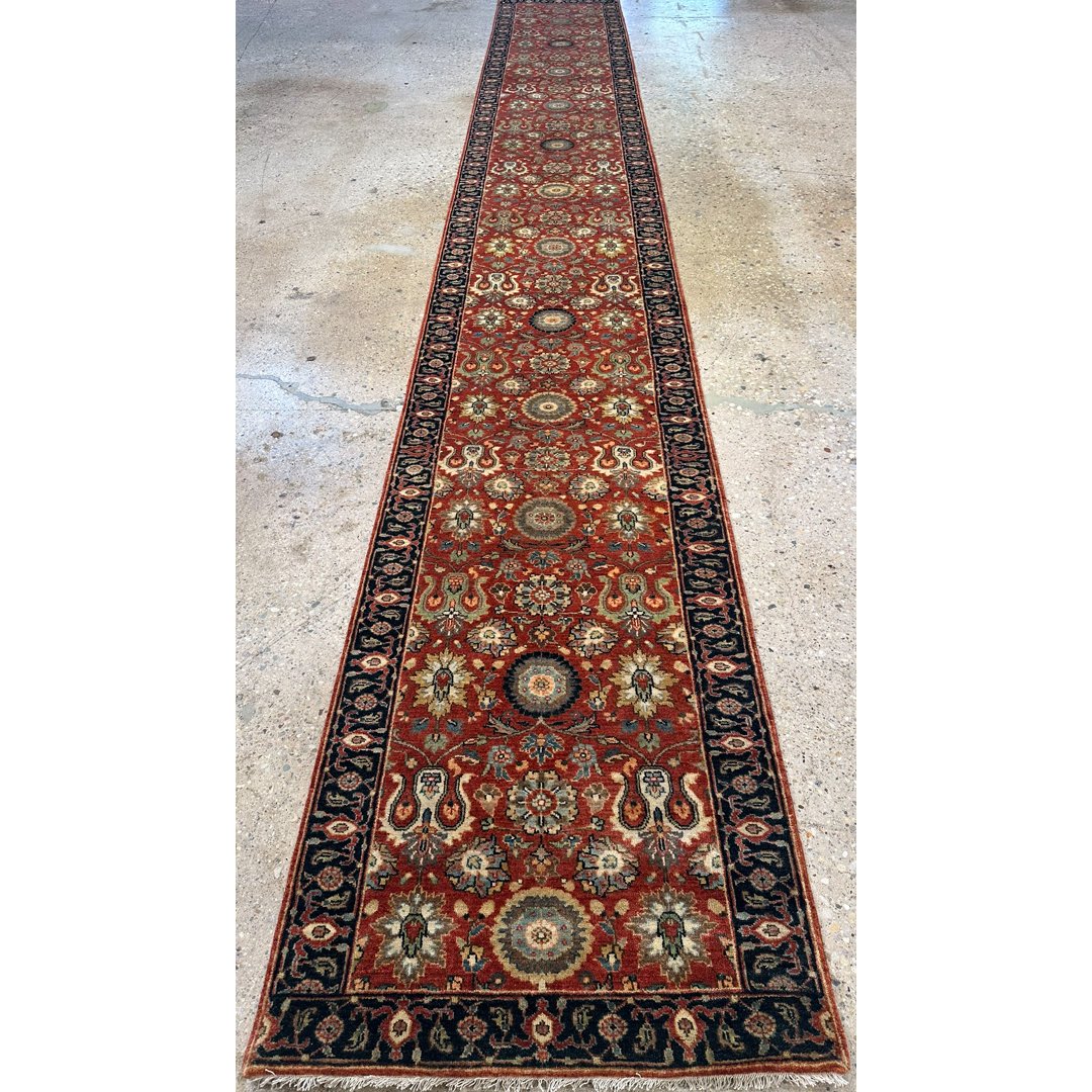 Transform your longest hallways into a space of timeless art with this grand 2’8″ x 19’9″ ft. traditional runner. Expertly hand-knotted for enduring beauty, this impressive piece features a classic, all-over design of stylized floral rosettes, palmettes, and scrolling vinery. The vibrant rust-red field provides a warm and inviting backdrop for intricate details in sage green, slate blue, and ivory. Framed by a contrasting deep navy border with complementary floral motifs, this runner is perfectly scaled to add sophisticated style and durable luxury to extensive corridors and entryways.
