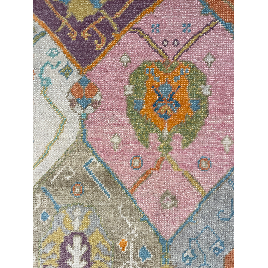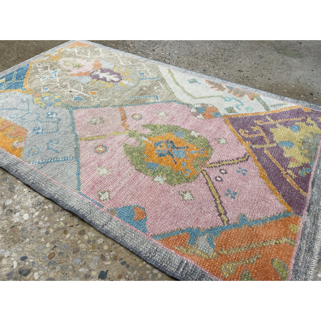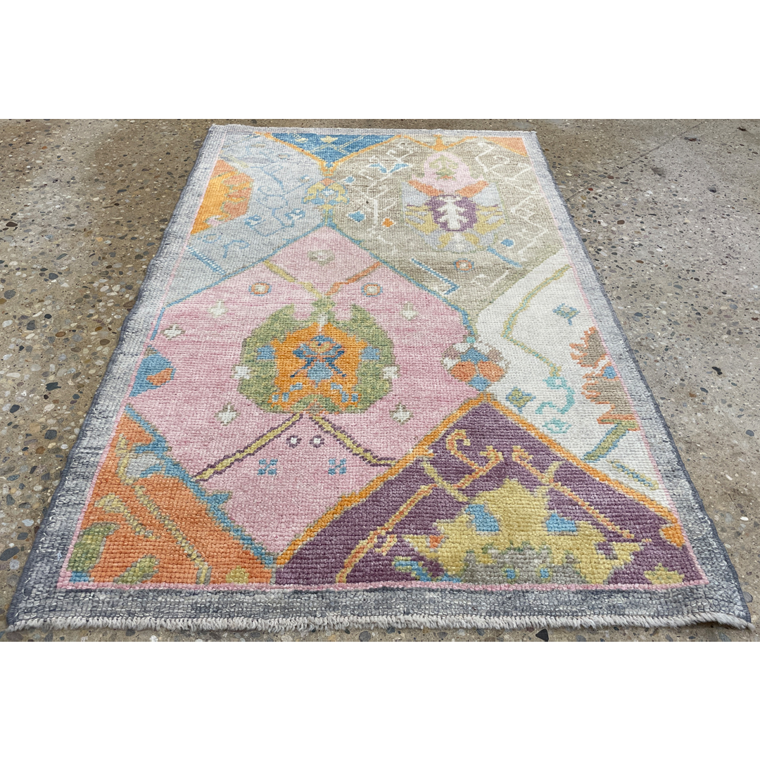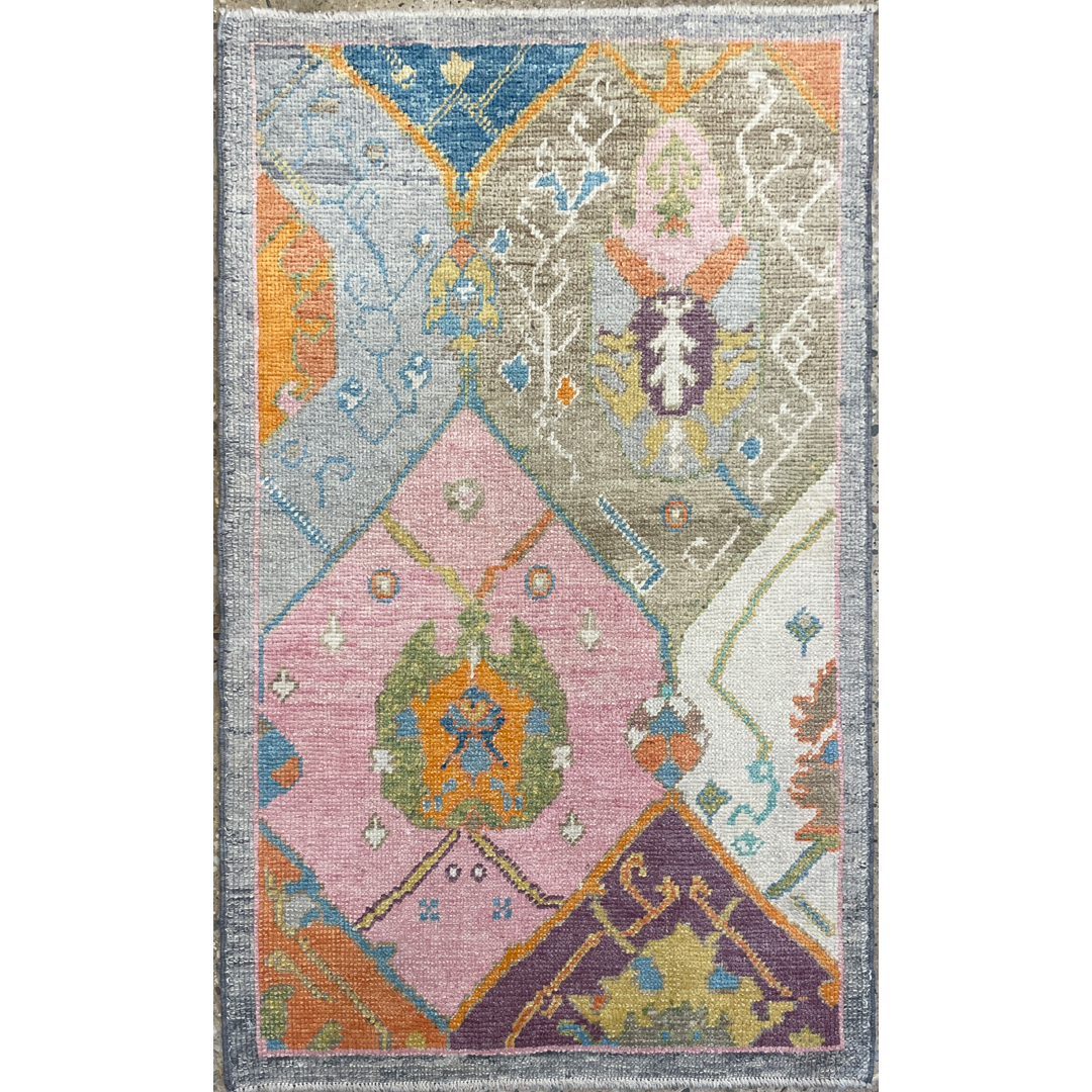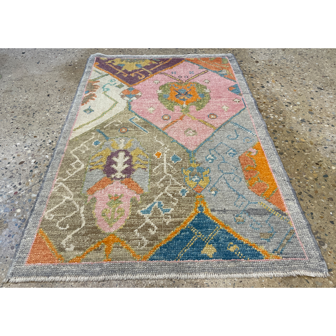 Transform your interior with the artistic flair of this magical modern 3’2″ x 5′ ft. colorful tribal Turkish rug. Expertly hand-knotted to blend traditional heritage with contemporary design, this unique piece features a captivating patchwork-style composition where fragmented classic motifs meet a fresh, vibrant palette. Distinct sections of soft pink, cool grey, purple, and bright orange are arranged in a collage-like format, creating a dynamic and playful visual texture that feels both vintage and new. This eclectic and durable rug is an ideal statement piece for a nursery, creative studio, or entryway, offering a perfect fusion of old-world charm and modern color.