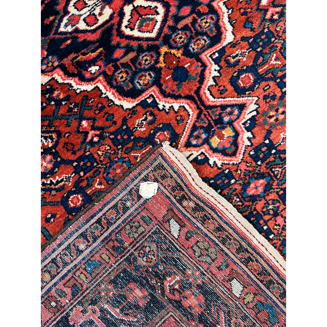 Add a layer of historic grandeur to your home with this magnificent 4’10” x 6’8″ ft. antique Persian Malayer rug. Expertly hand-knotted in the early 1900s, this genuine collector’s piece features a rich terracotta rust field adorned with an intricate, all-over lattice of stylized floral motifs and geometric vines. A striking, deep navy blue central medallion anchors the design, echoed by matching corner spandrels that create a harmonious and balanced composition. Framed by a detailed dark border filled with tribal rosettes and scrolling vines, this durable and artfully woven rug is an exceptional choice for adding warmth and timeless sophistication to a study, entryway, or living area.