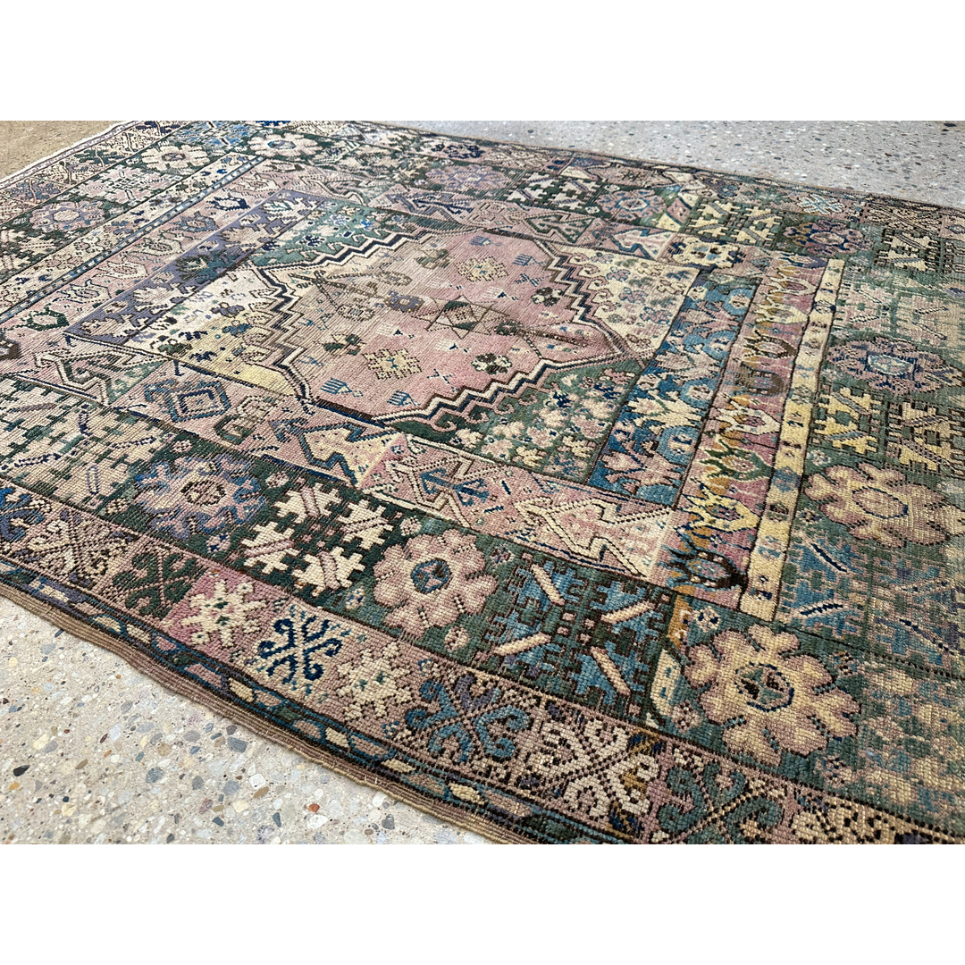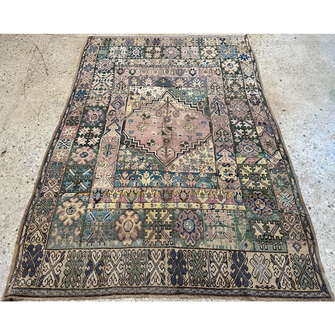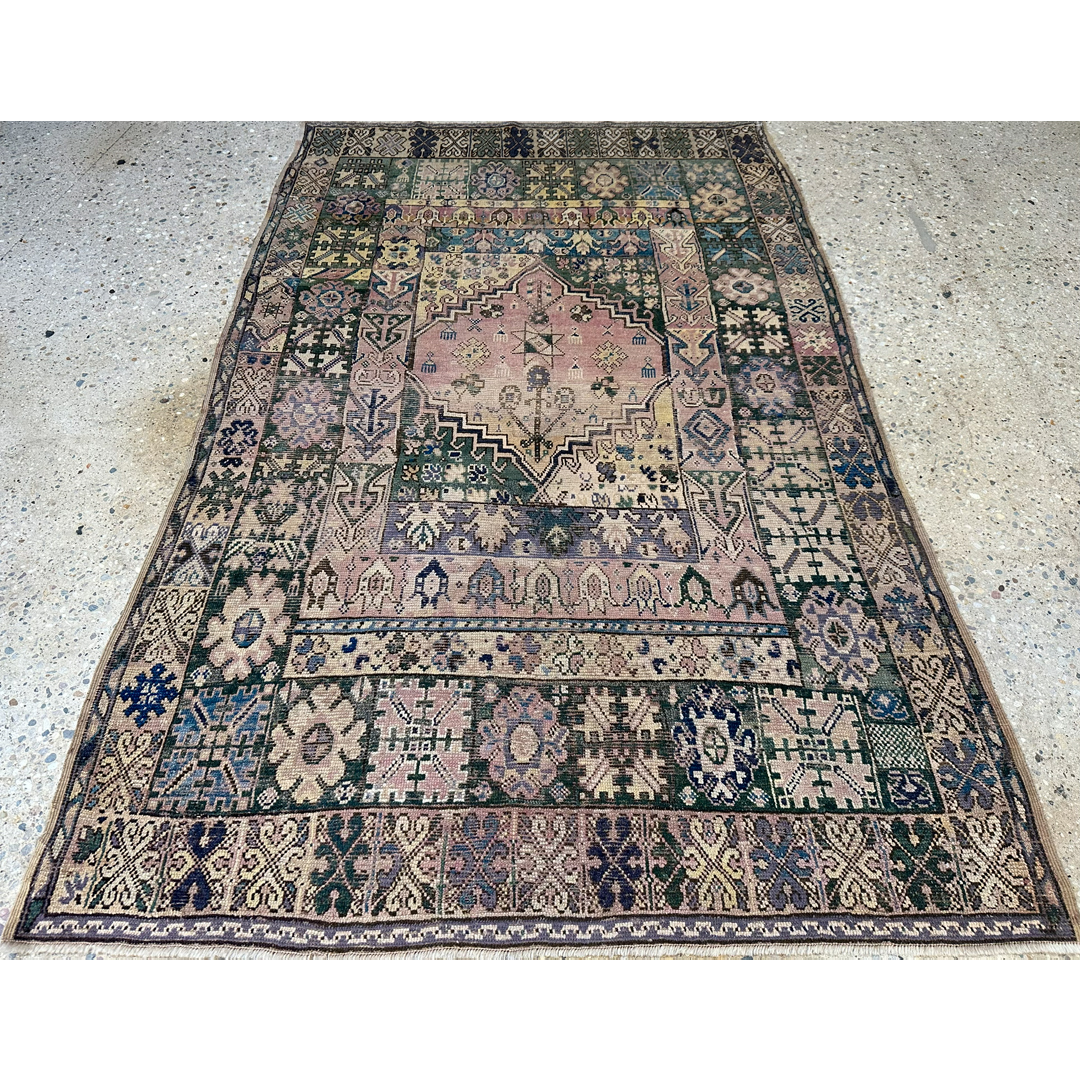 This Magnificent Moroccan rug is a captivating 1930s antique tribal piece measuring 5′ x 7’7″ ft., showcasing the soulful irregularity and expressive geometry characteristic of authentic Berber weaving. The design centers on a bold, stepped diamond medallion set against a field of soft mauve and lavender tones, surrounded by a complex array of tribal symbols and amulet motifs intended to offer protection and intricate visual storytelling. The color palette is distinctively earthy and rich, featuring deep indigo, teal, sage, and plum hues that likely stem from natural vegetable dyes of the era. Framed by multiple borders containing repeating geometric interplay, this hand-knotted artifact exudes a raw, historic charm, making it a perfect statement piece for interiors seeking warmth, texture, and a tangible connection to the past.