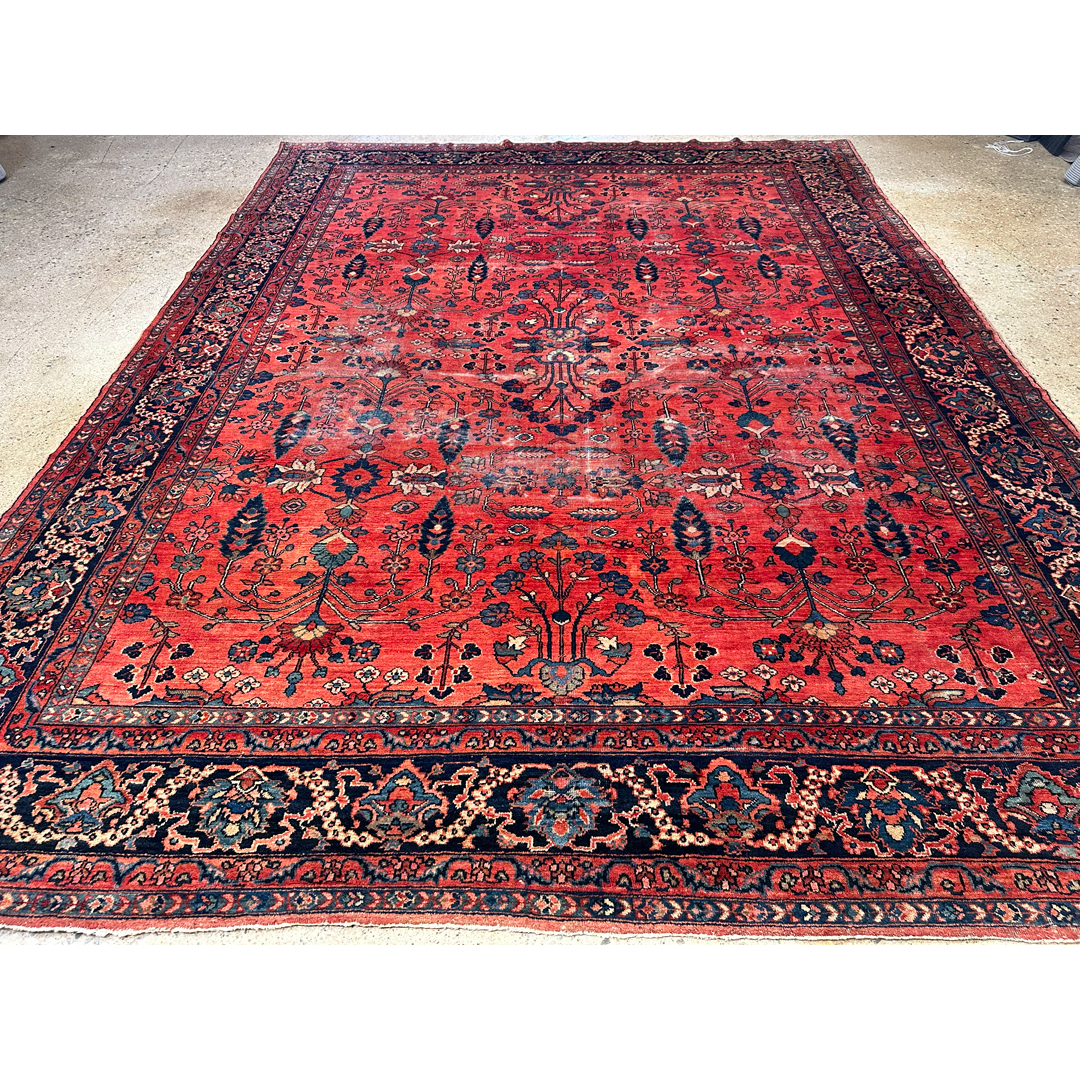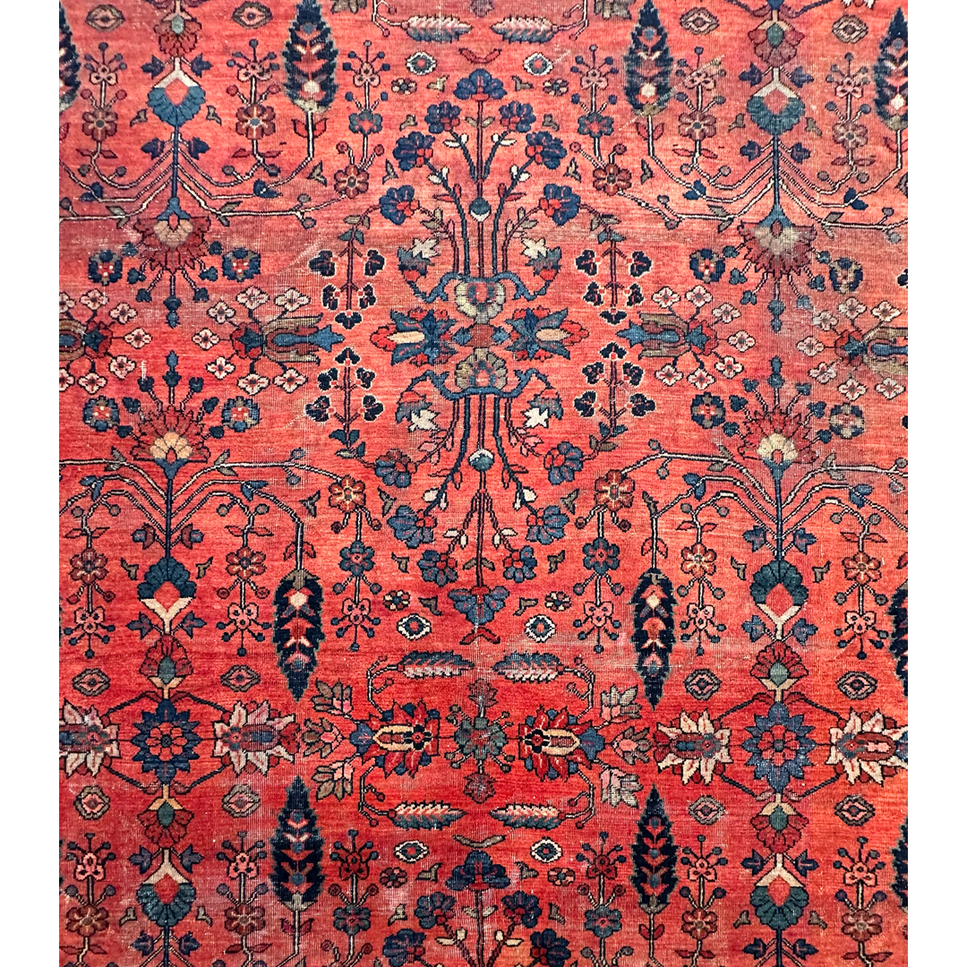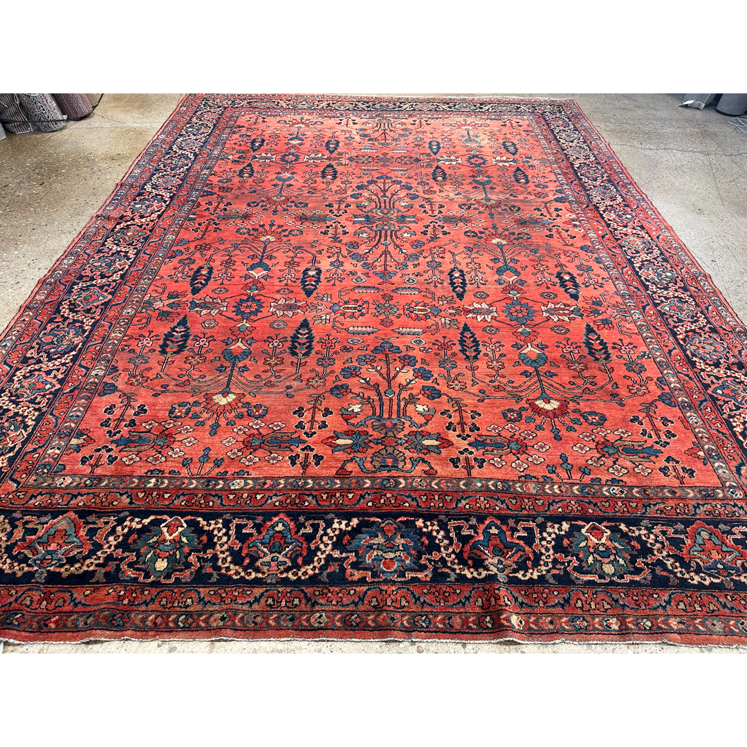 Imbue your grand living space with the warm hospitality of this majestic 10’4″ x 14′ ft. antique Persian Sultanabad Mahal rug. Hand-knotted in the 1920s, this expansive piece features a rich terracotta rust field that instantly creates a cozy and inviting atmosphere. The design is a classic all-over composition, displaying a symmetrical arrangement of large, stylized floral palmettes, flowering trees, and scrolling vines rendered in soft shades of slate blue, sage green, and ivory. A contrasting midnight indigo border, filled with a traditional floral meander and rosette pattern, frames the vibrant field with formal precision and depth. With its generous proportions and timeless floral artistry, this durable rug serves as an ideal foundation for a formal dining room, a library, or a large family gathering space.