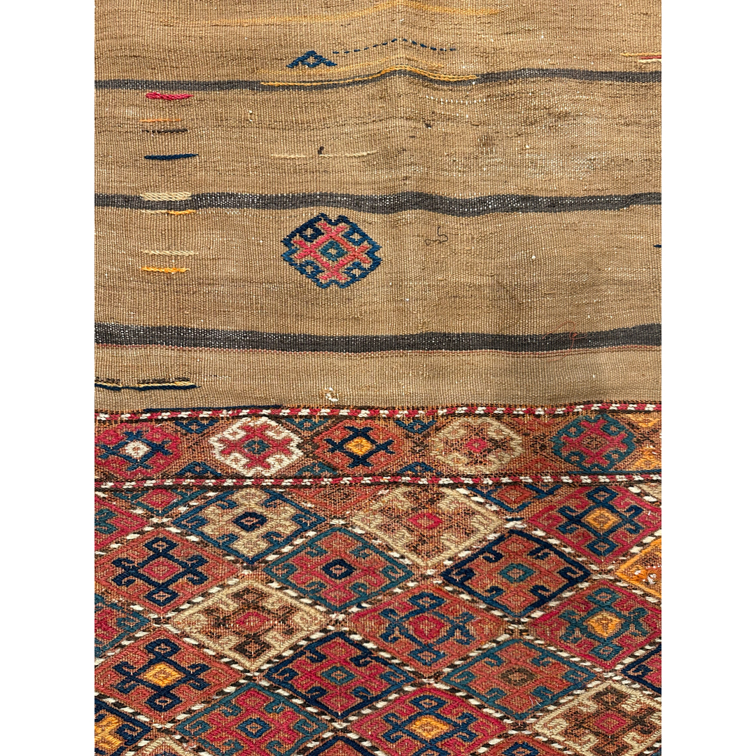 This antique Northwest Persian Kilim is an authentic “bagface,” originally part of a large, box-like woven cargo bag known as a Mafrash. The design is divided into three distinct horizontal panels: two outer sections featuring a dense, polychromatic diamond lattice, and a central panel of undyed camel-colored wool. The lattice panels are rich with geometric tribal motifs rendered in deep indigo, madder red, and saffron yellow. Small, scattered “charms” and thin horizontal stripes populate the central field, showcasing the spontaneous and individualistic expression typical of nomadic weavers.