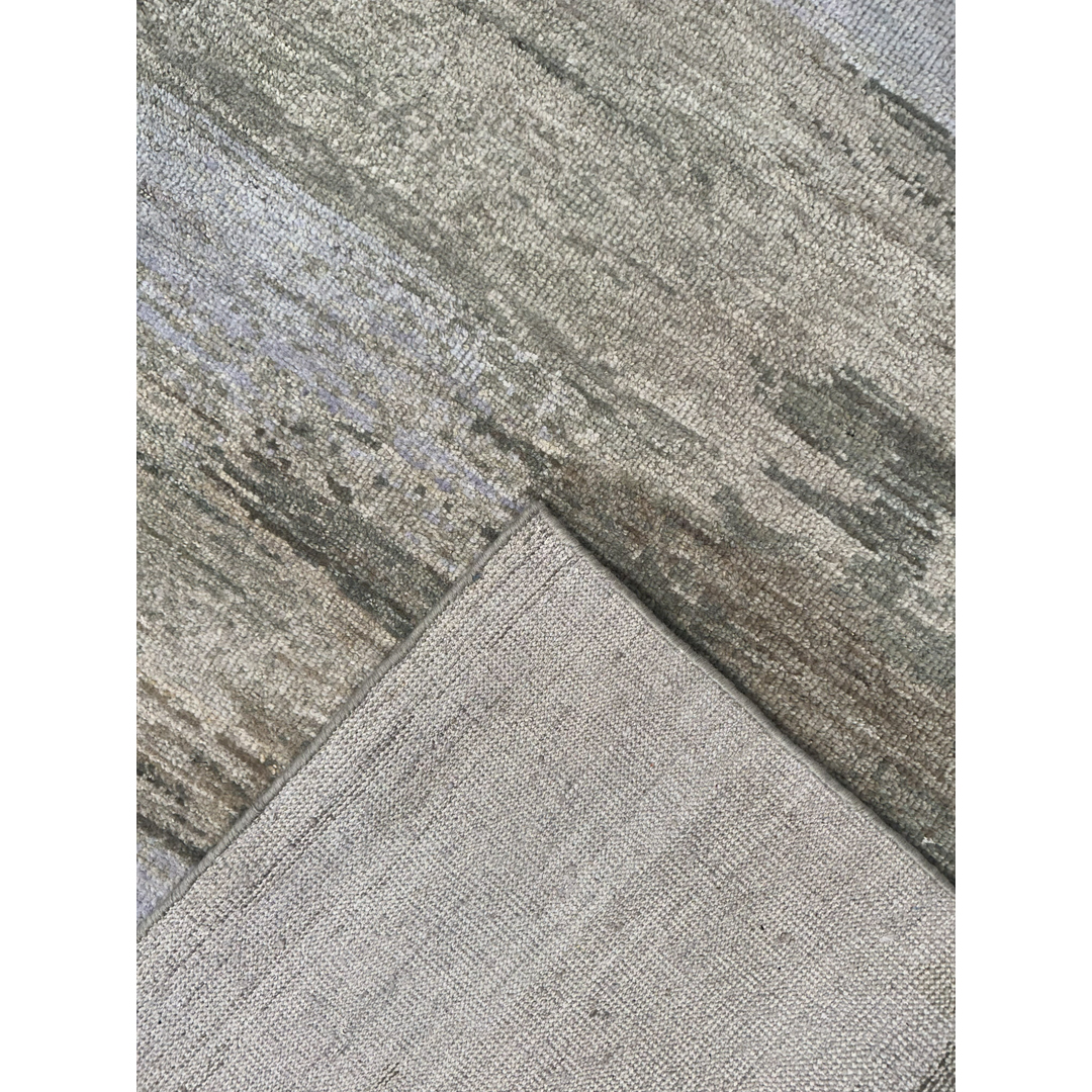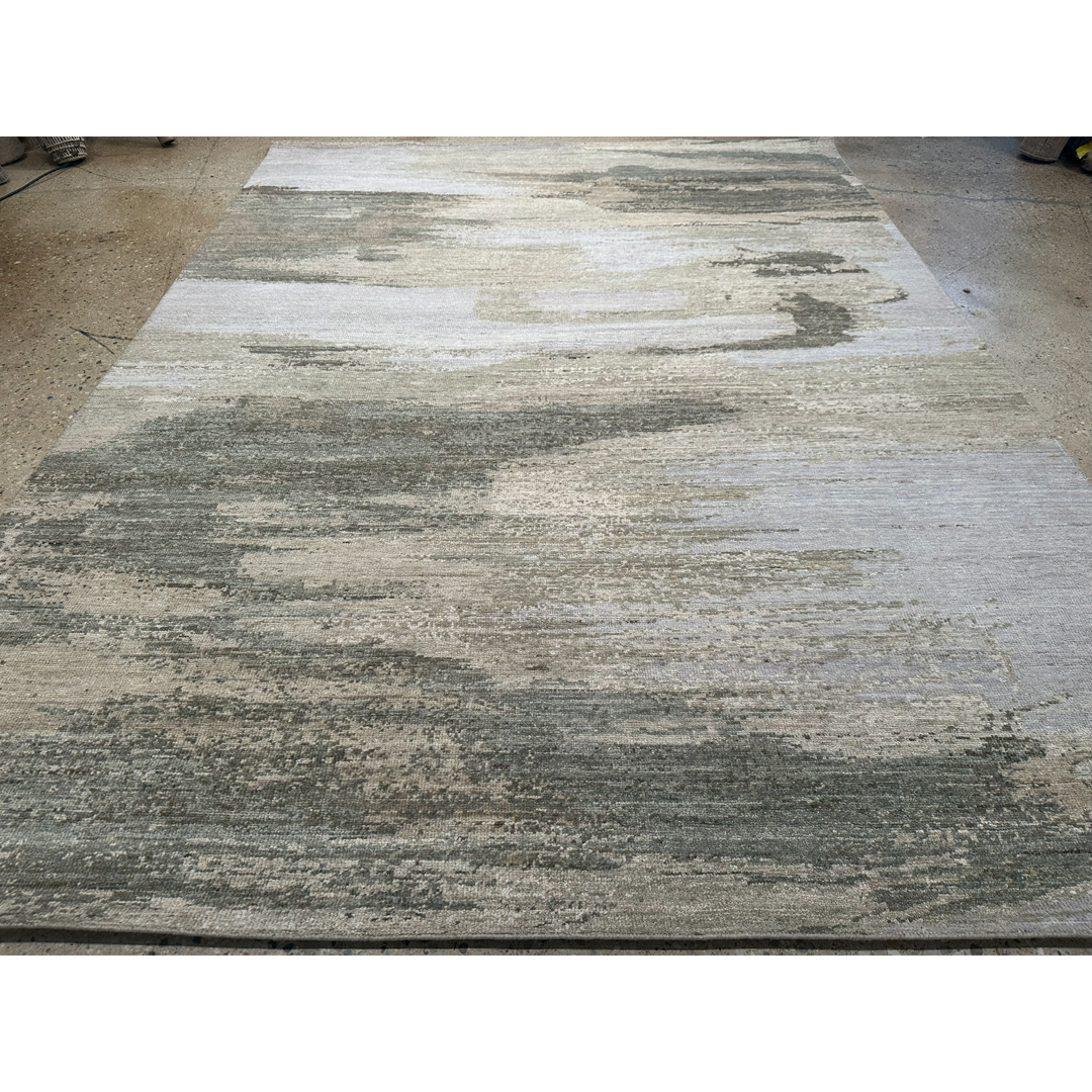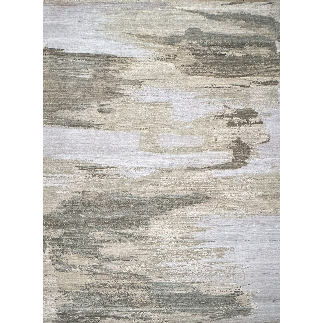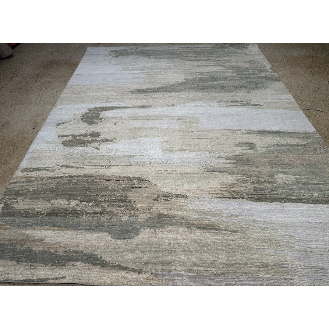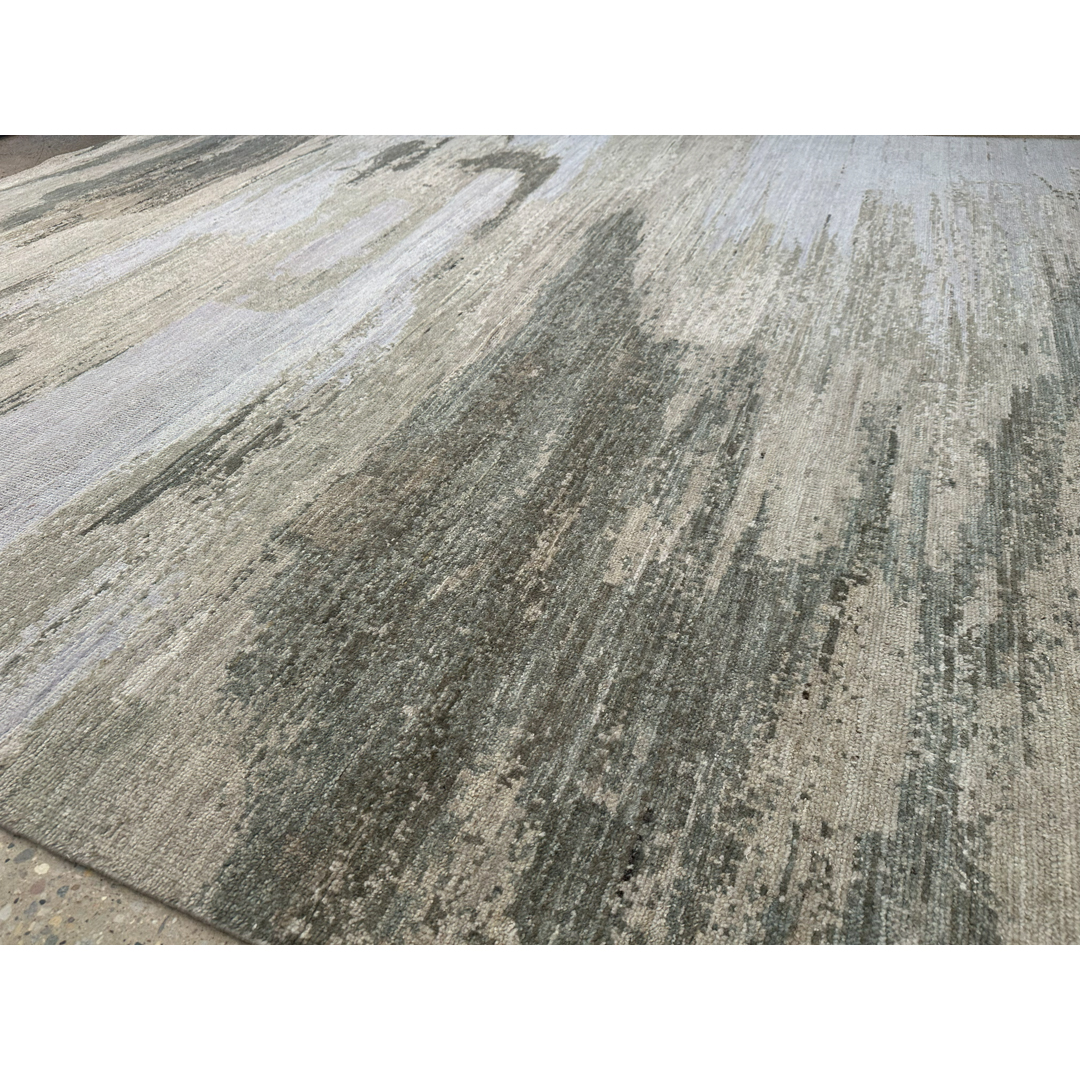 Serving as contemporary art for your floor, this stunning hand-knotted Indian rug captures the fluid, sweeping beauty of an abstract watercolor painting. The design abandons rigid geometry in favor of organic, horizontal brushstrokes that evoke a misty morning horizon or the serene striations of weathered stone.