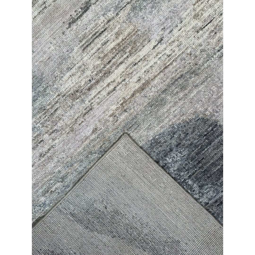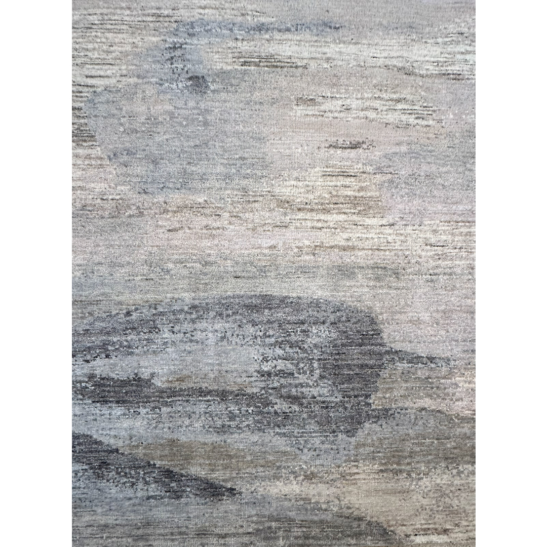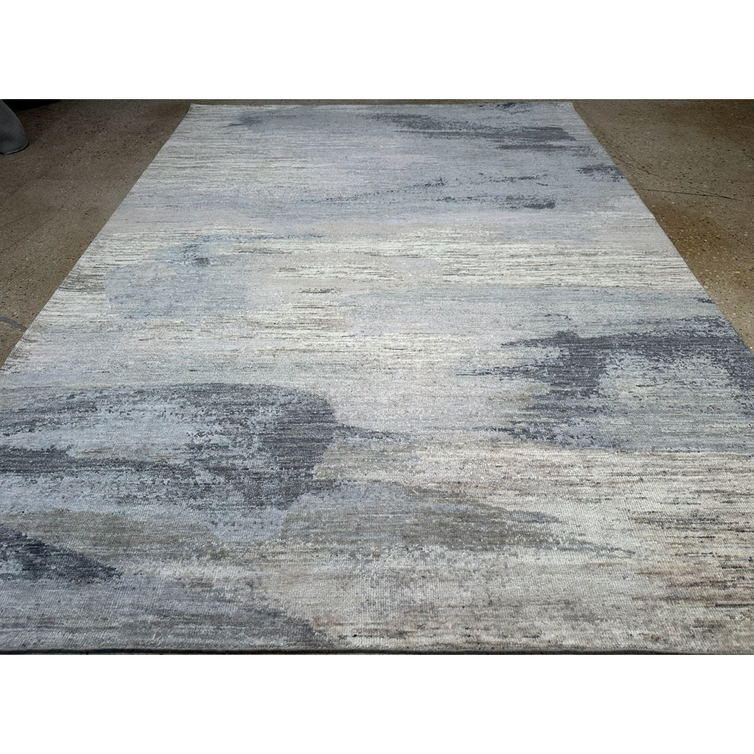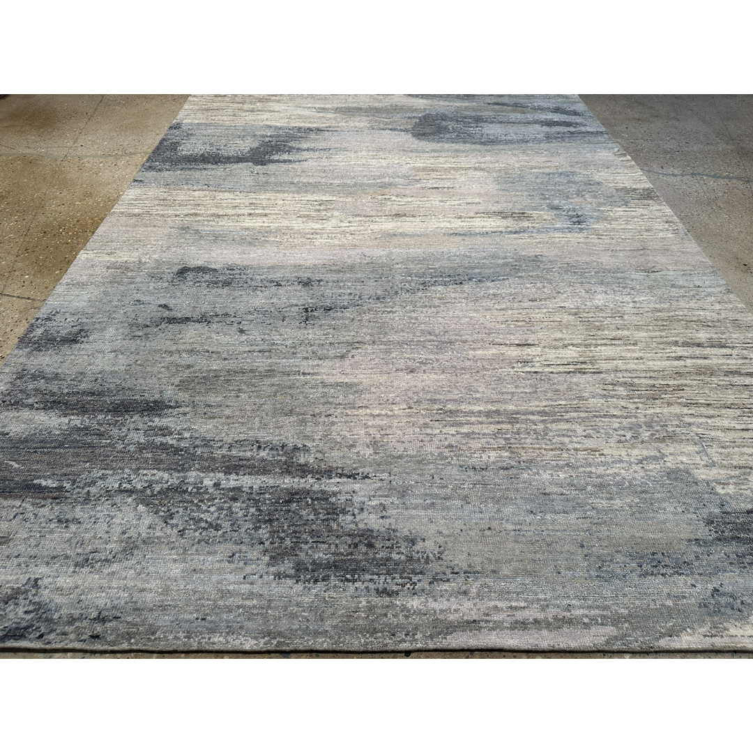 Woven in India, this large-scale modern area rug utilizes a completely fluid, abstract layout. Moving entirely away from traditional motifs or structured borders, the design relies on a continuous, organic transition of tones that mimics a beautiful watercolor painting or an atmospheric sky. Constructed with a beautifully plush, even pile, the rug offers subtle, luminous variations as light hits the fibers, emphasizing its dynamic woven texture.