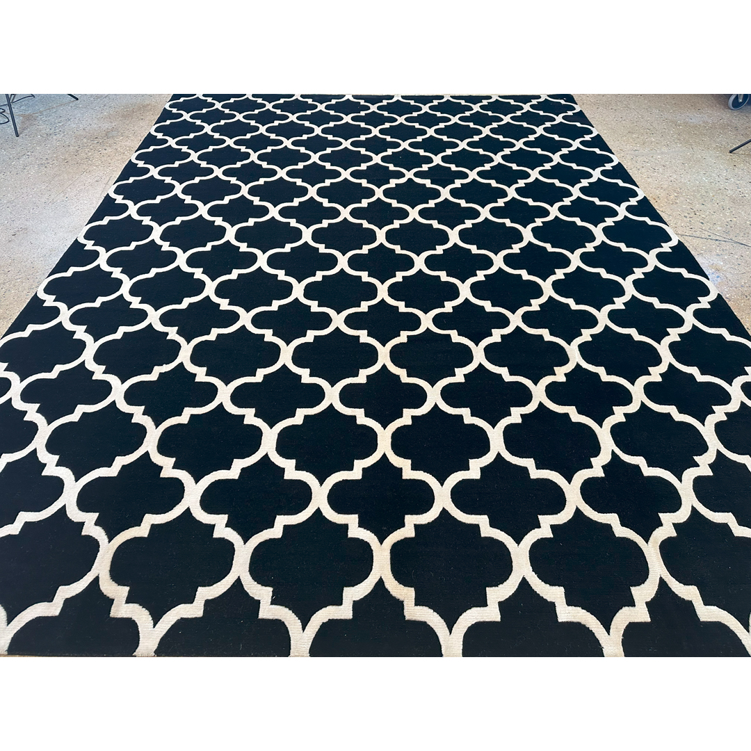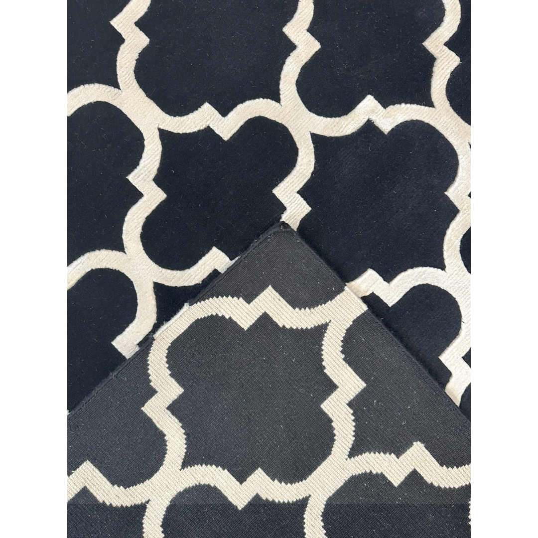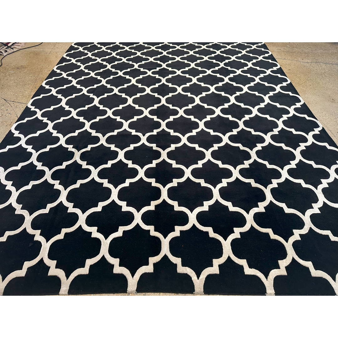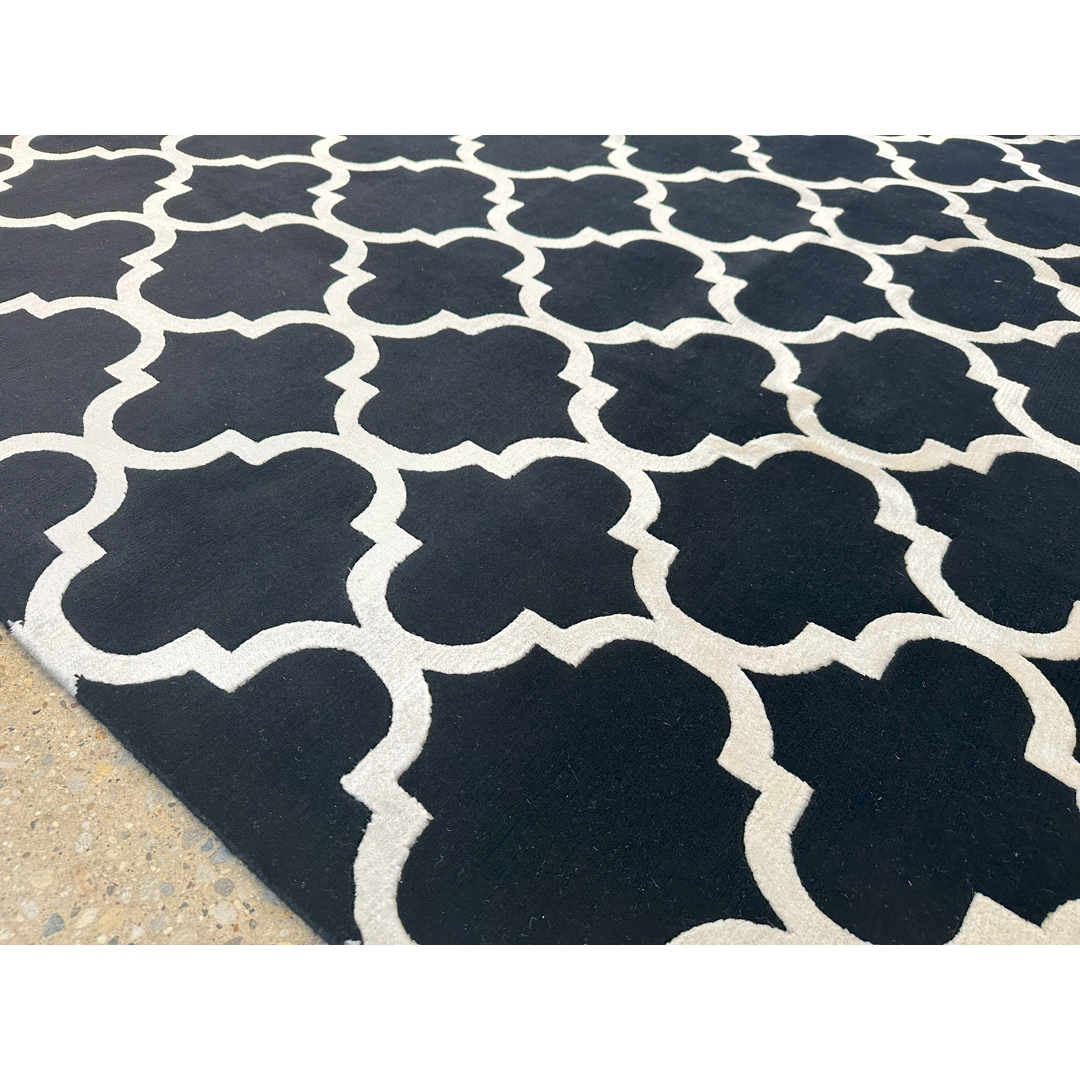 This striking hand-knotted Indian rug delivers a bold, high-contrast interpretation of the traditional Tibetan quatrefoil design. The borderless composition is defined by a continuous, large-scale geometric lattice in crisp, luminous white, set against a deeply saturated, solid black field. This classic architectural pattern brings an immediate sense of tailored glamour and graphic energy to any interior. The weave combines matte black wool with shimmering white bamboo-silk, resulting in a dense, plush pile with a gorgeous, light-reflective sheen. This interplay of materials softens the sharp geometry, offering an incredibly tactile and opulent underfoot experience.