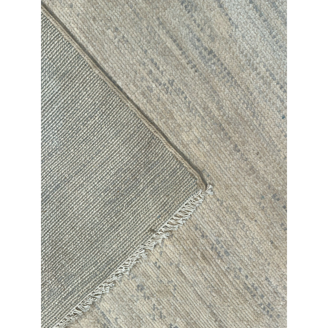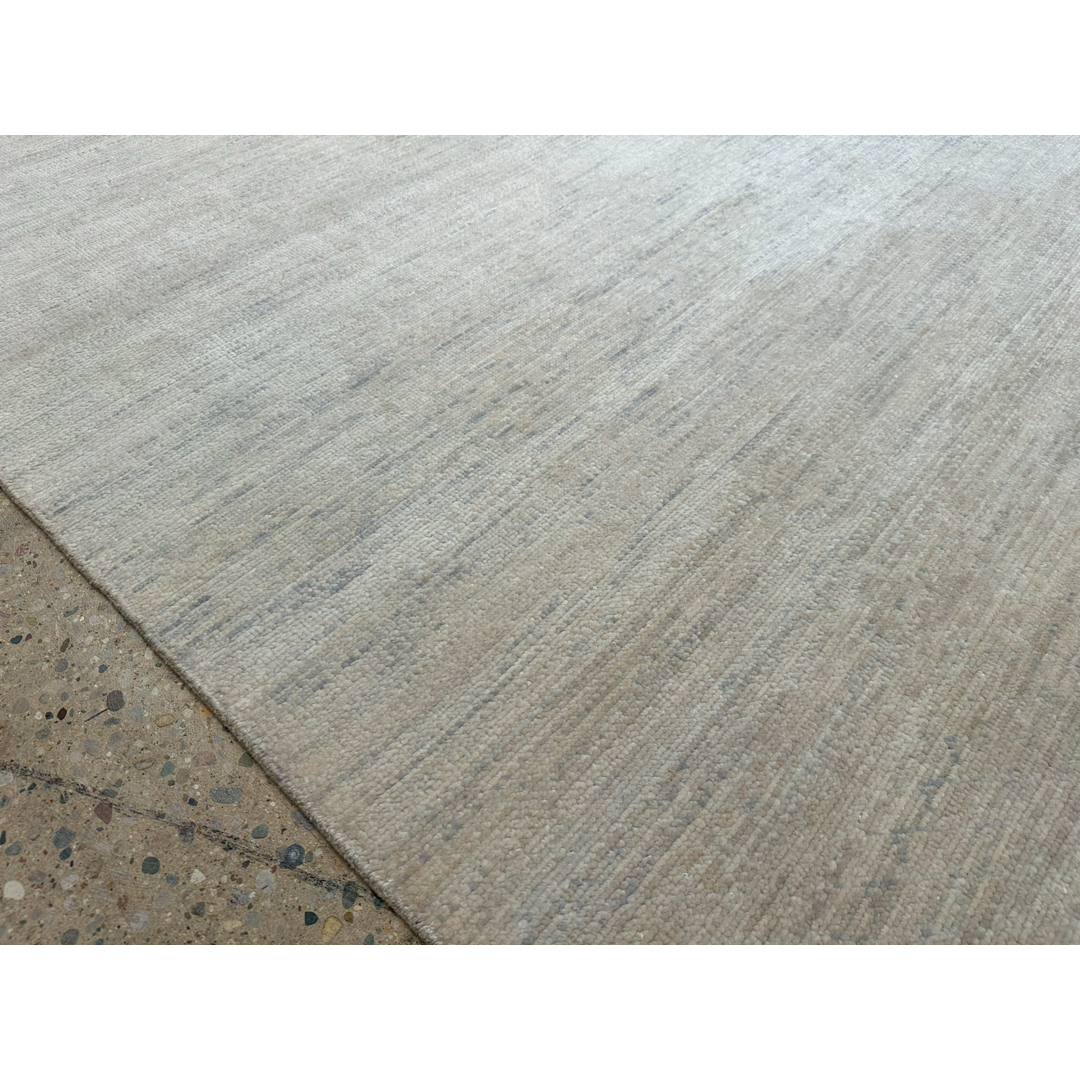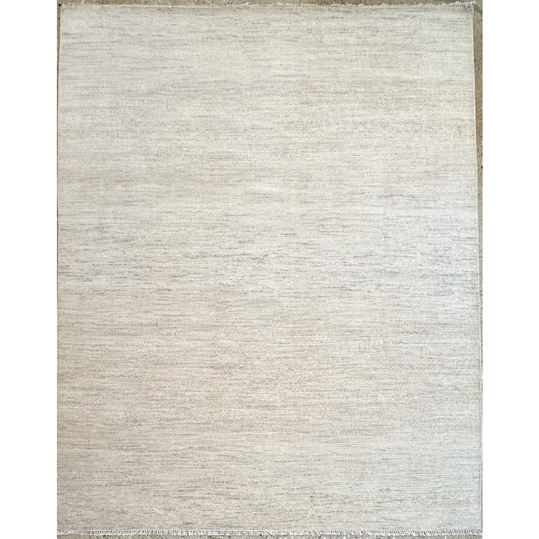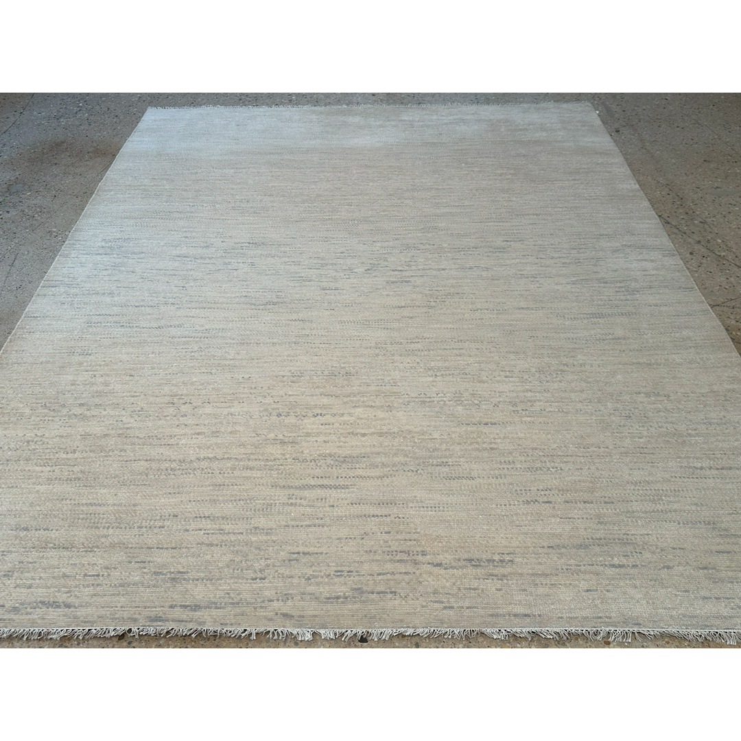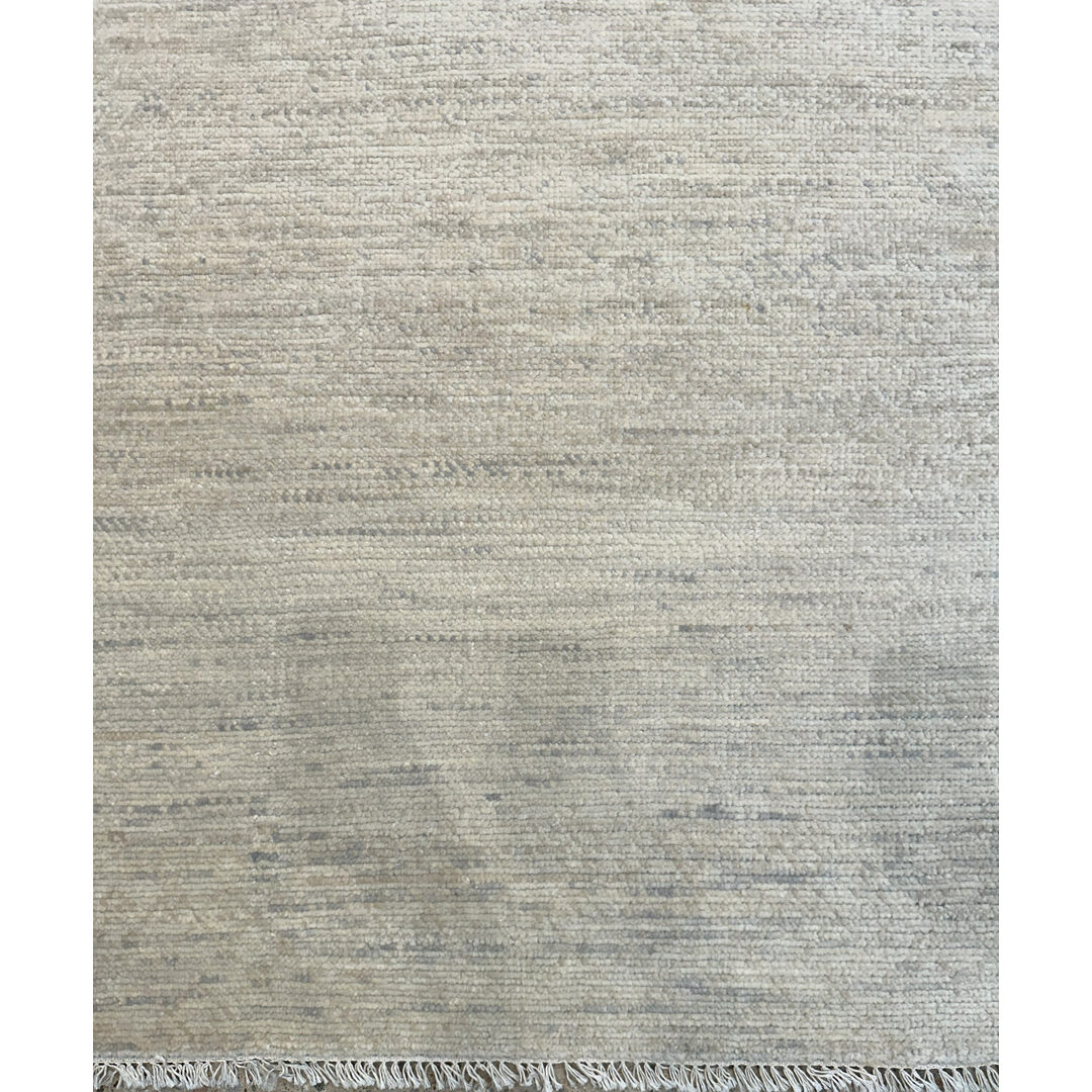 This hand-knotted Indian rug offers a beautiful example of modern minimalism and “quiet luxury.” Bypassing traditional motifs and geometric patterns, the design relies entirely on the sophisticated interplay of texture and subtle color variation. The expansive, borderless field features a luminous, tone-on-tone palette of soft ivory, alabaster, and faint pearl grey, creating a serene and airy foundation that effortlessly reflects natural light. Woven with a high-quality, lustrous wool, the rug is characterized by beautiful horizontal and diagonal color variations. These delicate, linear variations in the yarn give the piece an organic depth and tactile richness, ensuring the solid color never feels flat or sterile. With its versatile 8′ x 10′ ft. dimensions and pristine neutral aesthetic, this rug is an ideal, grounding centerpiece for a minimalist Evanston loft, a tranquil master suite, or any contemporary North Shore space that demands a clean, sophisticated canvas.
