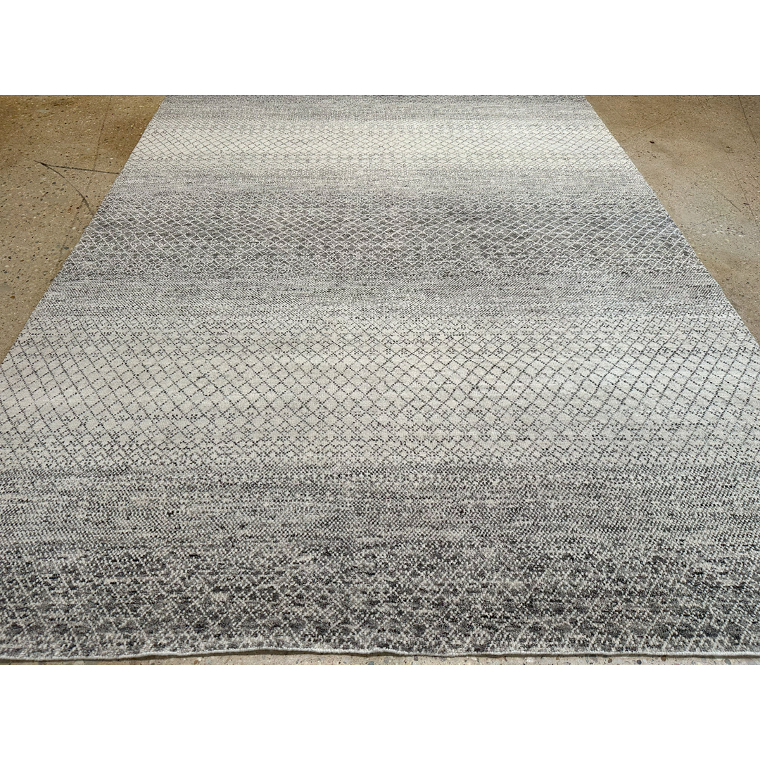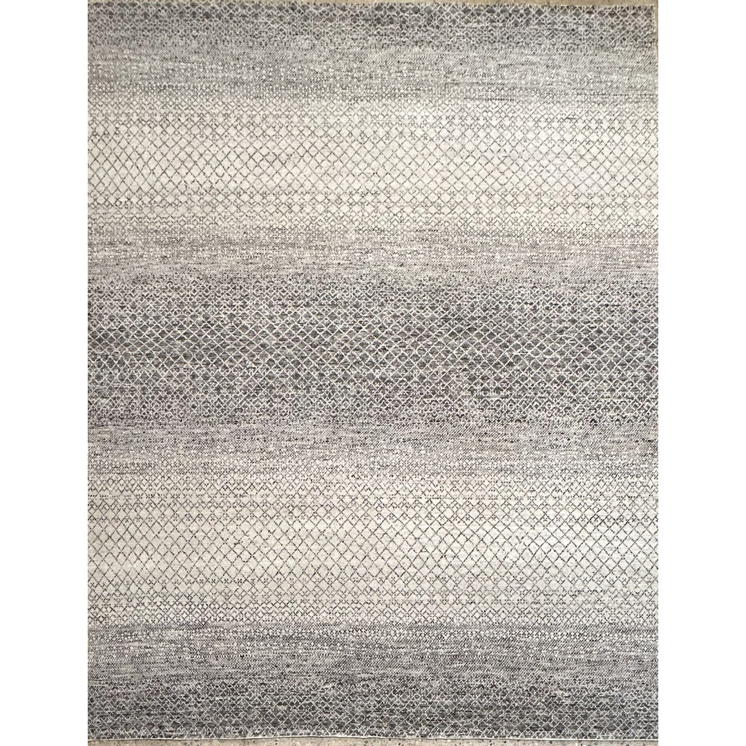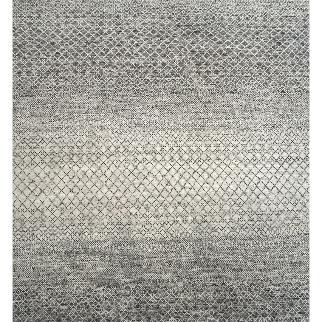 This exquisite hand-knotted Indian rug boasts a remarkably fine quality weave, presenting a sophisticated, contemporary interpretation of a minimalist “grass” or micro-lattice motif. The design features a delicate, continuous geometric network of fine charcoal lines cascading across a luminous ivory field. The true mastery of this piece lies in its striking horizontal color banding—an intentional, ombré-like effect where the density of the charcoal shifts across the length of the rug, creating broad, rhythmic waves of light and dark. Woven with a premium wool, this carpet offers a dense soft pile that maximizes the crisp clarity of the intricate pattern, ensuring exceptional durability while providing a sleek, tailored finish. With its versatile dimensions and muted ivory and charcoal palette, this rug provides a stunning, graphic foundation. It is an exceptional contemporary piece, perfectly suited to anchor a modern loft, a sleek home office, or a chic transitional living room.