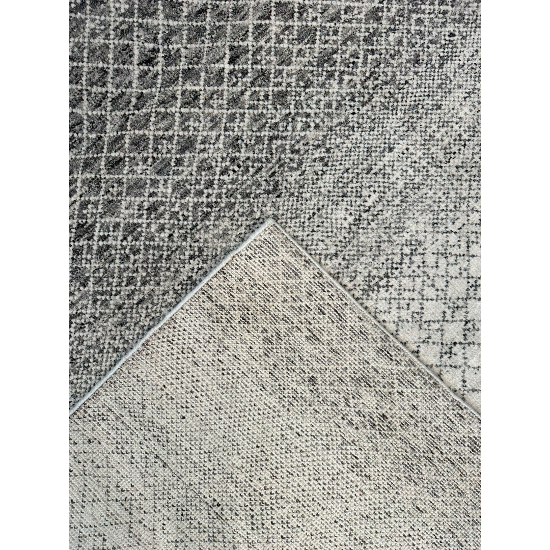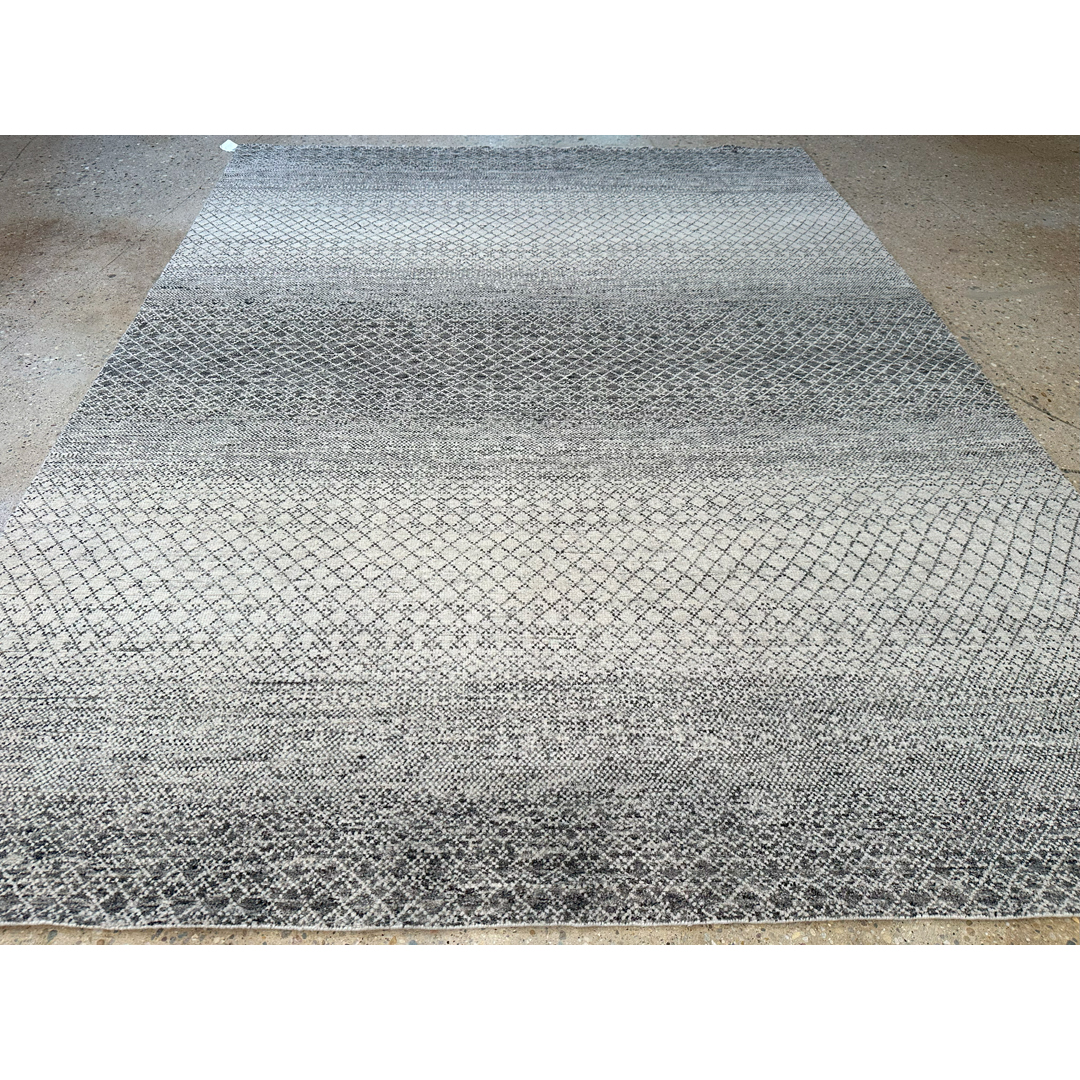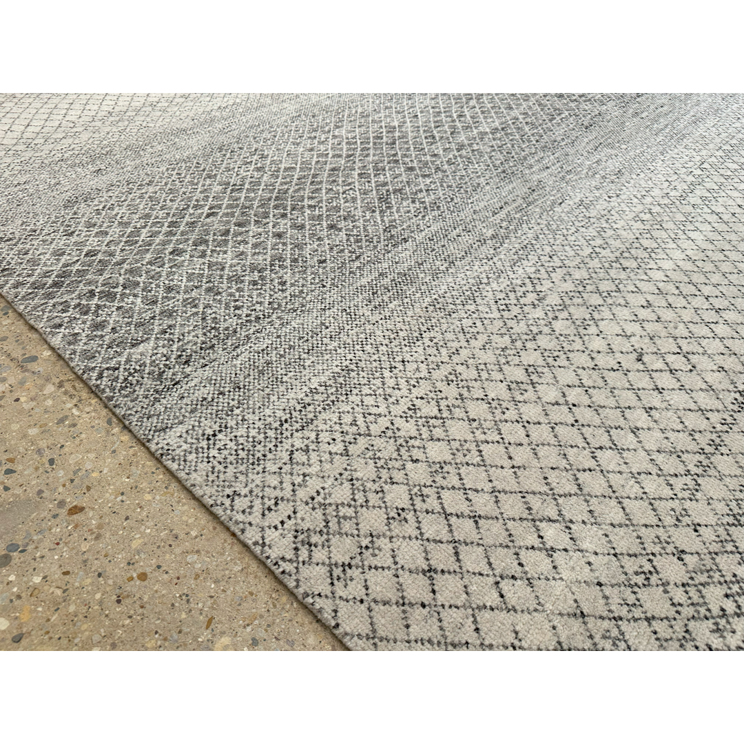 This exquisite hand-knotted Indian rug boasts a remarkably fine quality weave, presenting a sophisticated, contemporary interpretation of a minimalist “grass” or micro-lattice motif. The design features a delicate, continuous geometric network of fine charcoal lines cascading across a luminous ivory field. The true mastery of this piece lies in its striking horizontal color banding—an intentional, ombré-like effect where the density of the charcoal shifts across the length of the rug, creating broad, rhythmic waves of light and dark. Woven with a premium wool, this carpet offers a dense soft pile that maximizes the crisp clarity of the intricate pattern, ensuring exceptional durability while providing a sleek, tailored finish. With its versatile dimensions and muted ivory and charcoal palette, this rug provides a stunning, graphic foundation. It is an exceptional contemporary piece, perfectly suited to anchor a modern loft, a sleek home office, or a chic transitional living room.