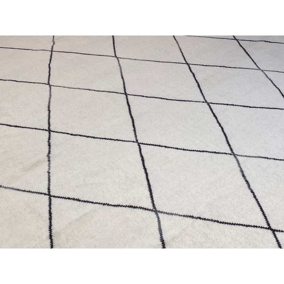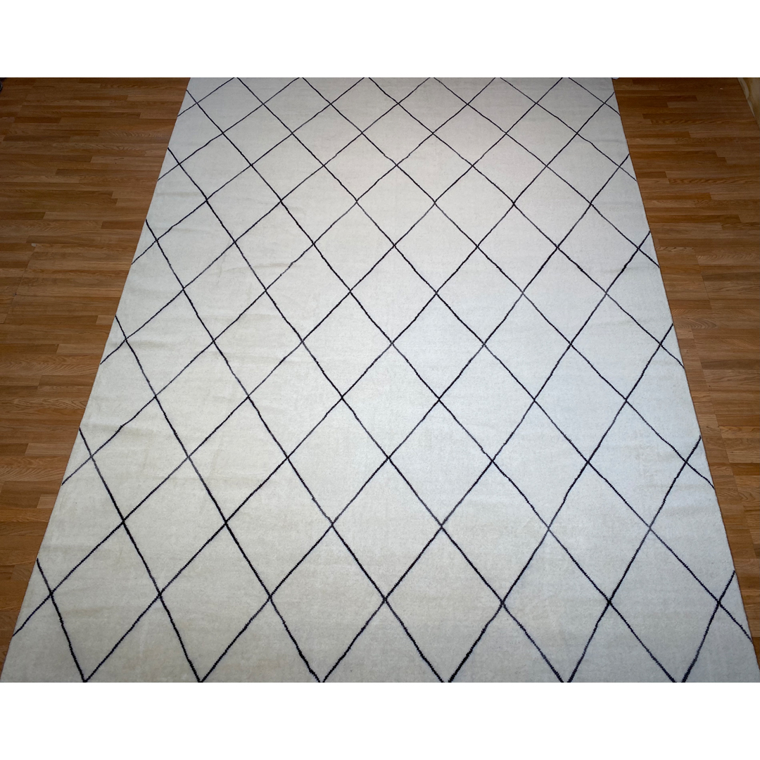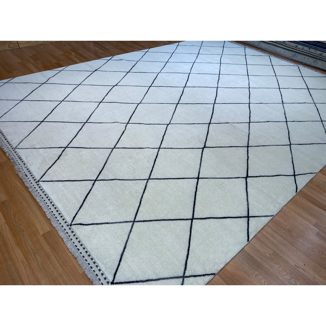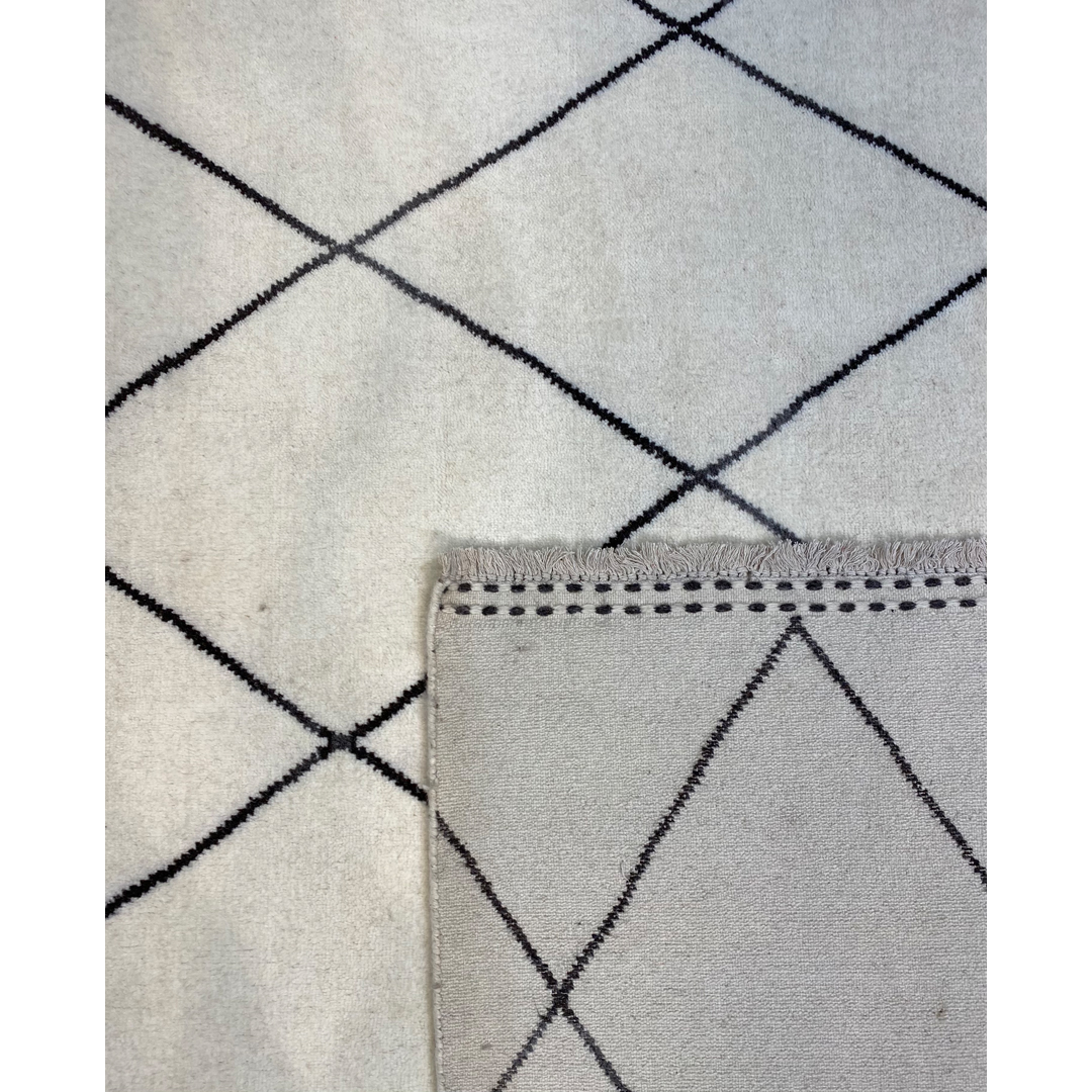 This hand-knotted Indian rug offers a sophisticated, minimalist interpretation of the iconic Moroccan Beni Ourain aesthetic. The design features a clean, expansive field of soft ivory, populated by a rhythmic, large-scale diamond lattice in a contrasting charcoal tone. The lines of the lattice are rendered with a slightly organic, hand-drawn quality, adding a layer of tactile warmth to the high-contrast graphic composition.Woven with high-quality wool, the piece features a plush, substantial pile that emphasizes comfort and luxury. Its grand scale and classic monochrome palette make it an exceptionally versatile foundation, ideal for anchoring modern Scandinavian, coastal, or contemporary-minimalist living spaces.