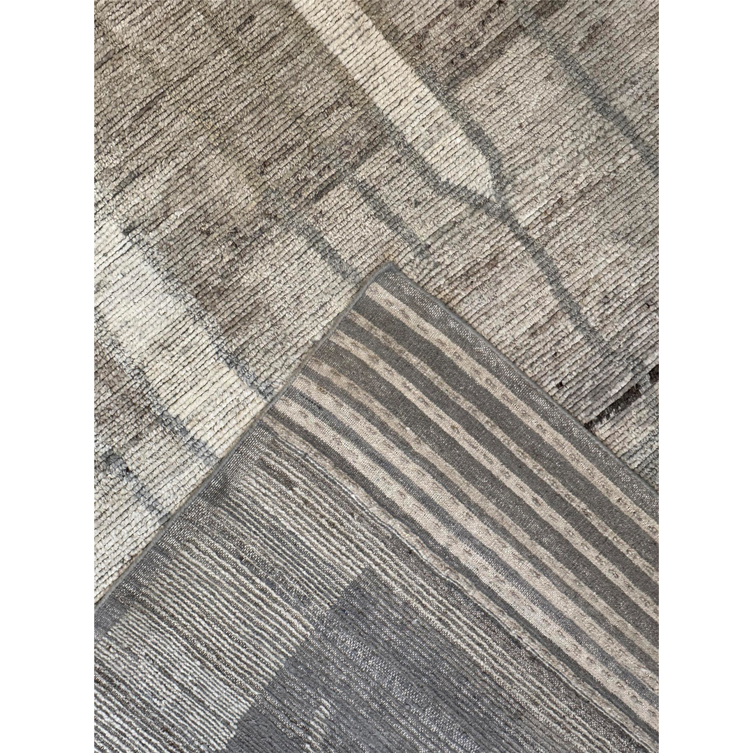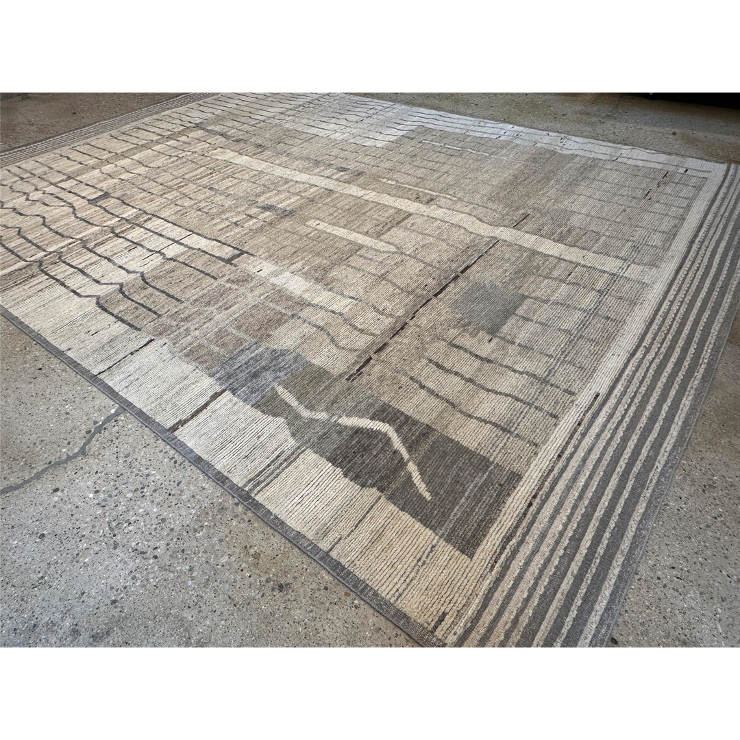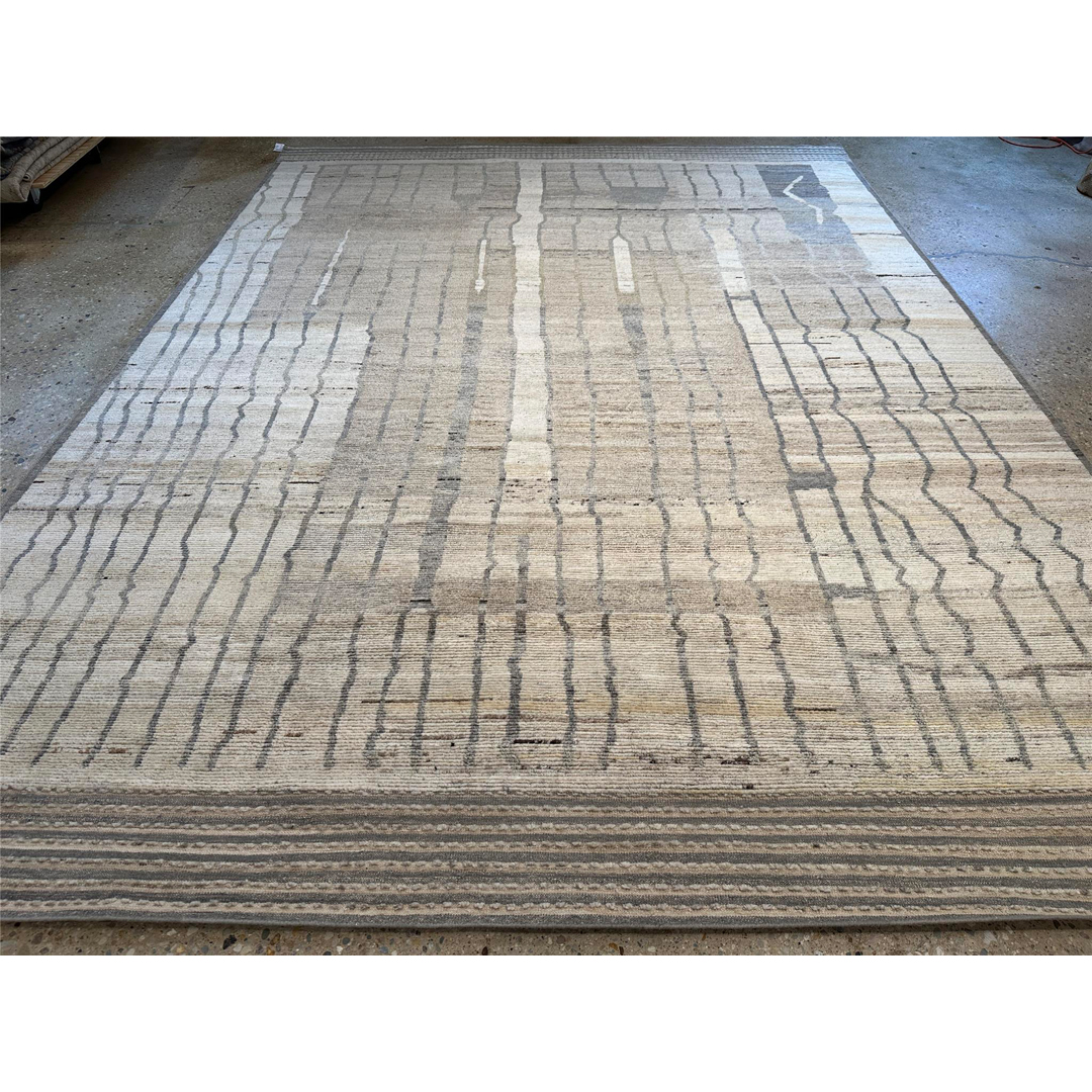 Anchor your space with this stunning 10′ x 14′ ft. modern Moroccan rug. This piece features a sophisticated abstract and linear design, reminiscent of tribal motifs. Vertical, broken lines in shades of charcoal gray and taupe are layered over a textured, ribbed field of soft beige and light gray. This minimalist, neutral palette creates a serene and organic feel, making it a versatile foundation for a contemporary, Scandinavian, or minimalist living room or dining area. Its generous size and subtle artistry add a touch of understated elegance to any large space.