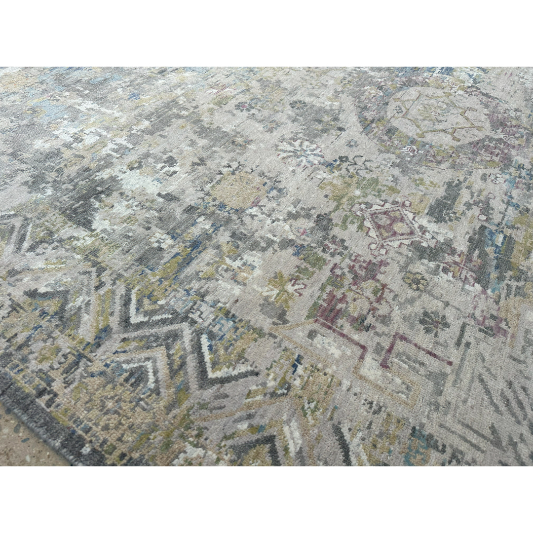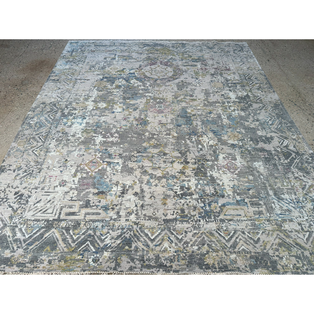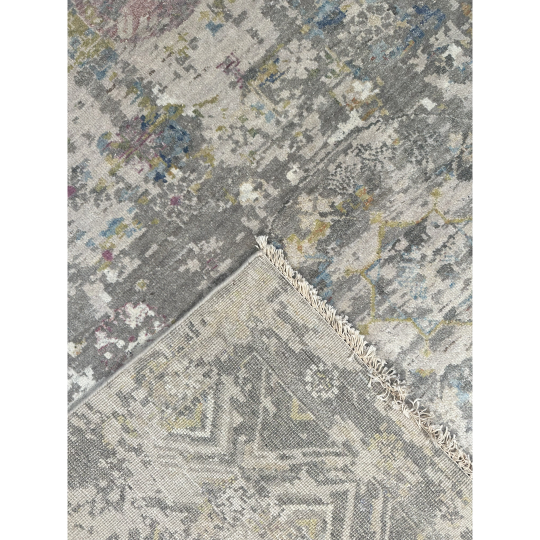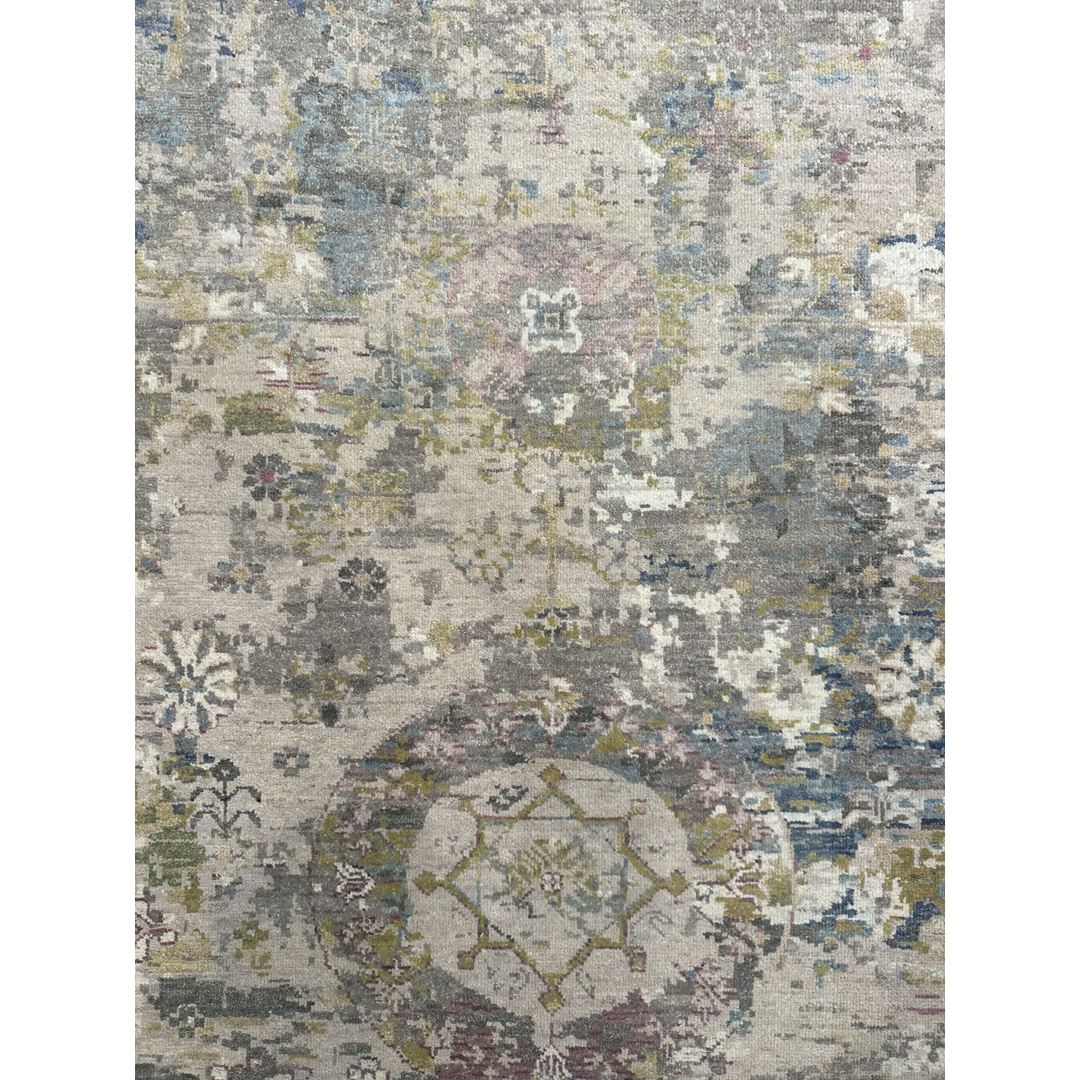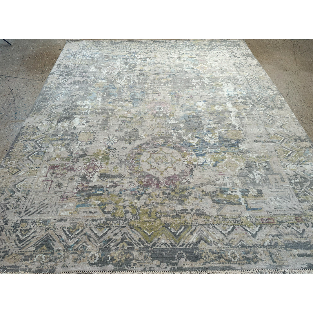 Elevate your space with the Miraculous Modern, a contemporary design rug that seamlessly blends artistry with understated elegance. This 8′ x 10′ ft. area rug offers a captivating abstract interpretation of a timeless Oriental design. Its beautifully distressed and faded appearance creates a sense of history and depth, revealing ghostly traces of a central medallion and a traditional border beneath its modern surface. The sophisticated, muted color palette is grounded in a serene neutral base of cream and beige, layered with soft greys, muted slate blues, and earthy hints of olive green. As the perfect foundation for a contemporary living room, minimalist bedroom, or chic office, this 8×10 rug acts as a piece of modern floor art, providing a soft, low-pile texture and a tranquil, sophisticated atmosphere.