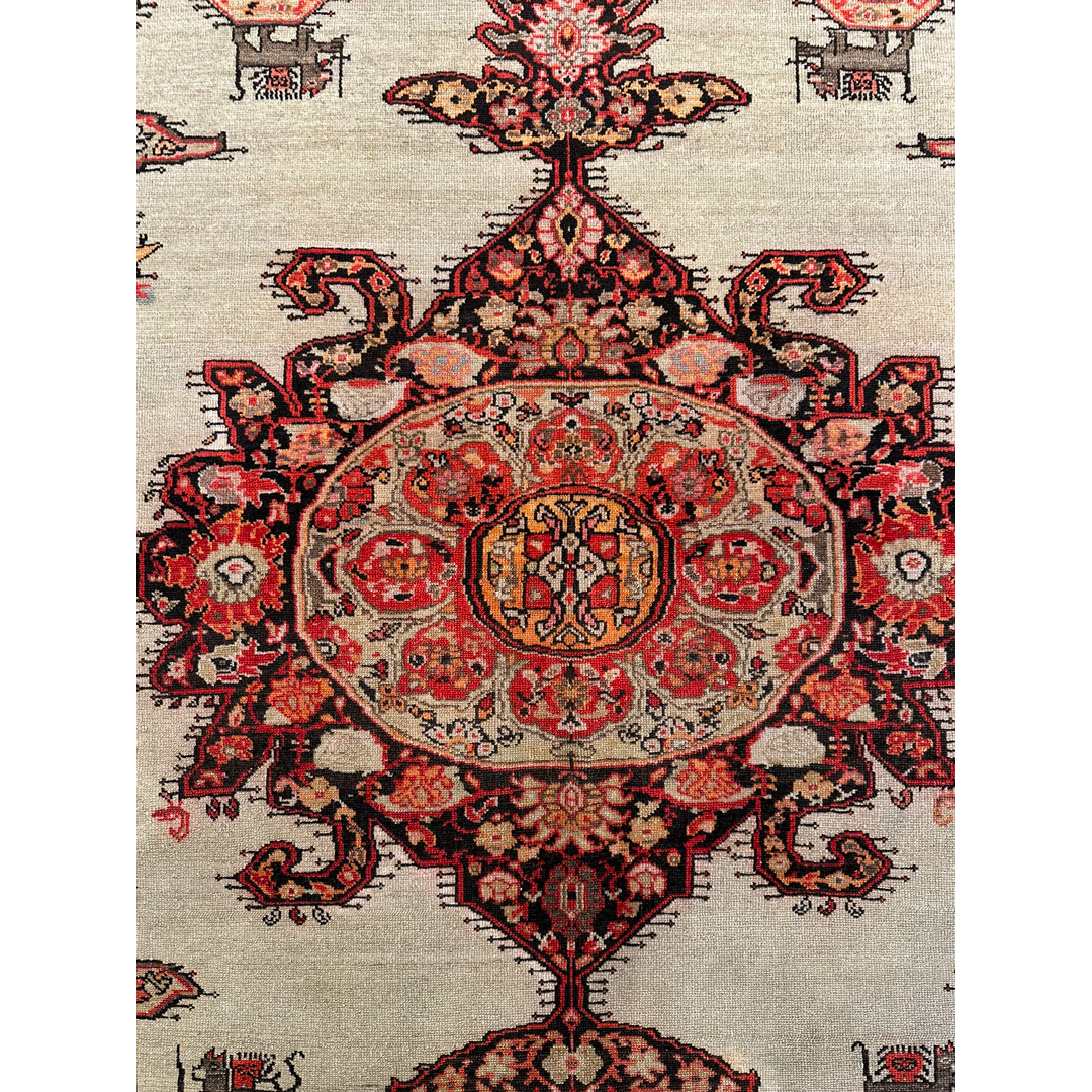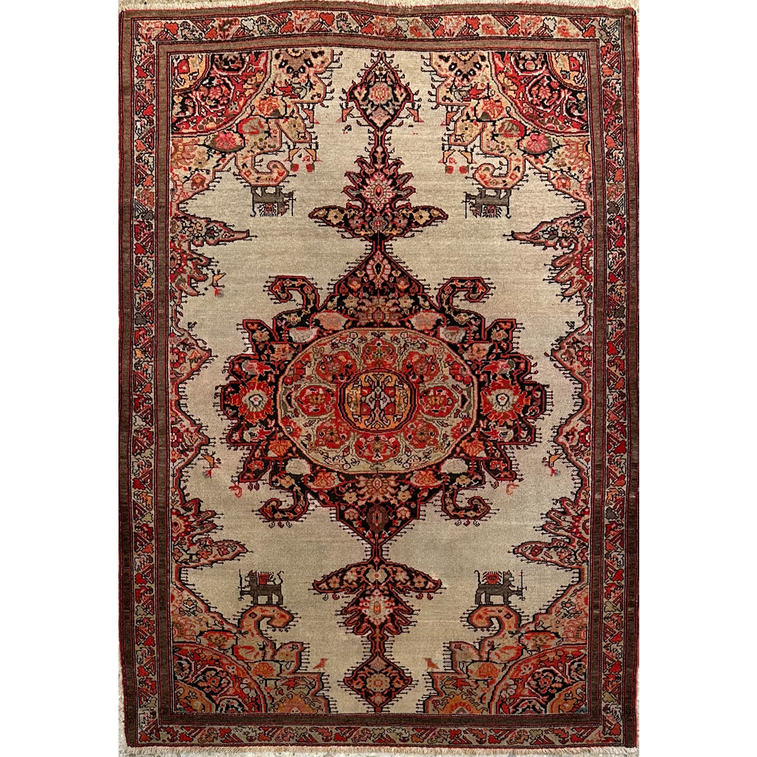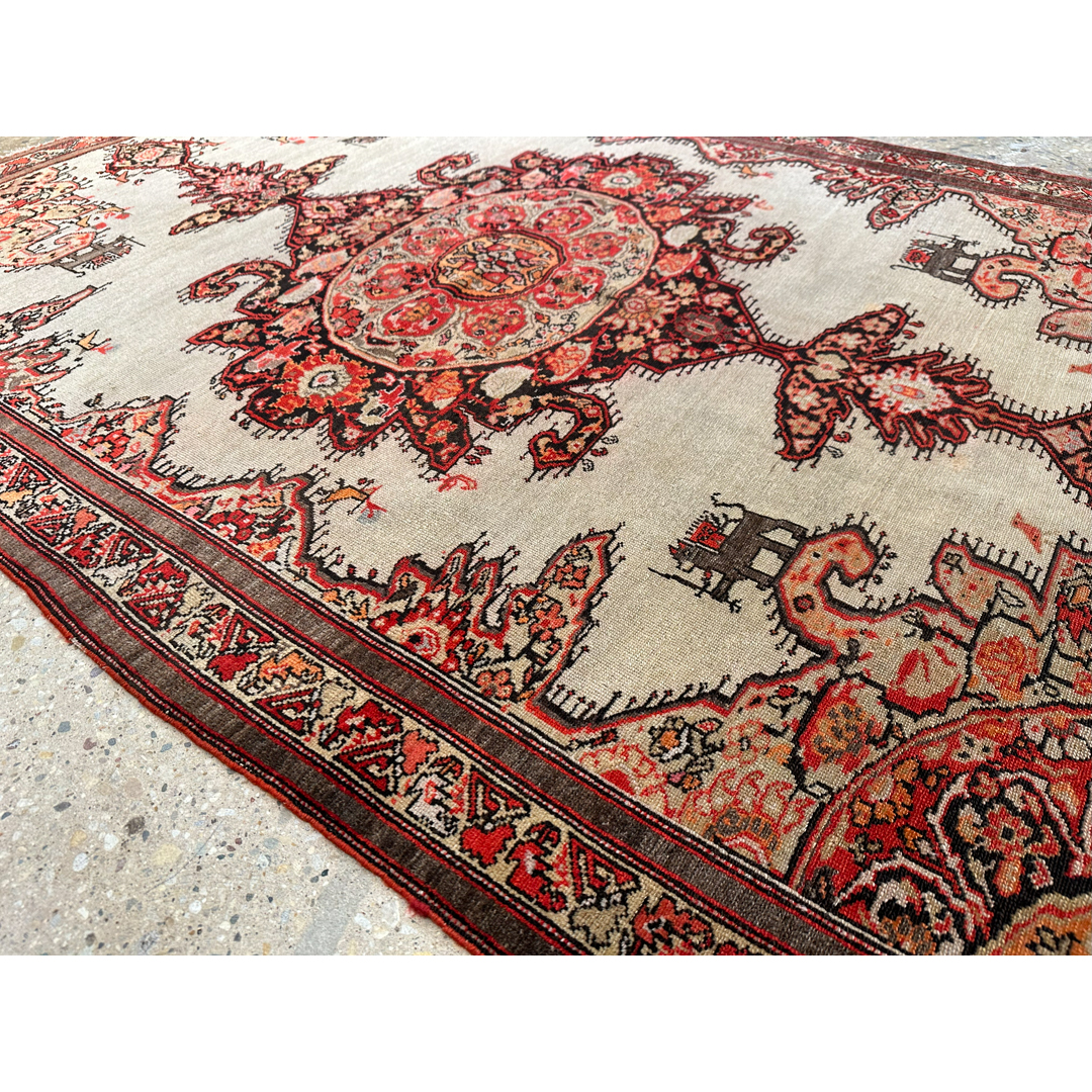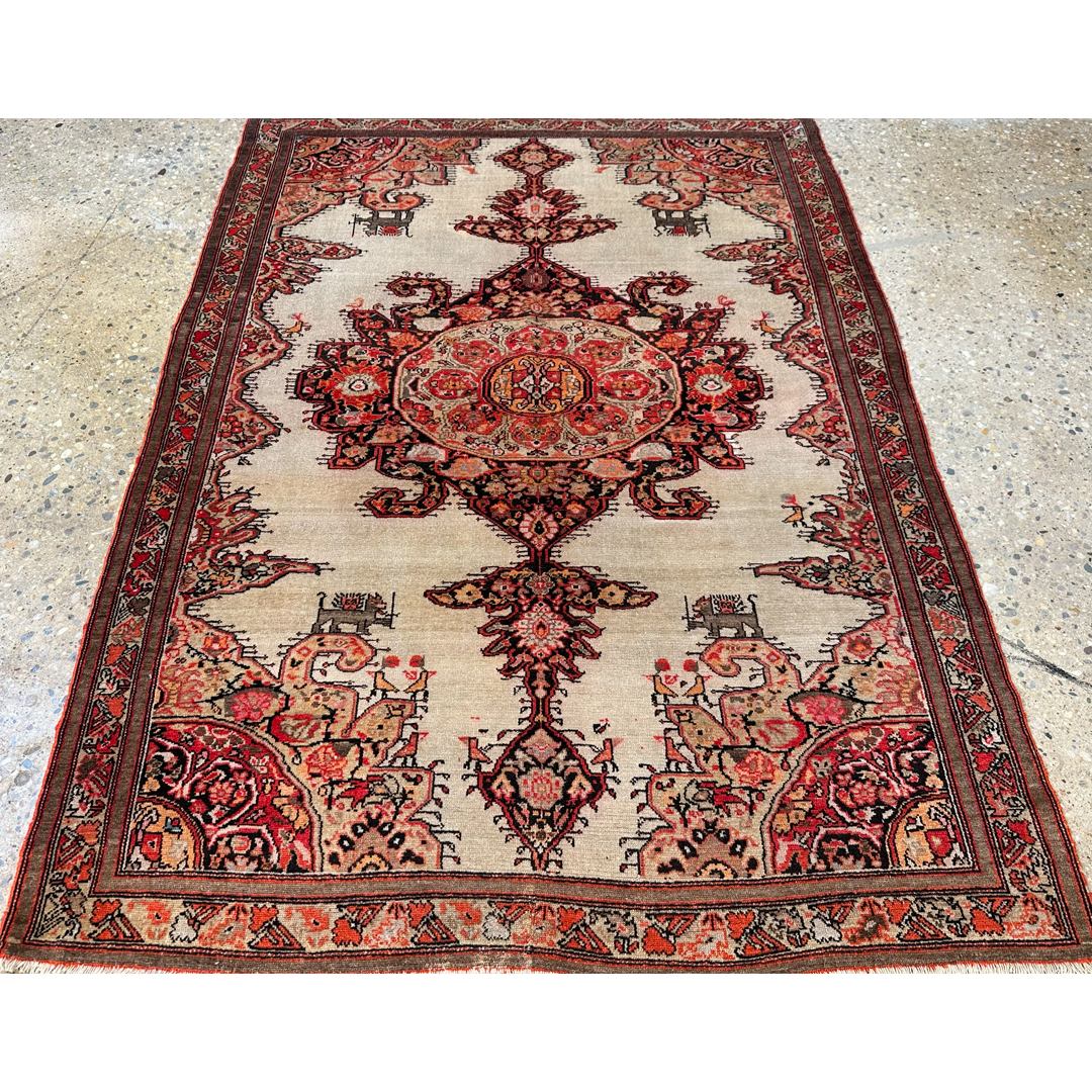 Secure a truly unique piece of textile art with this Mission 4’5″ x 6’2″ ft. antique Persian Malayer rug. Hand-knotted in the 1880s, this collector’s item features a striking high-contrast design set against a rare, open sandy-beige field. The composition is dominated by a massive, ornate central medallion and matching corner spandrels rendered in rich shades of rust-red, burnt orange, and deep charcoal. A delightful and rare detail includes small, stylized animal figures flanking the central axis, adding a whimsical touch to the formal layout. Framed by a warm rust border with an intricate vine meander, this historic rug offers a captivating blend of village charm and sophisticated design, perfect for a private library or distinctive entryway.
