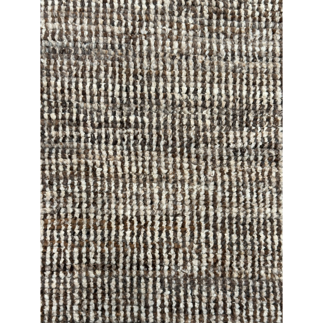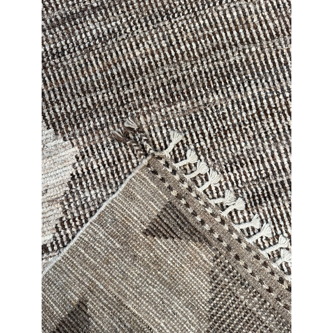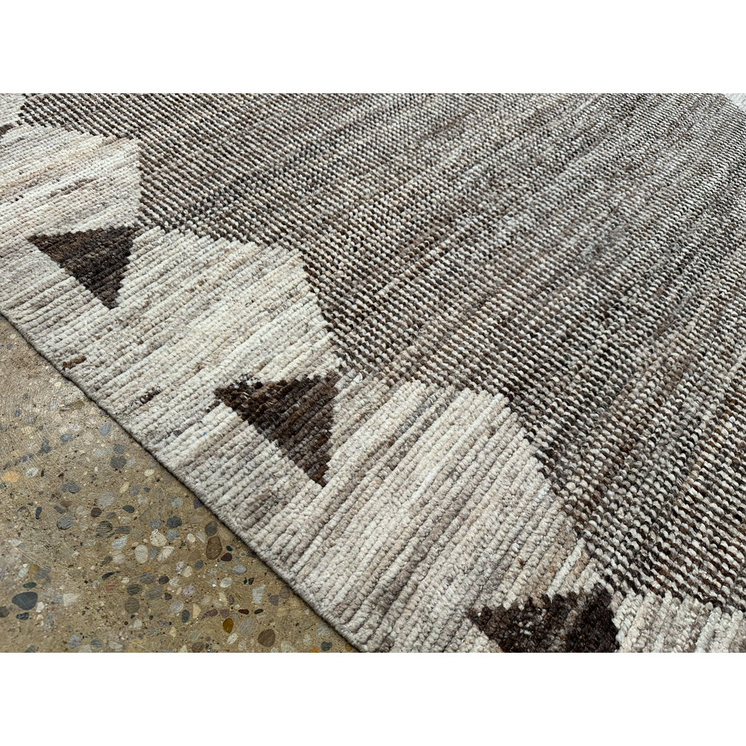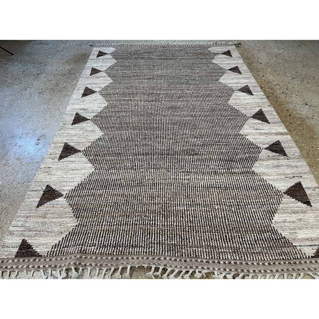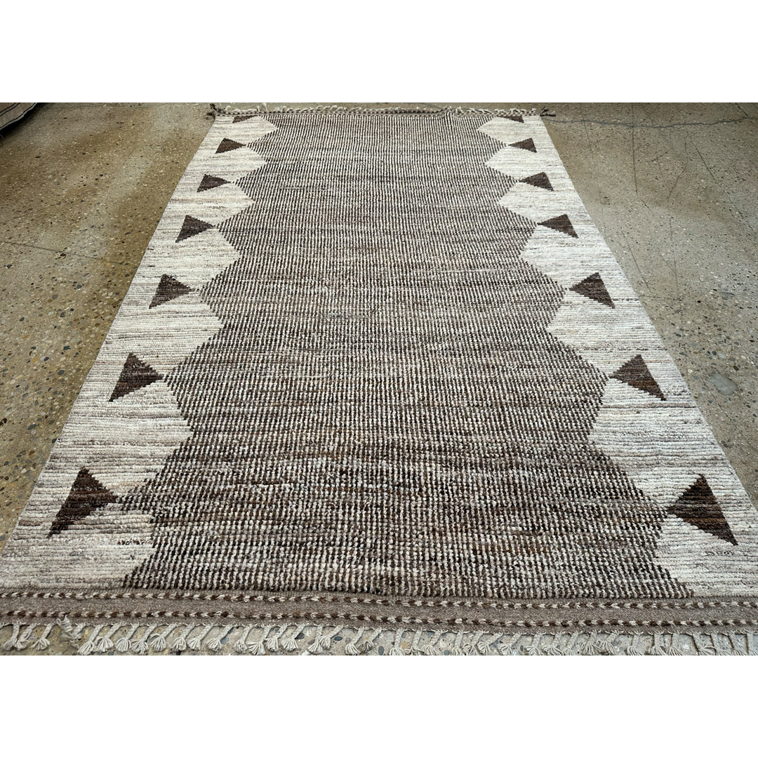 Make a bold statement in bohemian tribal design with this striking Moroccan-style rug, skillfully crafted by Afghan artisans. Its captivating and symmetrical design features a heathered, textural central field dramatically framed by a series of large, inward-pointing triangles, evoking the powerful symbology of traditional Berber textiles. Rendered in a sophisticated and earthy palette of deep charcoal-brown and creamy off-white, its low-profile, handwoven texture enhances the rug’s clean, graphic lines and artisanal quality. Measuring 6’2″ x 9’9″, this distinctive wool rug is perfect for anchoring a living room, dining area, or entryway, infusing the space with a unique blend of minimalist style and timeless tribal artistry.