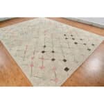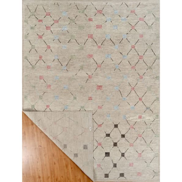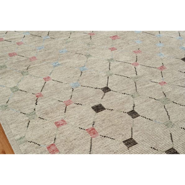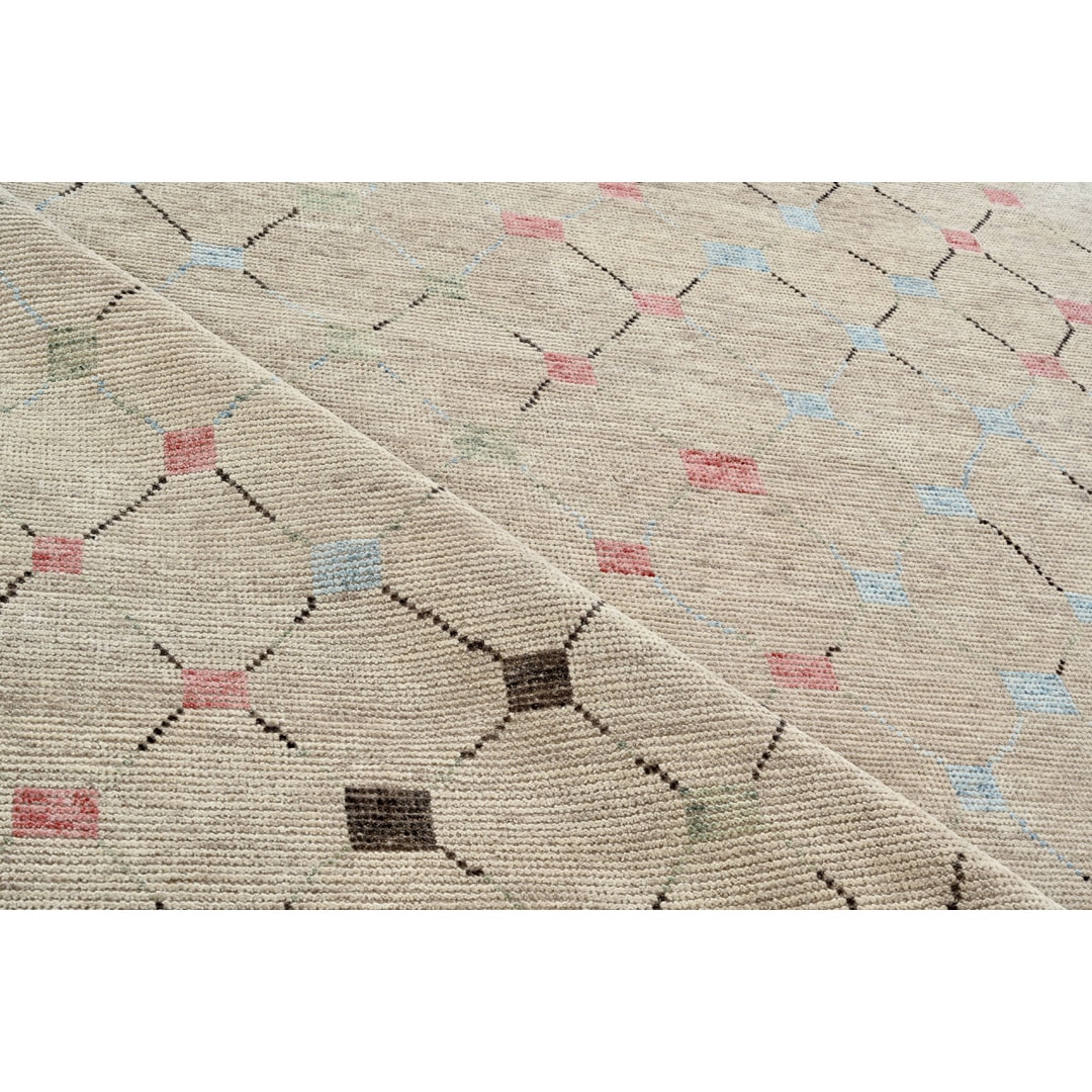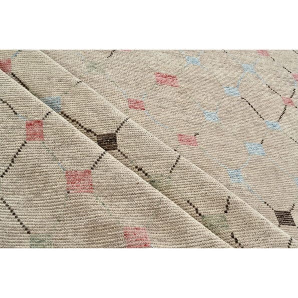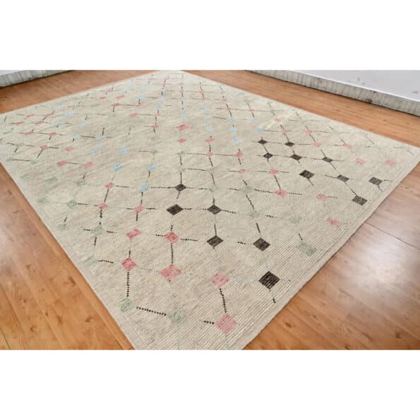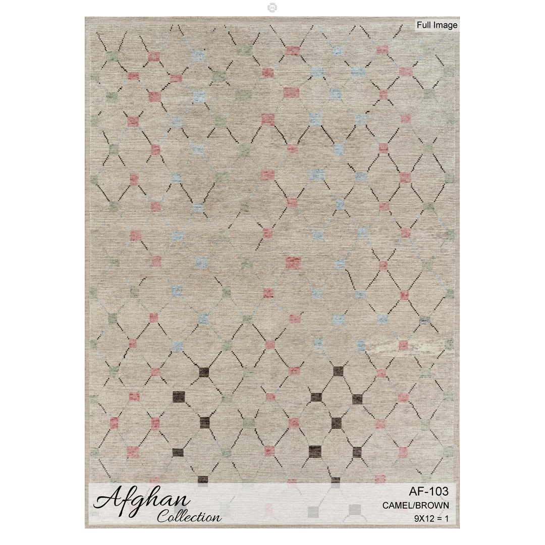 Introduce a touch of playful sophistication to your space with this modern geometric rug from the Afghan Collection. Measuring 9’2″ x 12’1″ ft., this 9×12 area rug features a clean and contemporary diamond lattice Moroccan pattern set against a warm and inviting camel brown field. What makes this design truly special are the charming, colorful accents—small squares of soft pink, serene sky blue, and deep charcoal are playfully placed at the intersections of the trellis, adding a subtle burst of personality. Expertly hand-knotted, its durable wool pile offers a comfortable texture underfoot. Perfect for a modern living room, a creative office, or a stylish dining area, this rug’s versatile design and neutral base make it an easy and elegant foundation for a variety of contemporary decor styles.