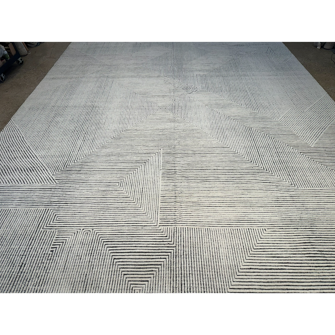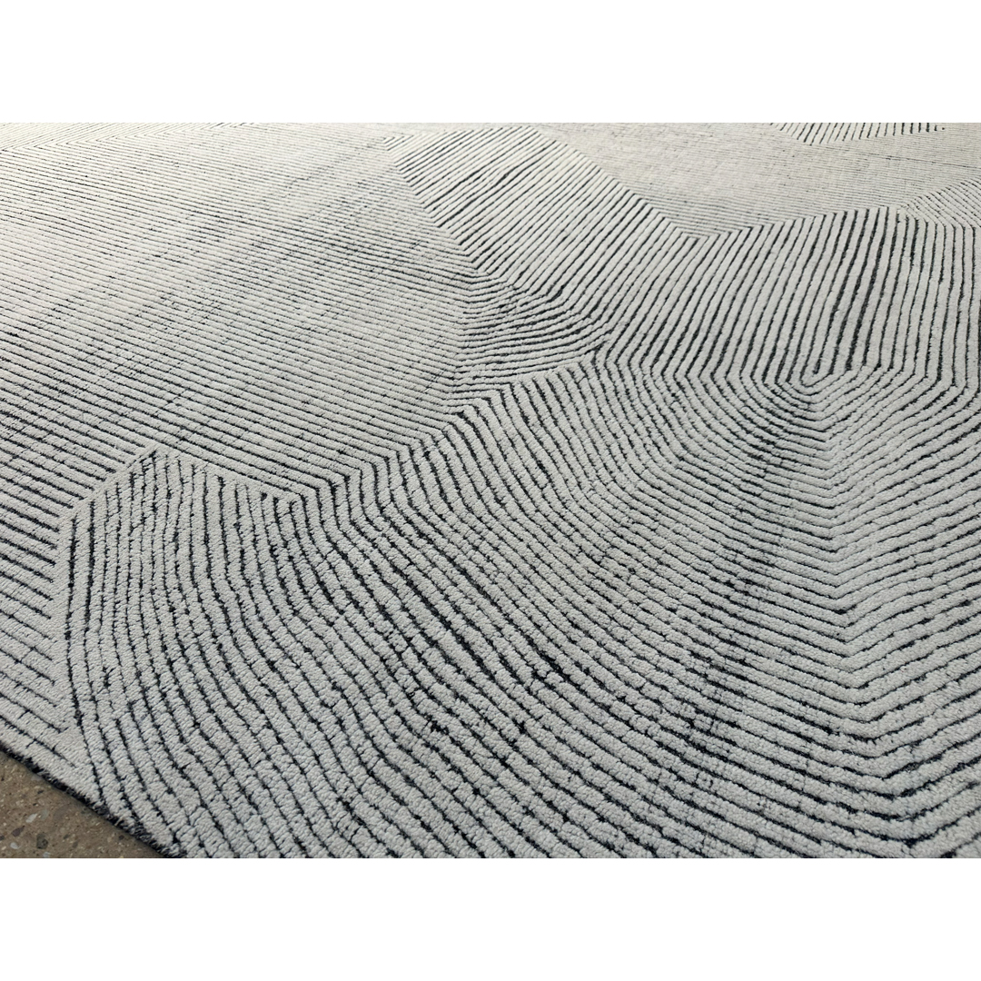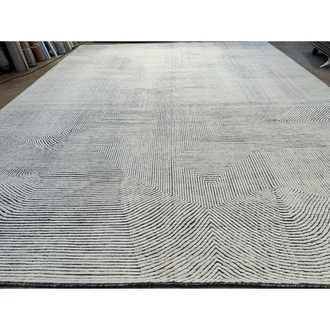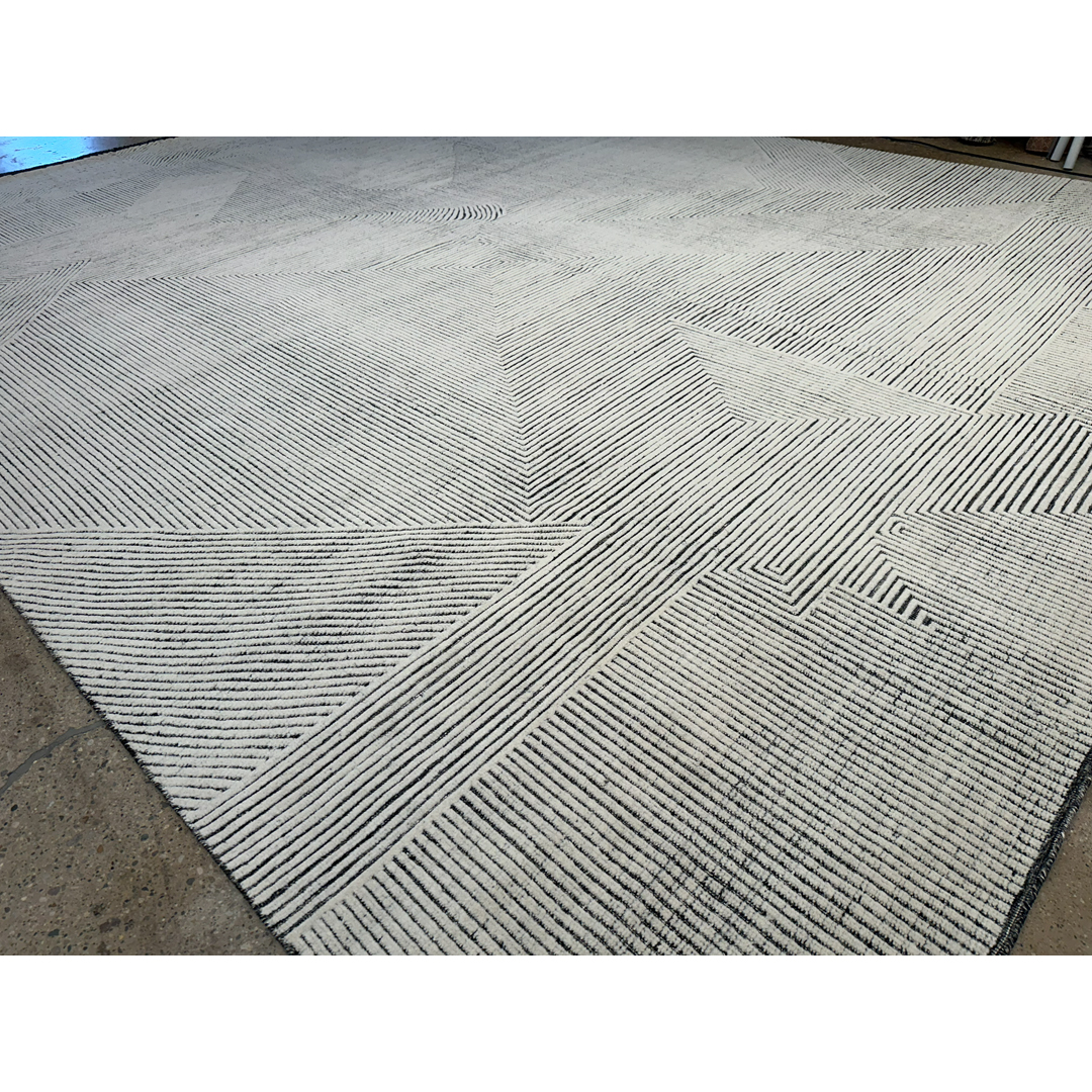 Measuring a massive 14’1″ by 18′ feet, this hand-knotted modern rug provides a striking, highly textured foundation for contemporary residential projects. Moving away from traditional motifs entirely, the layout relies on a bold, continuous linear pattern that creates a dynamic, architectural sense of movement, reminiscent of topographical maps or modernist geometric linework. This intricate, maze-like geometry is executed in a crisp, high-contrast color palette, featuring dark charcoal ridges raised against a luminous ivory and pale grey background. Constructed with a distinctively ribbed, textural pile, the rug offers exceptional depth and a highly tactile surface. By combining this graphic, large-scale modern pattern with a sophisticated, neutral color story, this piece achieves a highly adaptable, gallery-quality aesthetic that still feels cozy and organic.