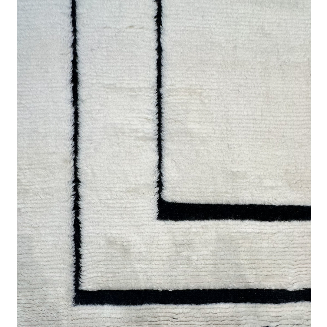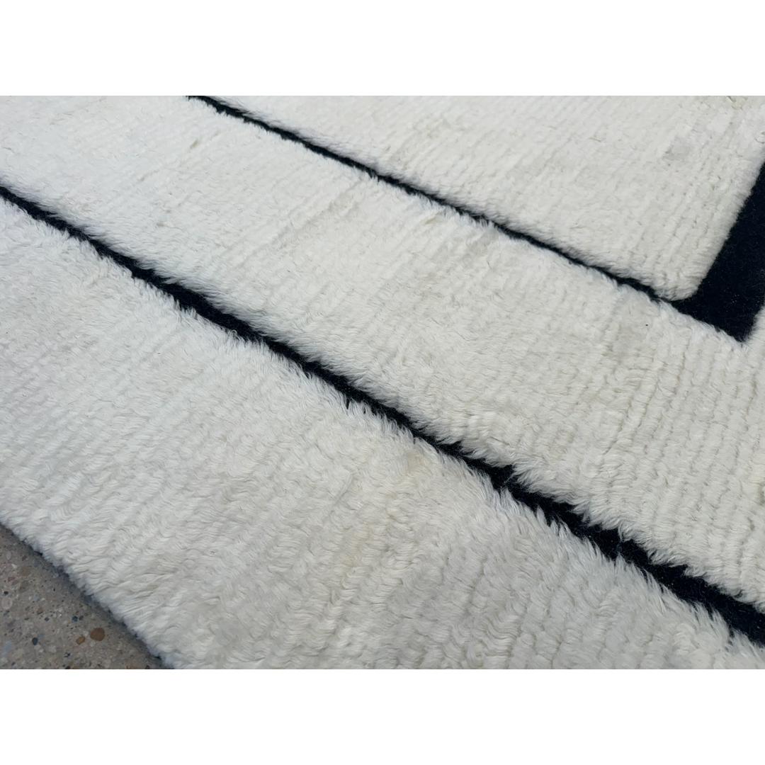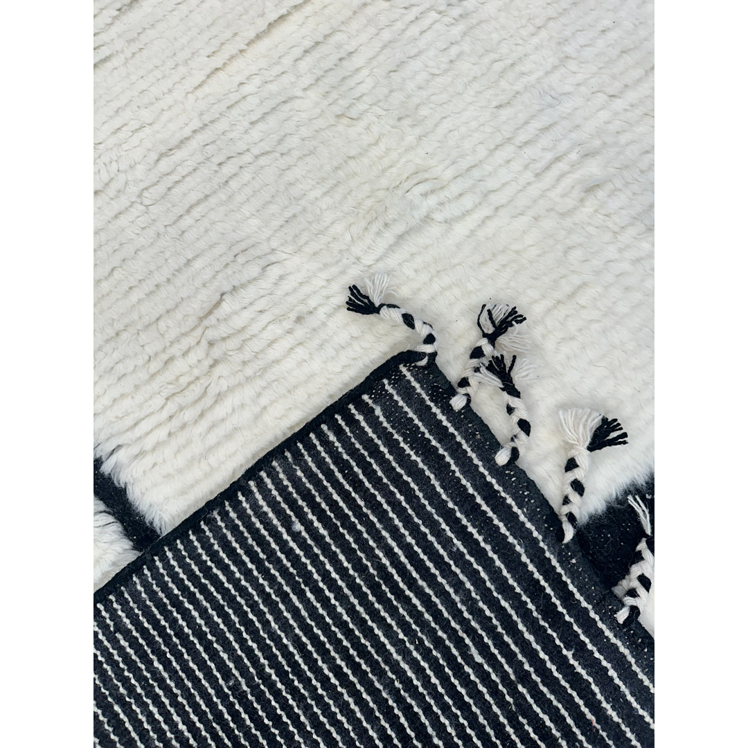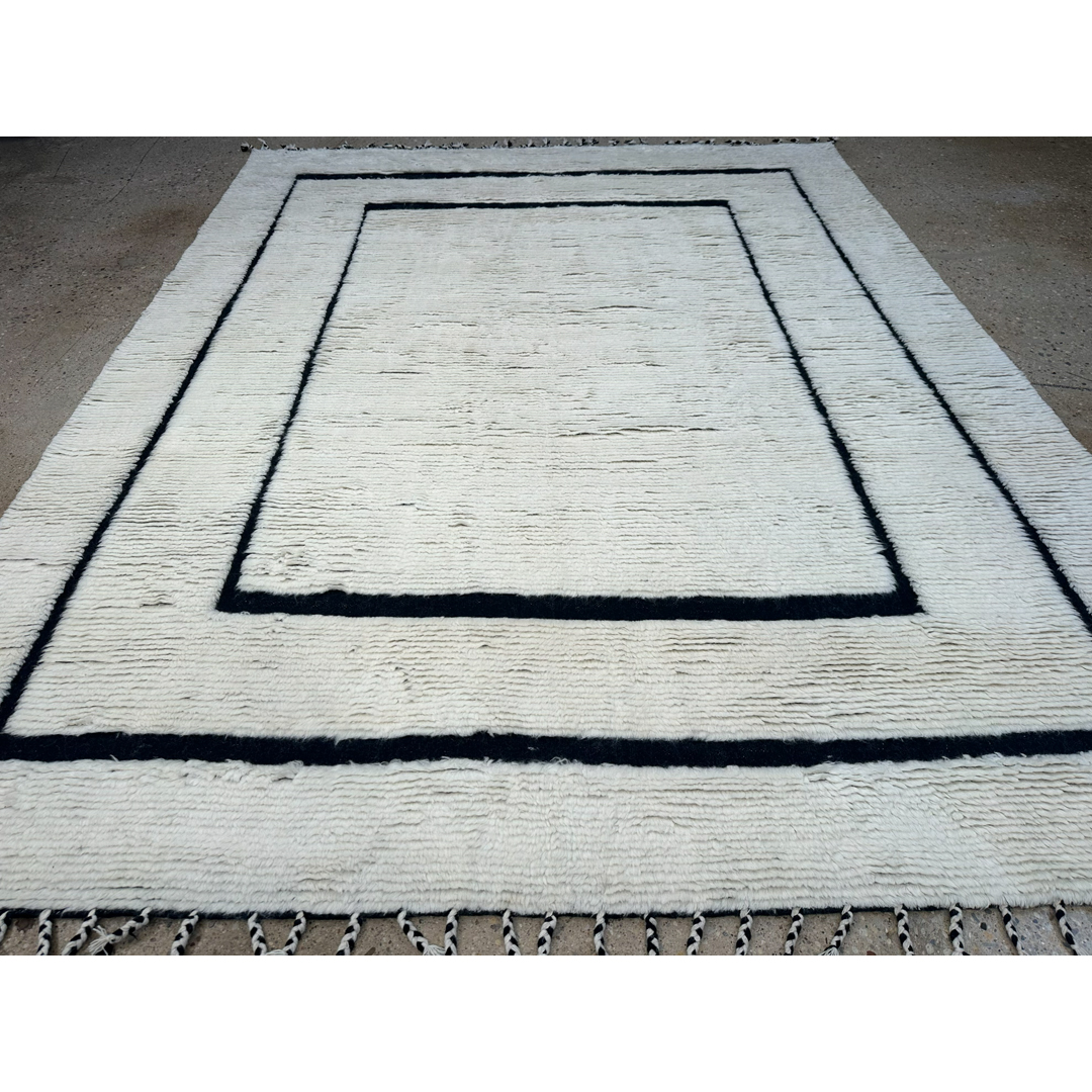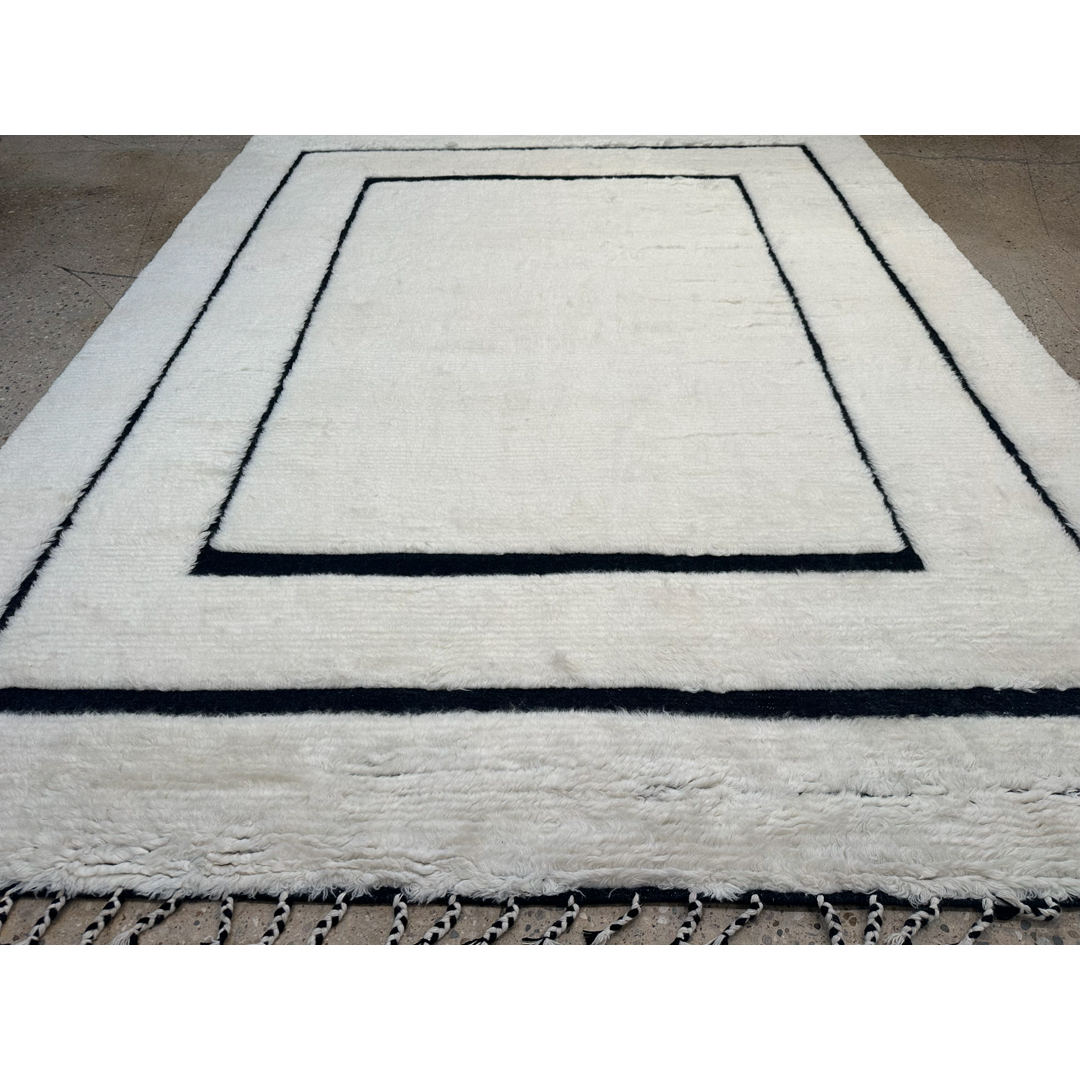 Anchor your home in bold, minimalist style with this stunning Bohemian Moroccan area rug. Measuring 9’4″ x 12′ ft., this 9×12 rug is a masterpiece of modern simplicity. Its serene, creamy ivory field provides a bright and expansive canvas, dramatically framed by a powerful, graphic double border of two concentric rectangles in a deep, contrasting black. Expertly crafted with a luxurious, plush wool pile, this rug is incredibly soft and inviting underfoot, while traditional braided fringe at each end adds a touch of authentic tribal character. This is the perfect foundation for a minimalist, Scandinavian, or contemporary living room, offering a clean, architectural statement that is both cozy and chic.