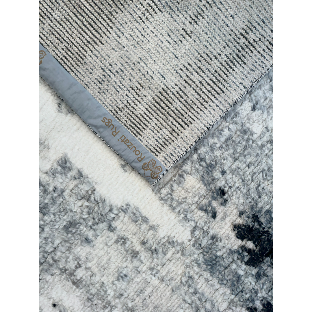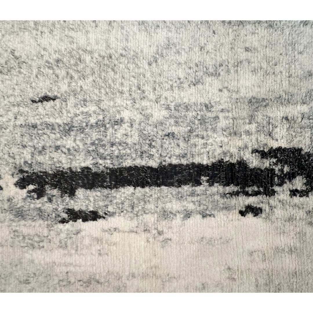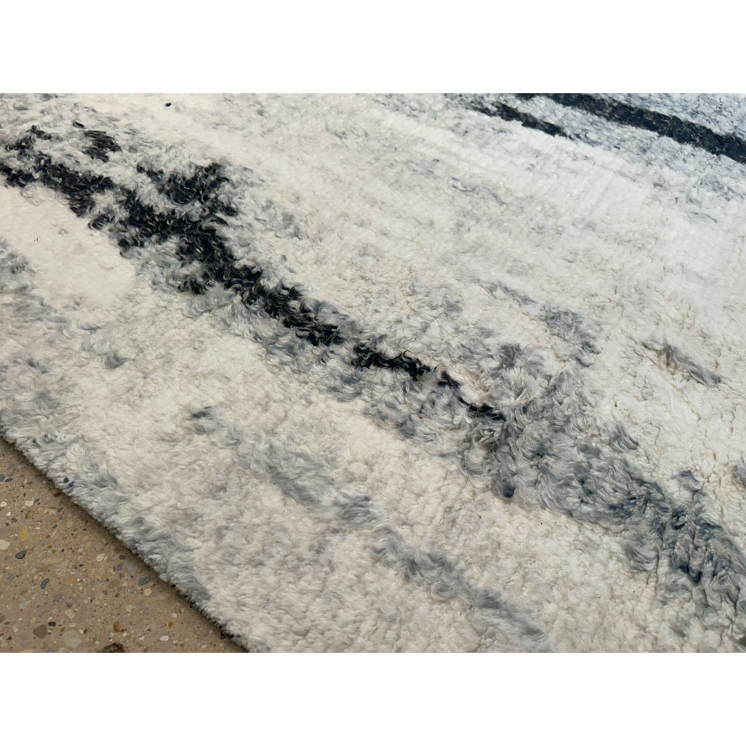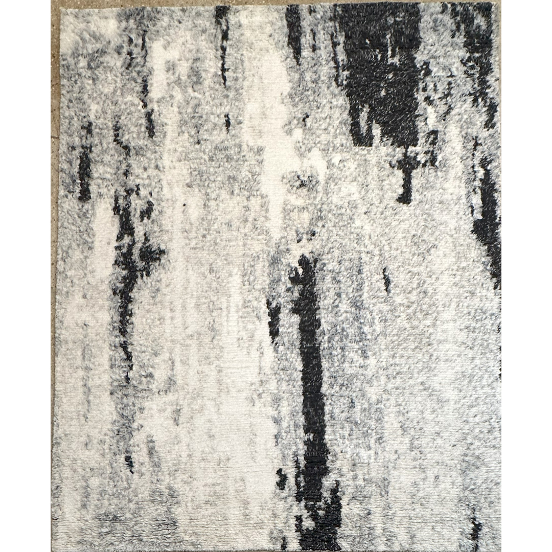 Bring woven abstract expressionism into your home with this striking contemporary rug. The design evokes the visceral energy of a modern canvas or the organic, high-contrast texture of silver birch bark. It features bold, vertical striations of deep charcoal and stark black that appear to bleed and scrape organically across a luminous, multi-tonal field of icy silver, frost, and soft ivory. The borderless composition allows this dramatic “painting” to extend to the very edges, creating an expansive, gallery-worthy aesthetic. What truly sets this piece apart is its luxurious, heavy shag pile. Woven with thick, premium wool, the deep, plush texture softens the stark, graphic intensity of the black-and-white palette, bringing an incredible sense of warmth and tactile indulgence to the room. With its versatile 8′ x 9’11” ft. dimensions and ultra-cozy underfoot experience, this rug is the perfect statement piece for a minimalist loft, a sleek monochromatic master suite, or an upscale contemporary lounge area that craves both edge and comfort.