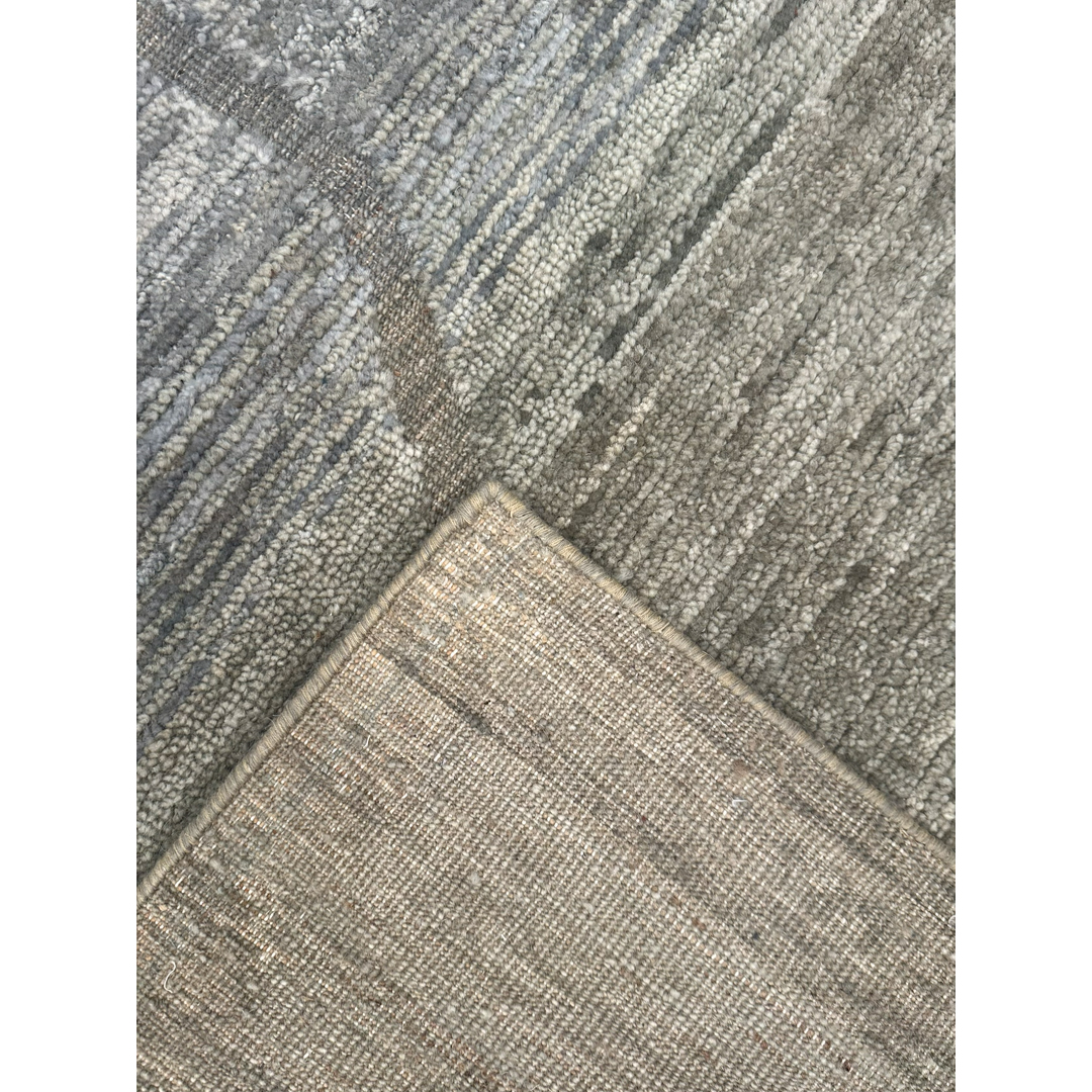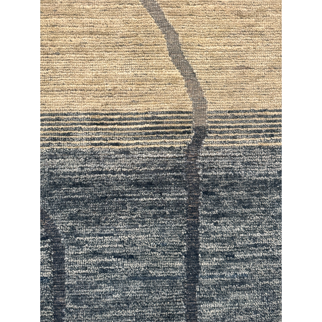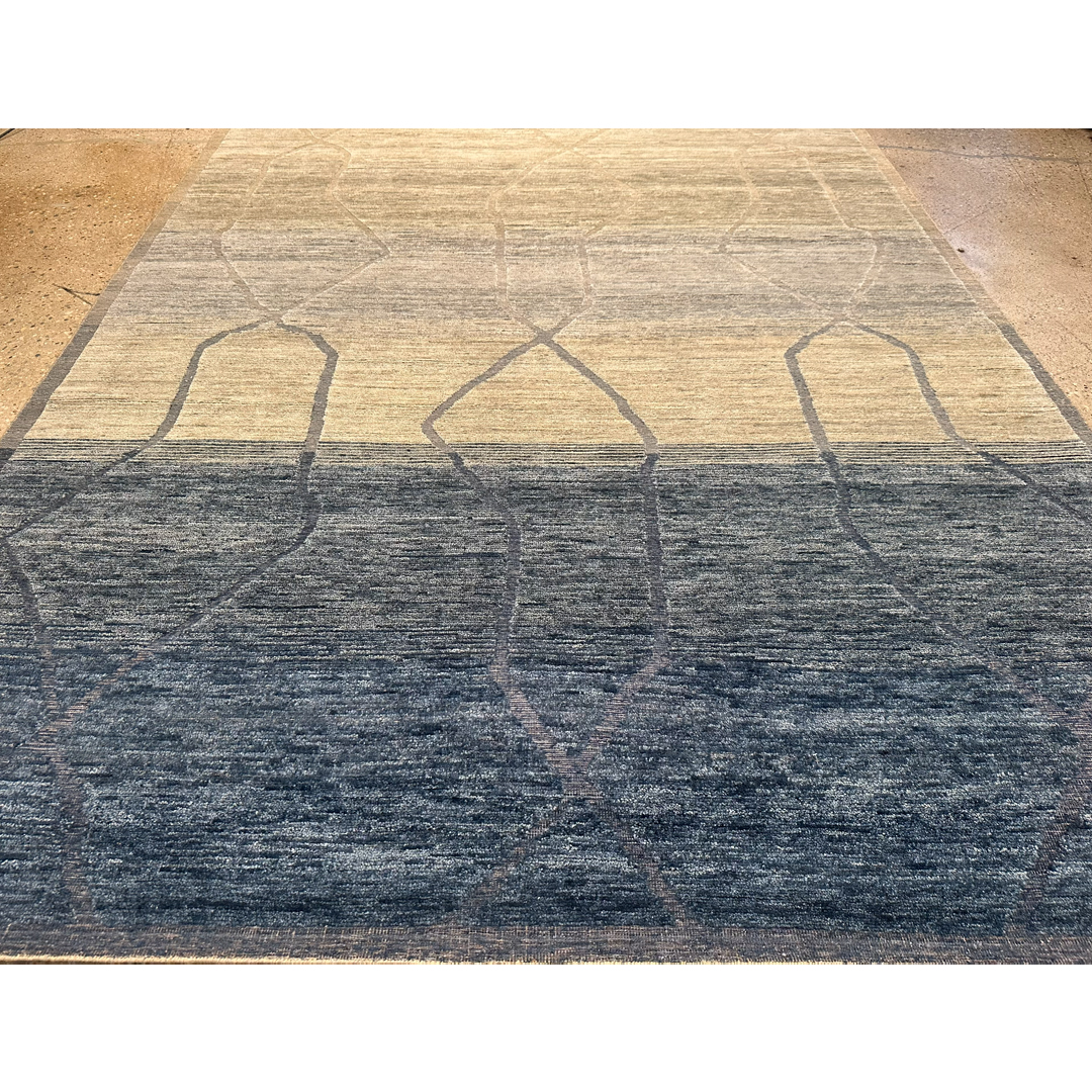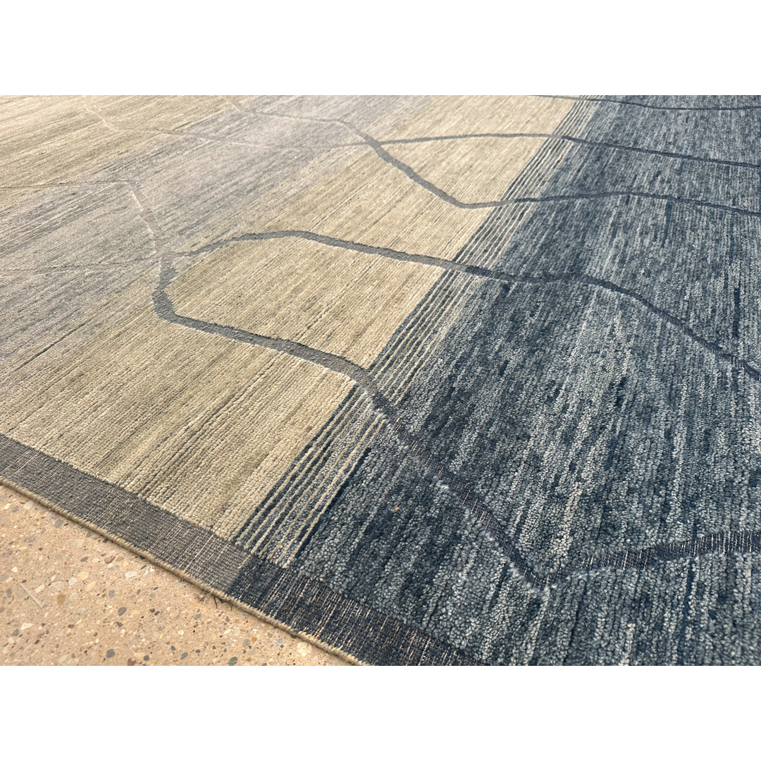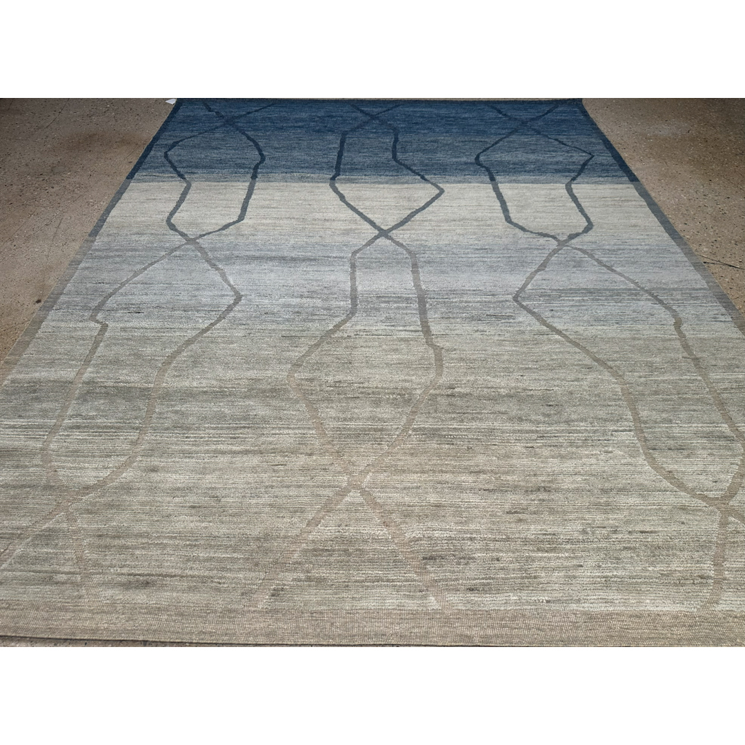 Evoking the serene beauty of a coastal horizon, this hand-knotted Indian rug is a masterpiece of modern color theory. The field features a dramatic, masterfully executed abrash effect that transitions from a soft dusty green to a profound, oceanic indigo as it is unrolled.