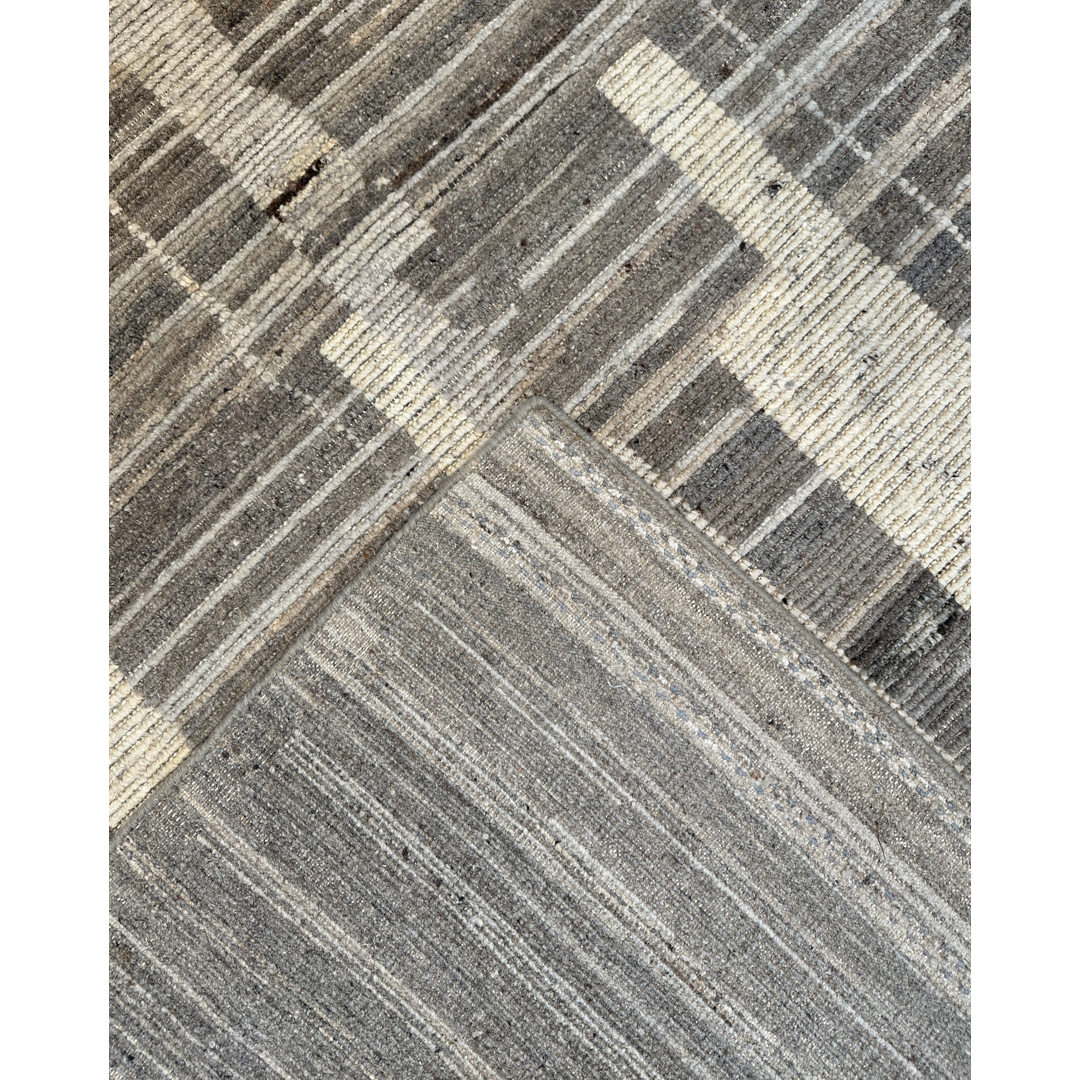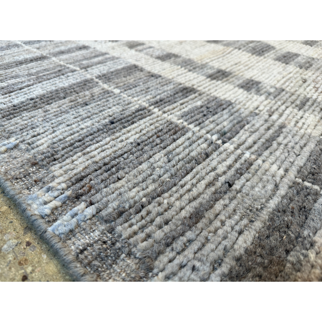 This hand-knotted piece is a striking study in texture and abstract geometry, blending Moroccan tribal inspiration with a sophisticated modern aesthetic. The field features a rhythmic series of horizontal linear bands in variegated tones of slate grey, charcoal, and warm taupe. These tonal registers are interrupted by bold, vertical ivory “drip” motifs and staggered block patterns that create a sense of architectural movement and high-contrast visual depth. Woven with premium, hand-spun Afghan wool, the rug possesses an organic, matte finish and a dense, durable pile. The natural color variegation, or “abrash,” throughout the grey-toned field emphasizes its artisanal origin and provides a grounded, earthy feel. Its substantial dimensions and neutral, graphic palette make it an ideal foundation for industrial lofts, minimalist contemporary spaces, or upscale urban interiors.