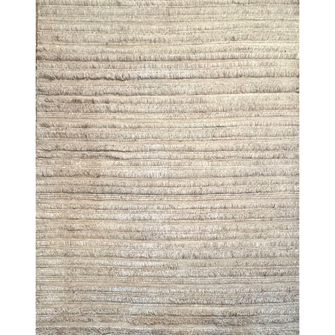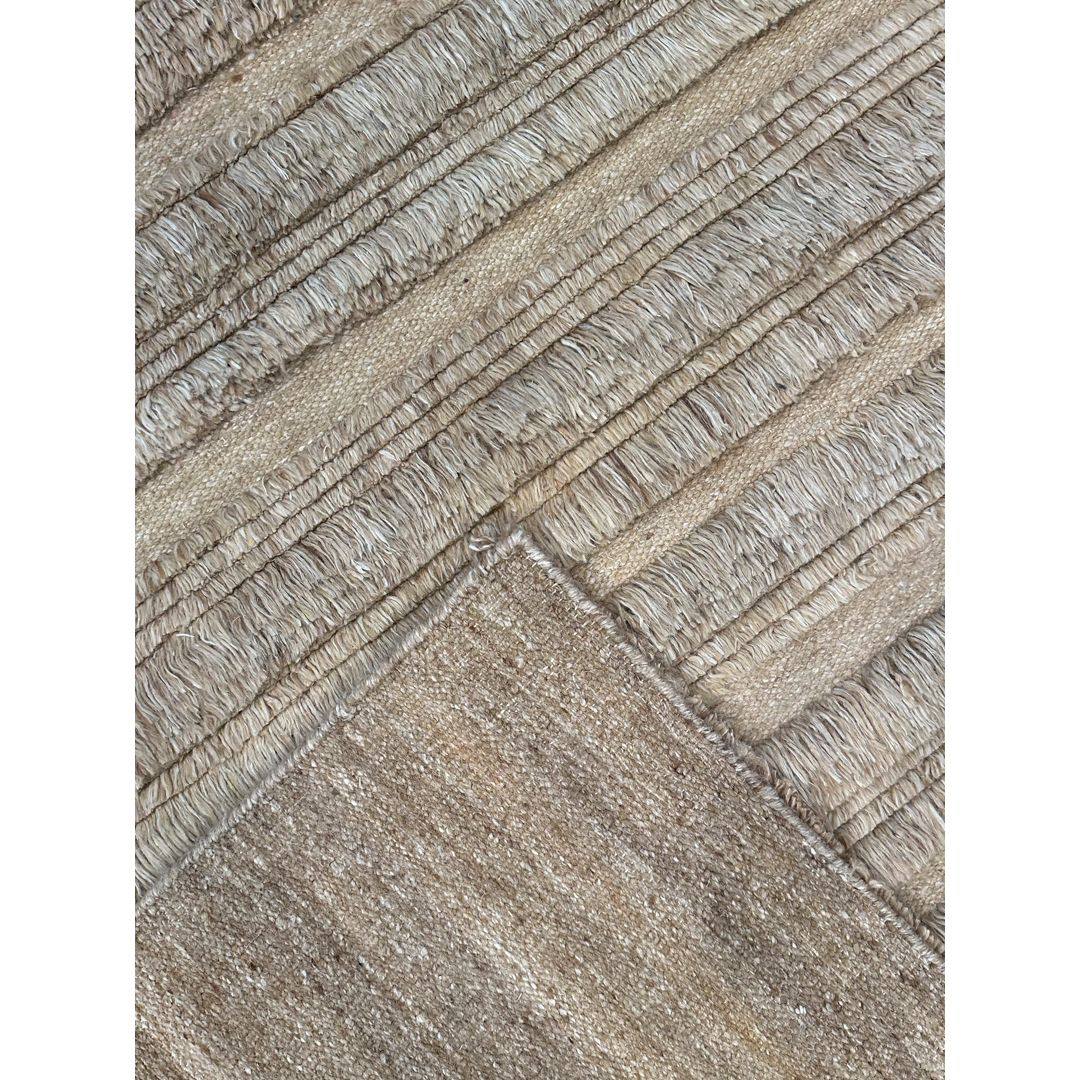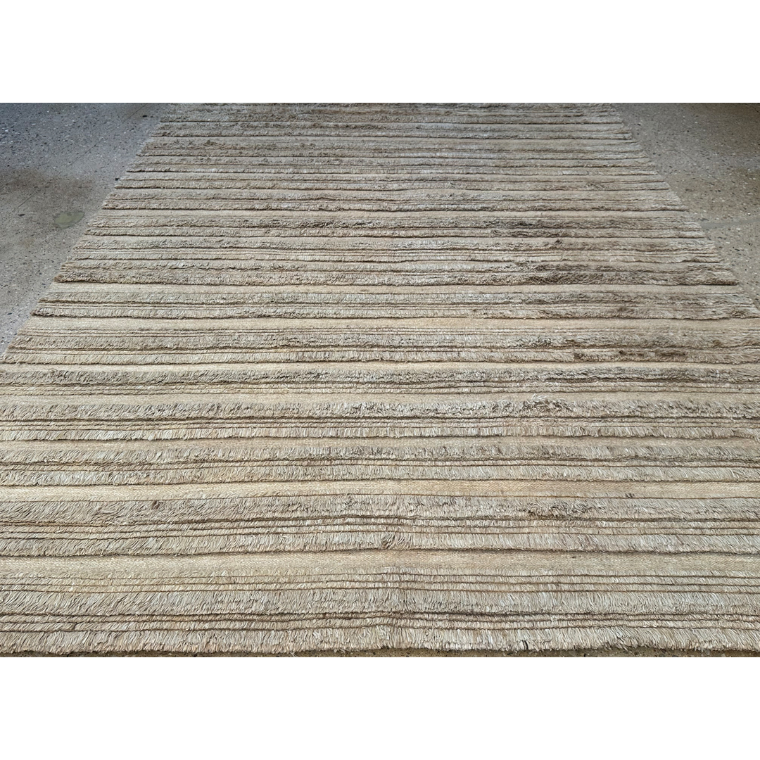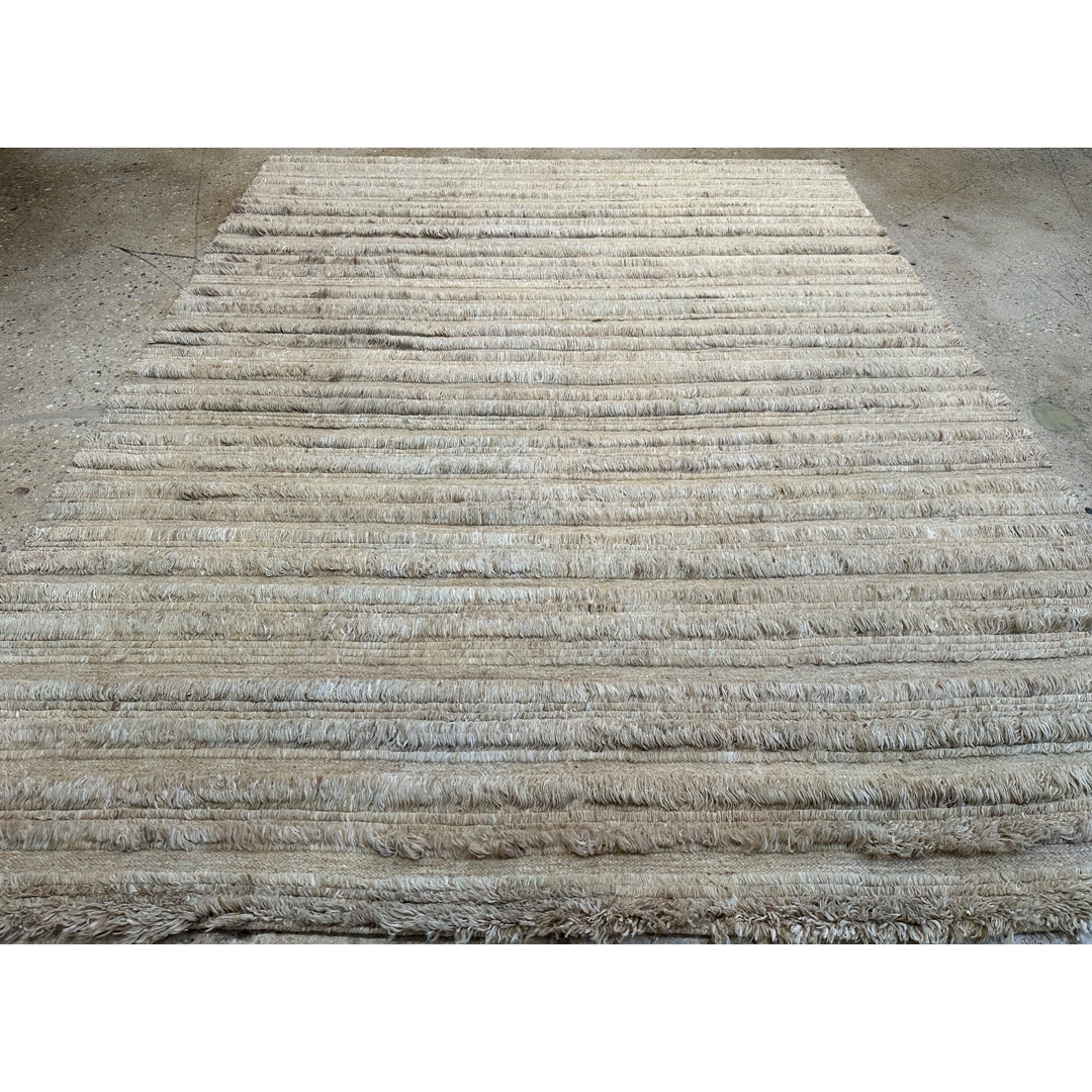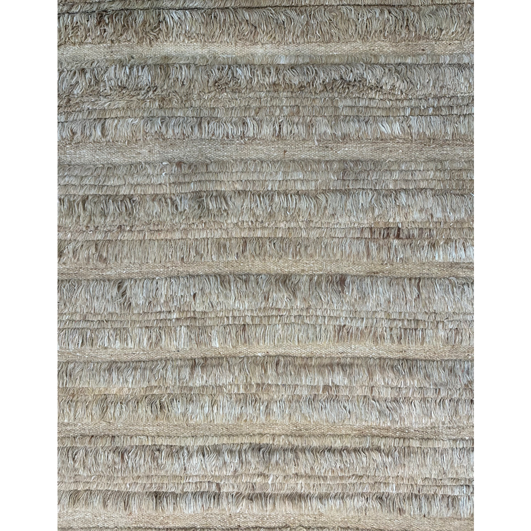 Anchoring your space with organic warmth, this 8 x 10 ft. rug reimagines tribal design with a sophisticated, monochromatic approach. The piece, woven in India, features a lush shag pile crafted in soothing tones of sandy beige and oatmeal, creating a neutral foundation that brightens a room while maintaining a cozy atmosphere. Its defining characteristic is the textured, horizontal striations that run across the surface, adding architectural interest and a rhythmic visual flow without the need for contrasting colors. This varying pile height offers a luxurious, tactile sensation underfoot, making it an ideal choice for bedrooms or living areas where comfort is paramount. With its blend of modern minimalism and rustic charm, this floor covering effortlessly complements aesthetics ranging from Scandinavian to desert modern.