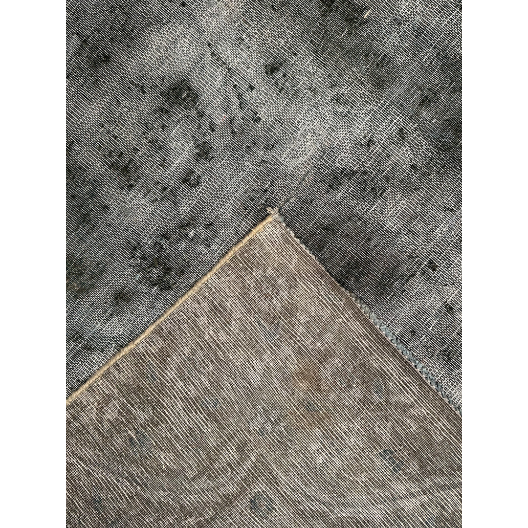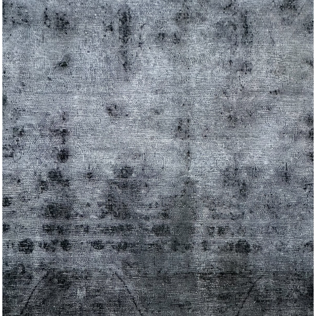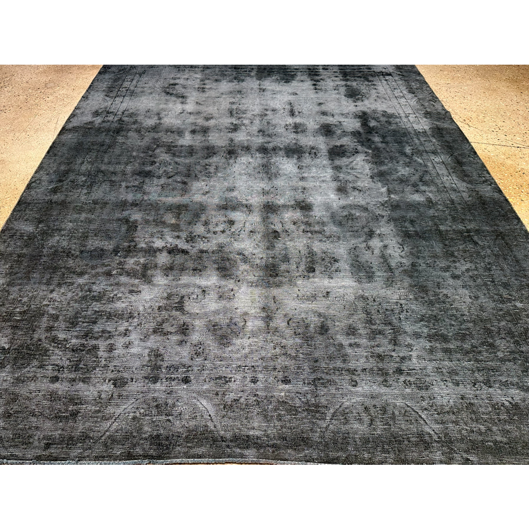Measuring approximately 9 by 12 feet, this vintage Persian area rug provides a highly tailored, moody foundation for contemporary residential projects. The rug has been expertly overdyed in Pakistan, transforming its original palette into a deep, tonal wash of charcoal, onyx, and slate grey, leaving behind only the faint “shadow” of its original traditional borders and interior geometry. This low-contrast, highly textural color story achieves a sophisticated “erased” aesthetic that interior designers frequently utilize to anchor sleek modern living spaces, dramatic dining rooms, or richly curated home libraries. Offering a polished and distinctively modern look, this piece pairs exceptionally well with polished concrete floors, rich leather upholstery, and bold metallic architectural finishes.