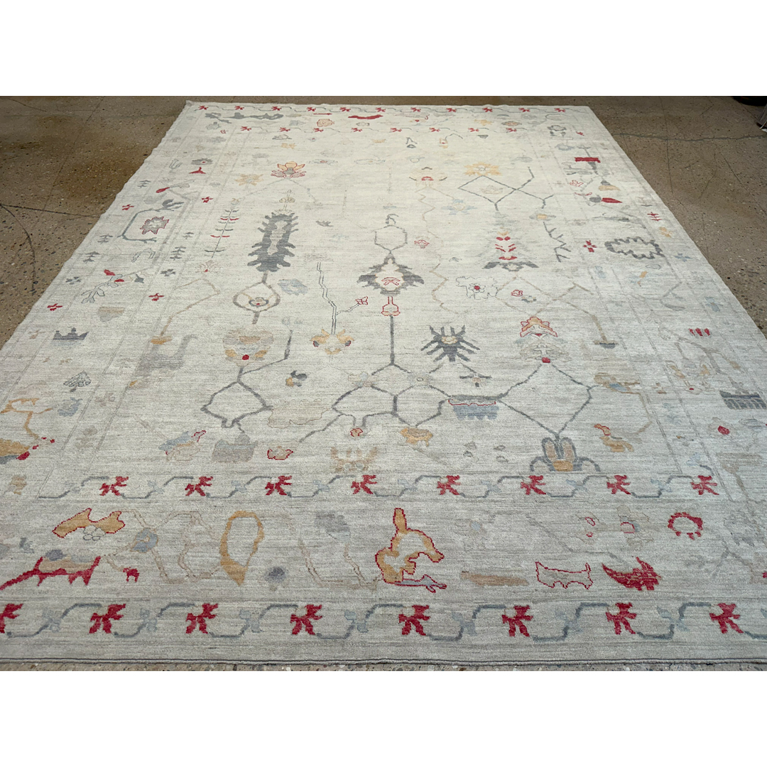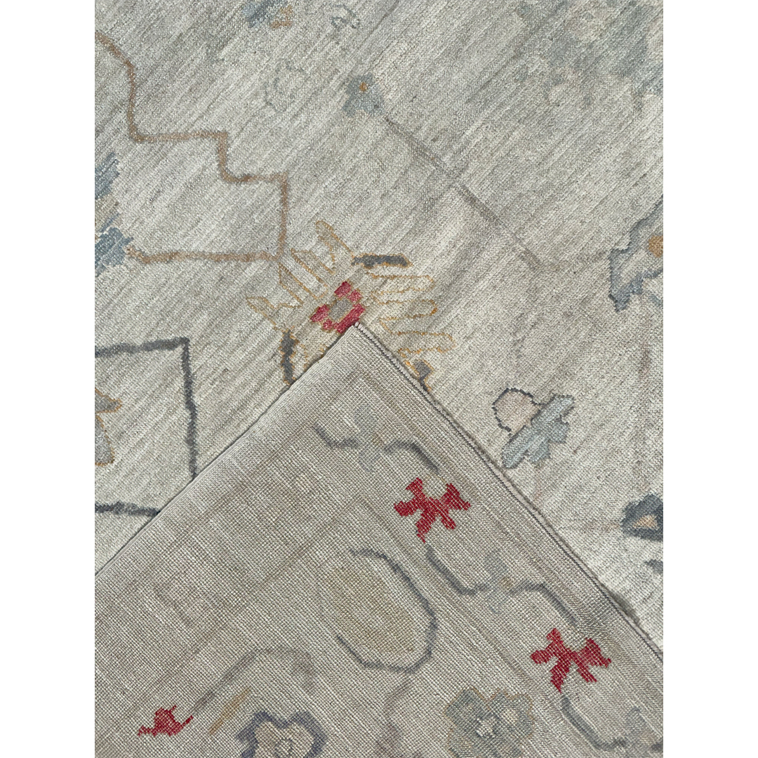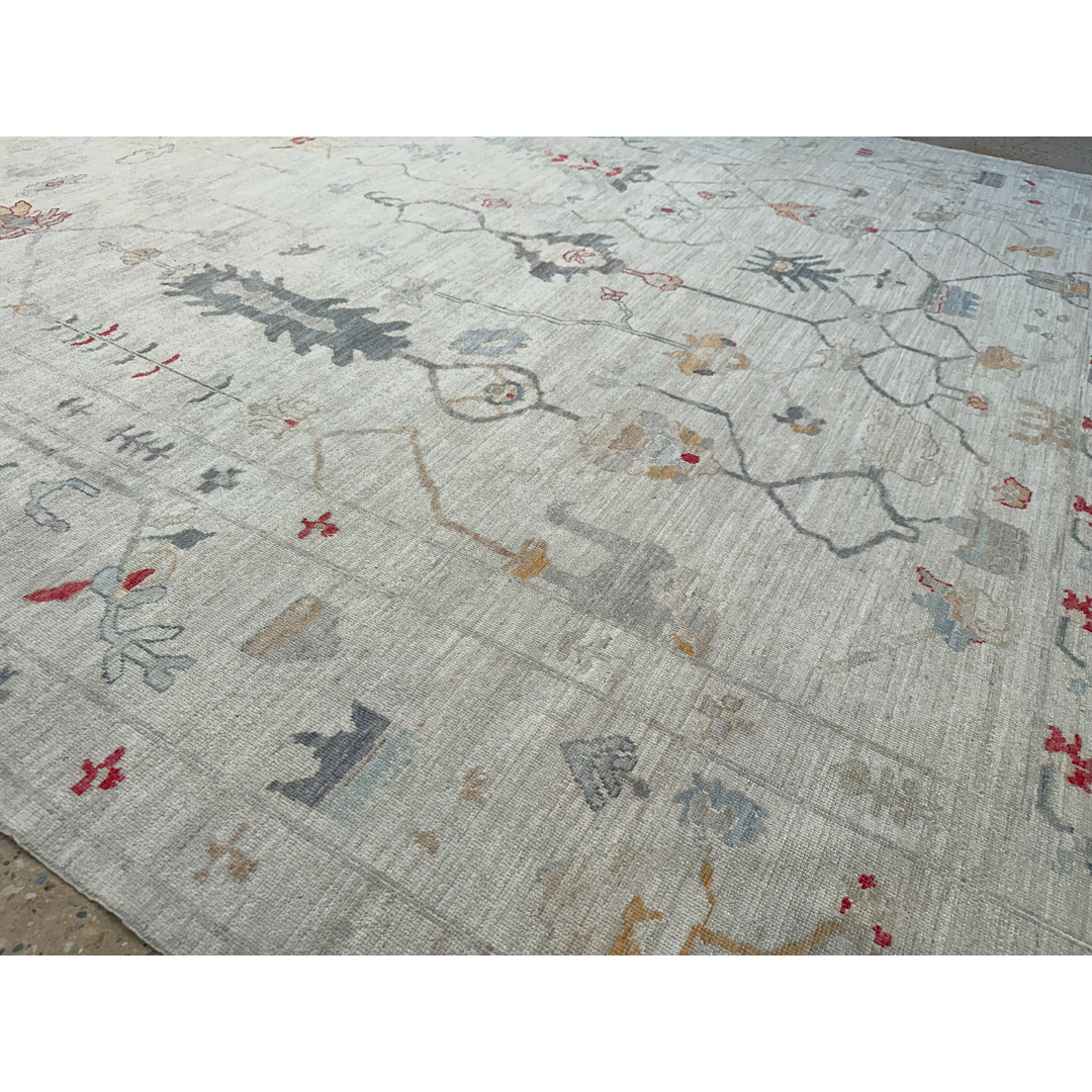 This fine hand-knotted Oushak rug features a sophisticated, open-field design that exemplifies the elegance of traditional Turkish artistry. Set against a luminous ivory and soft grey field, the composition showcases a rhythmic arrangement of stylized floral palmettes, geometric vines, and tribal charms. The motifs are rendered in an understated palette of slate blue, muted gold, and terracotta, providing delicate pops of color that remain serene and well-balanced.The design is framed by a broad, tonal primary border that echoes the botanical elements of the field, creating a sense of cohesive, architectural structure. Woven with high-quality wool and sheared to a soft, low pile, this rug offers a tactile richness and a beautiful matte finish. Its grand scale and refined transitional aesthetic make it an ideal centerpiece for a formal living room, a large dining area, or an upscale master suite.