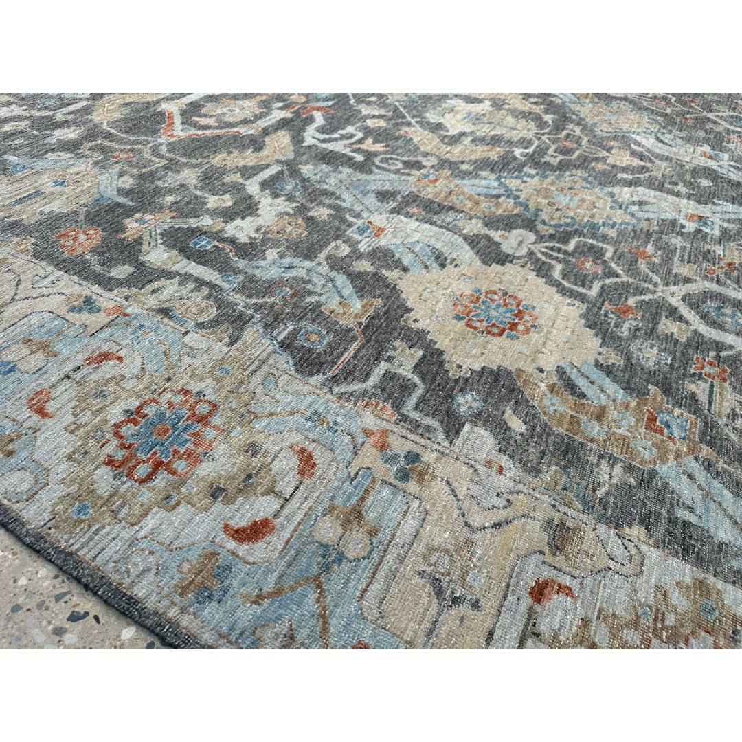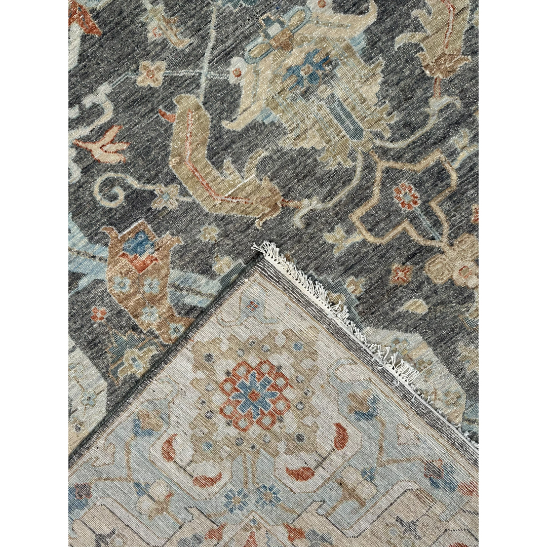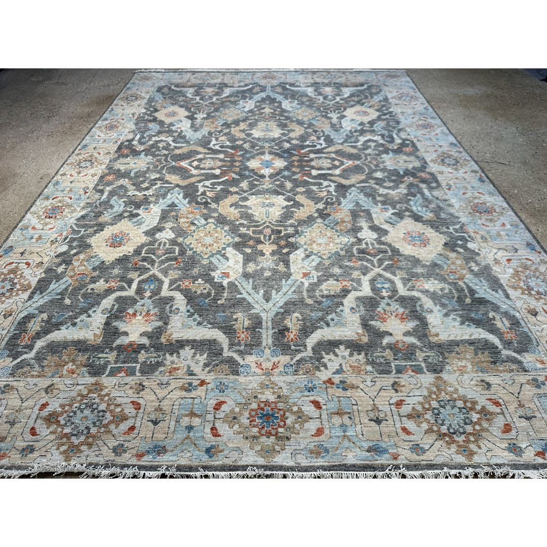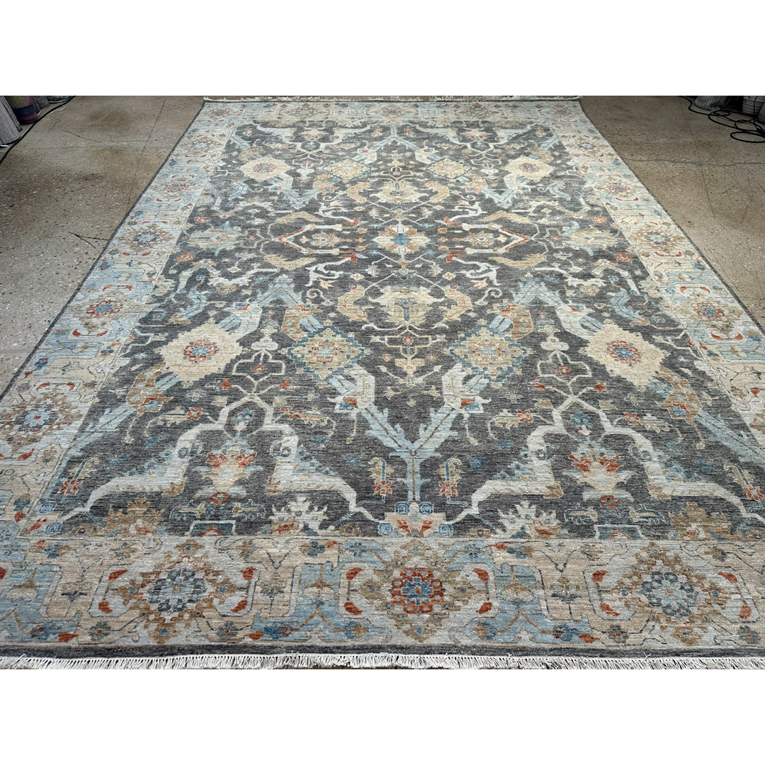 Anchor your grandest space with the Opulent Oushak, a magnificent Turkish design rug that exudes timeless sophistication. Measuring a generous 10’1″ x 14’3″ ft., this large 10×14 area rug features a dramatic, deep charcoal gray field. This rich backdrop is masterfully adorned with a classic, all-over pattern of large-scale, stylized palmettes and floral motifs, rendered in a sophisticated palette of creamy beige, golden ochre, soft blues, and hints of rust. The entire composition is elegantly framed by a wide, contrasting border in a soft, lighter gray, adding definition and balance. Expertly hand-knotted with a plush wool pile, this rug is the perfect foundation for a stately living room or formal dining area, offering a powerful statement of enduring elegance.