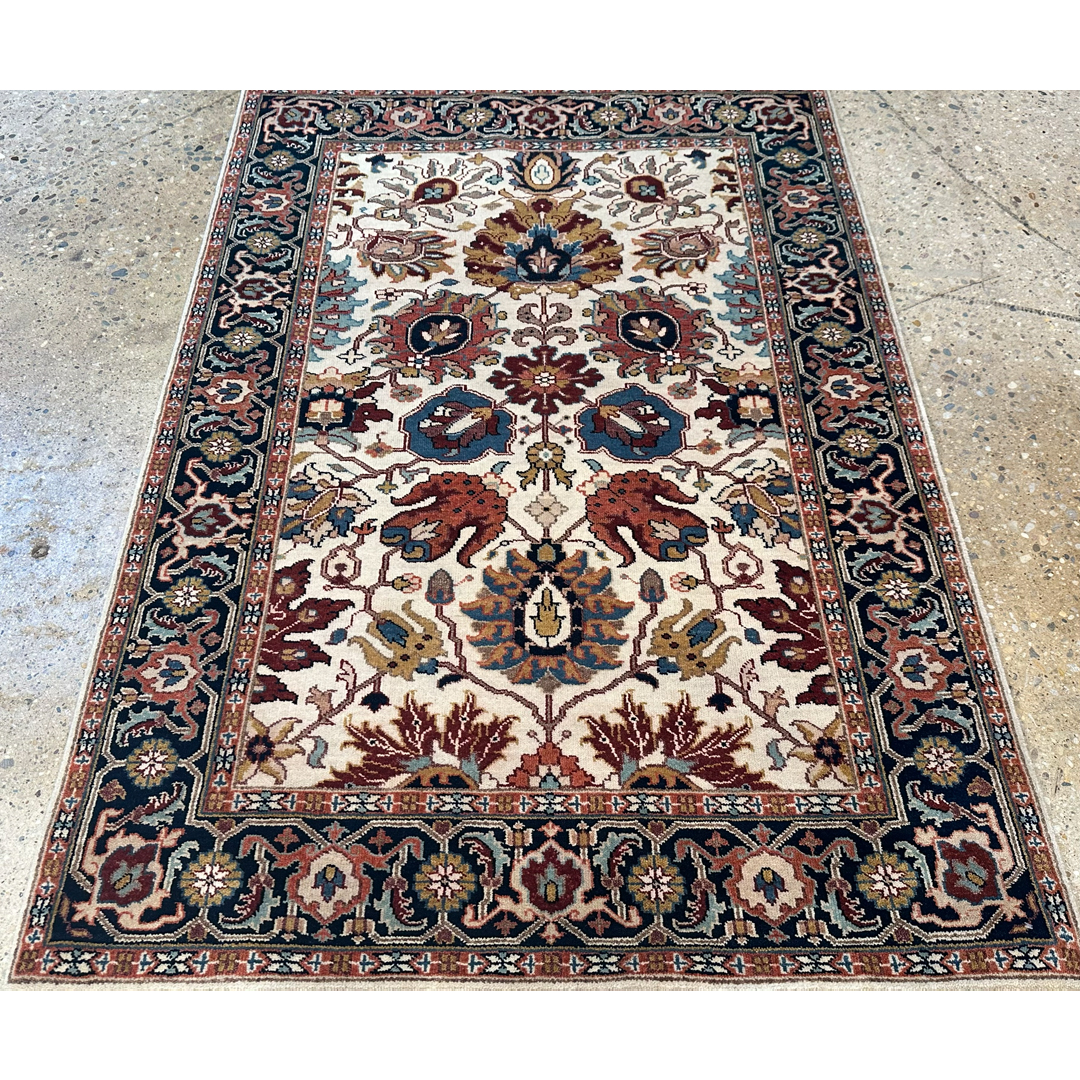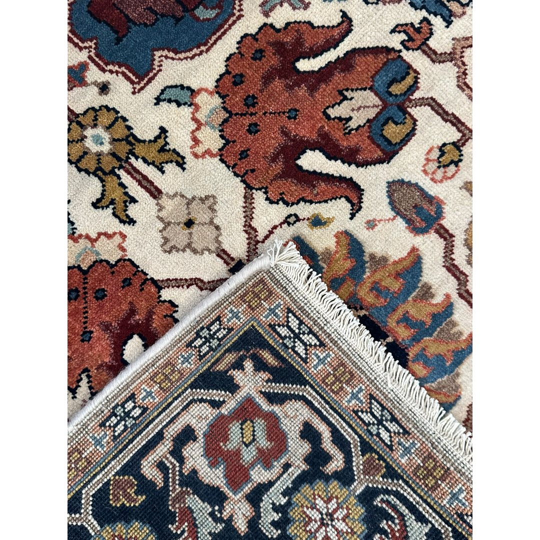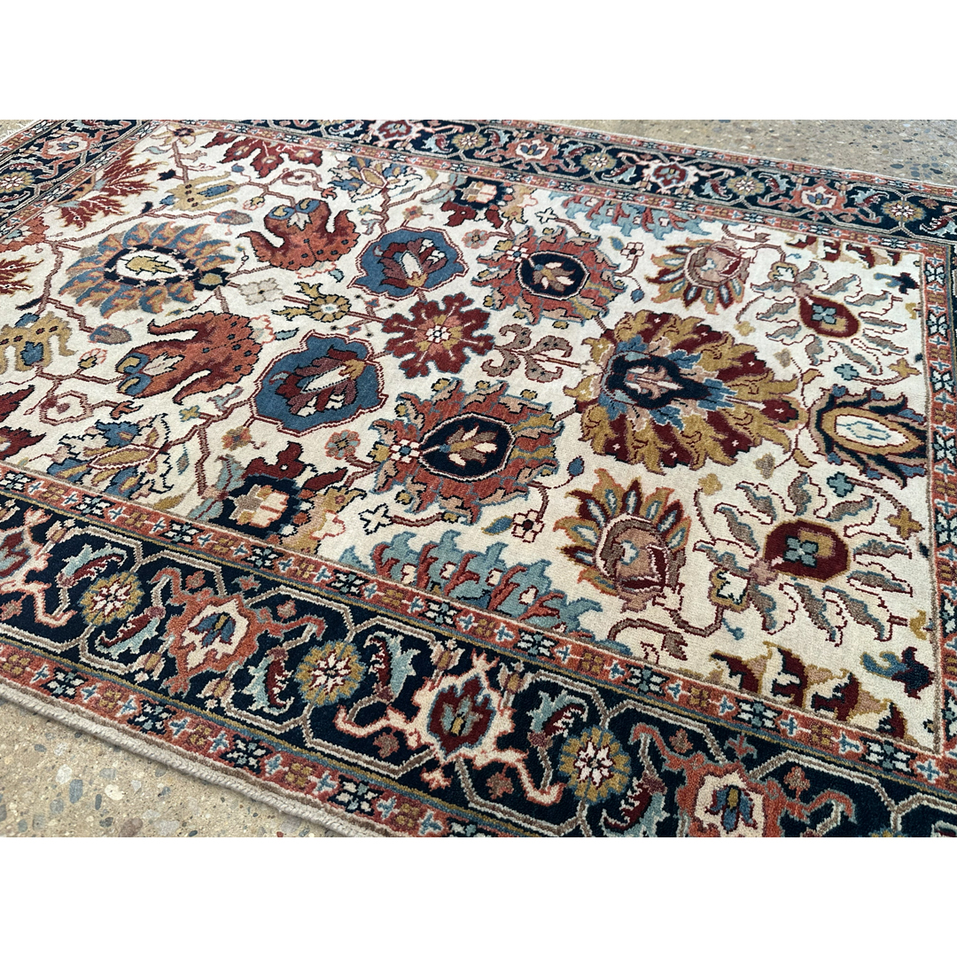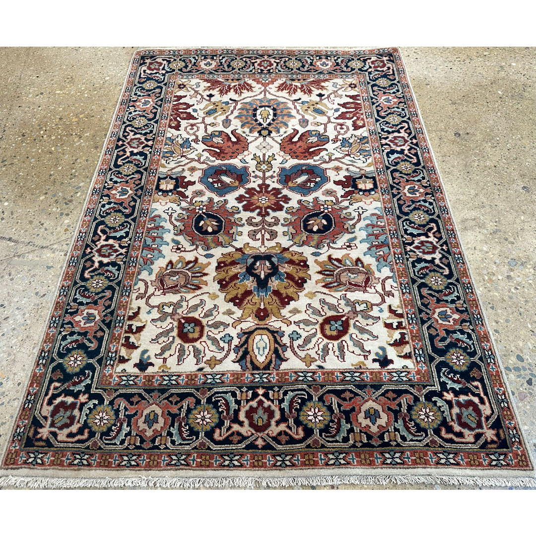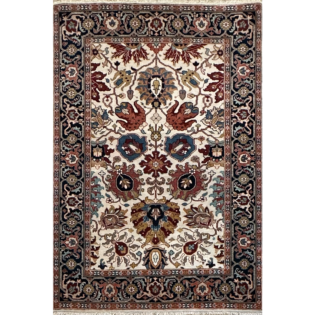 Infuse your home with the grand tradition of Anatolian weaving with this opulent 4′ x 6′ ft. Turkish Oushak design rug. Expertly hand-knotted in India, this piece features a luminous ivory field that serves as a sophisticated backdrop for a symmetrical arrangement of large-scale, stylized floral palmettes and vine scrolls. The botanical motifs are rendered in rich, warm hues of rust-red, slate blue, and earthy browns, creating a striking yet balanced composition. Framed by a contrasting dark navy border filled with intricate floral rosettes and meanders, this durable and stylish rug offers a timeless foundation perfect for adding warmth and luxury to a living room, entryway, or bedroom.