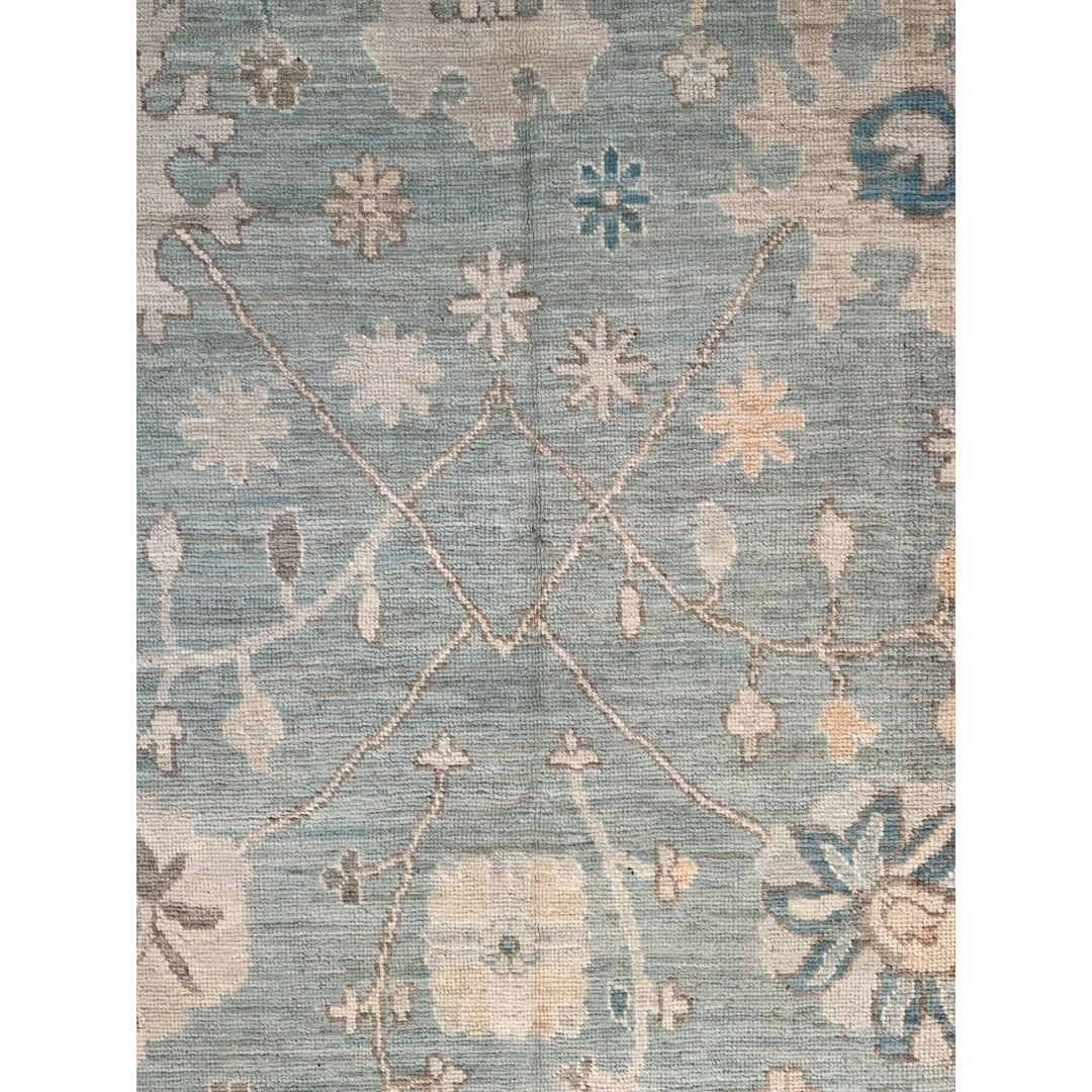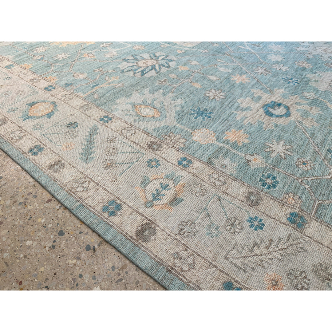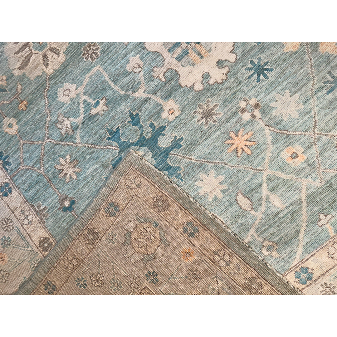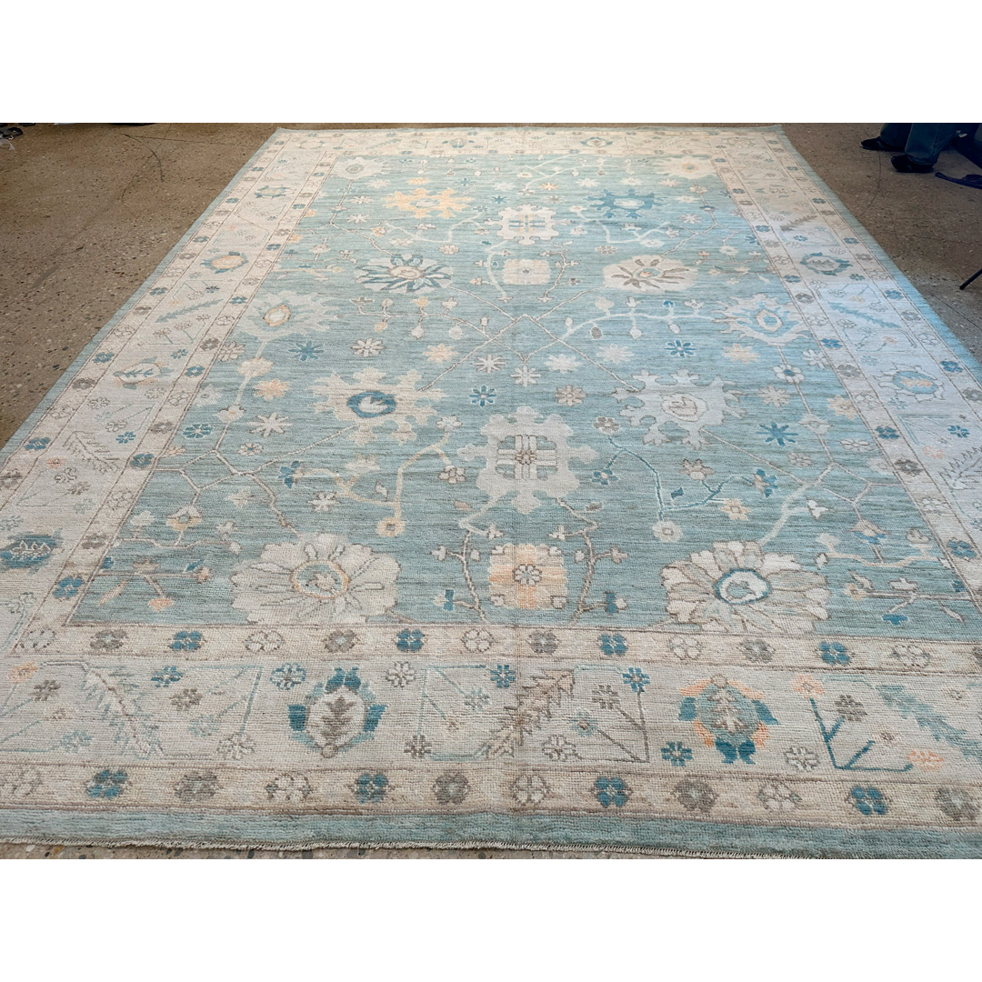 Elevate your living space with the Opulent Oushak, a magnificent Turkish design rug that radiates tranquil beauty. Measuring a generous 10’1″ x 13’9″ ft., this large 10×14 area rug showcases the classic open-field Oushak pattern, celebrated for its graceful, large-scale floral and botanical motifs. A dreamy, soft sage green field provides an ethereal backdrop, allowing the stylized designs in creamy ivory, subtle sky blue, and hints of warm beige to gently emerge, creating a calm and inviting atmosphere. The broad, elegant border in a coordinating light beige frames the central design beautifully, enhancing its sophisticated appeal. Ideal for anchoring a grand living room, a spacious master suite, or an elegant dining room, this Oushak rug boasts a plush pile that feels exquisite underfoot. It’s a timeless statement piece that marries traditional Turkish artistry with a fresh, airy aesthetic, perfect for both classic and contemporary interiors.