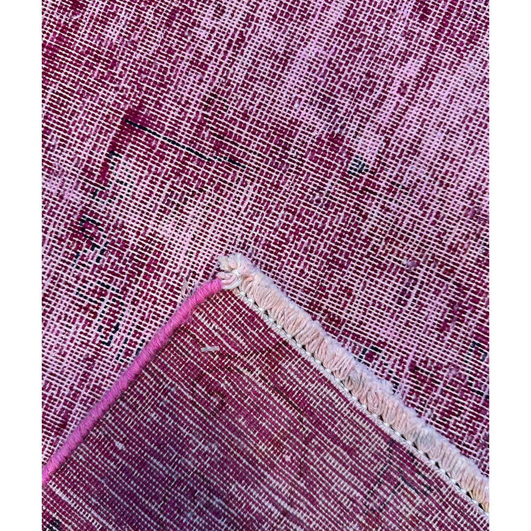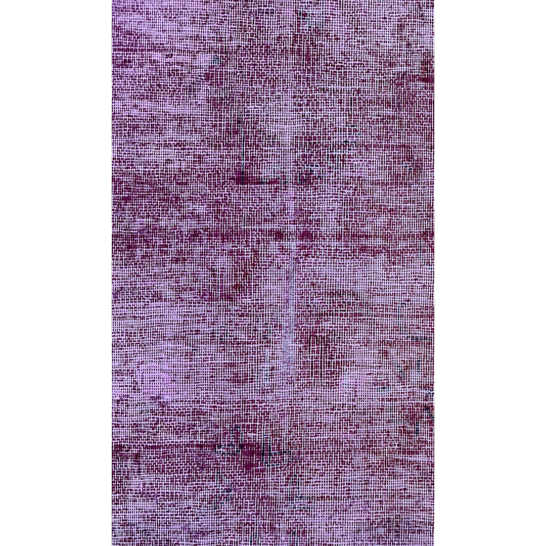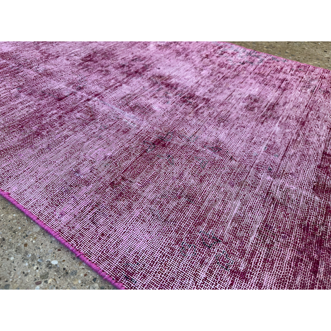 Add a splash of vibrant energy and romance to your home with this opulent 2’6″ x 4′ ft. distressed vintage Turkish rug. Expertly overdyed to create a stunning contemporary aesthetic, this hand-knotted piece features a saturated palette of raspberry pink, magenta, and deep rose. The heavy distressing softens the surface, obscuring the original traditional pattern until it appears as a subtle, ghost-like texture beneath the wash of bold color. This unique fusion of old-world craftsmanship and modern color makes it a perfect statement piece for a powder room, entryway, or bedside area seeking a playful yet sophisticated lift.