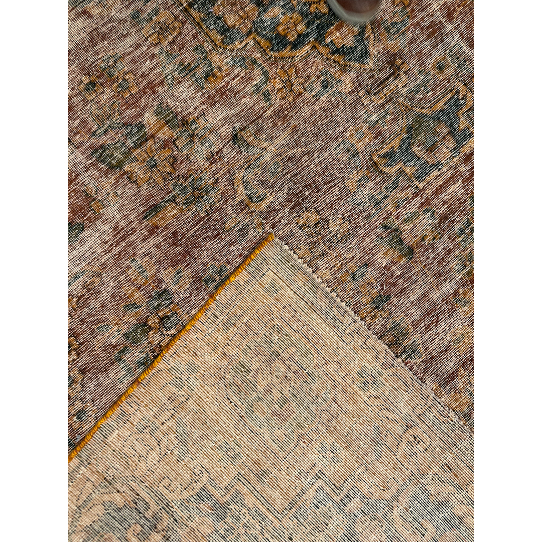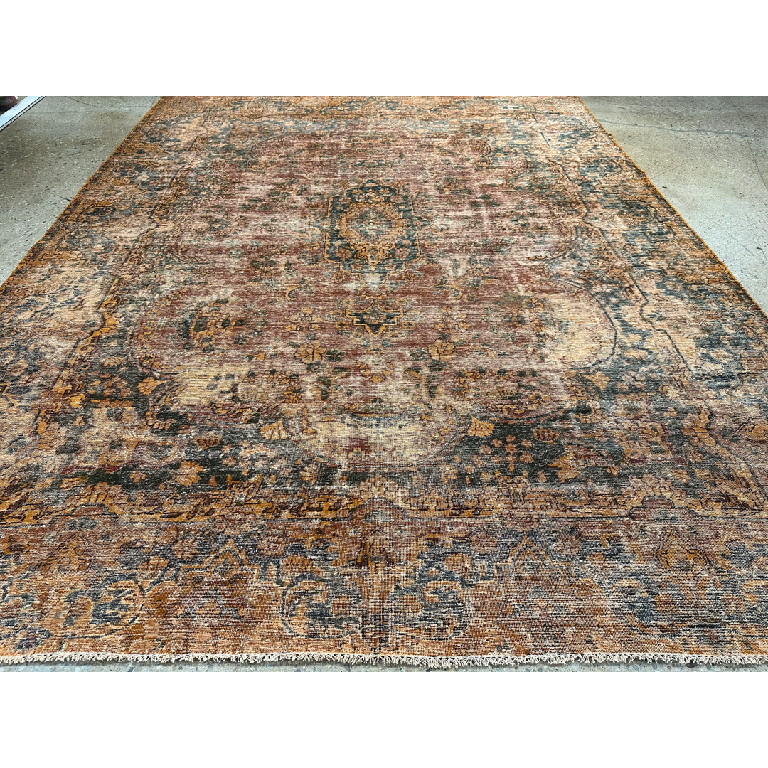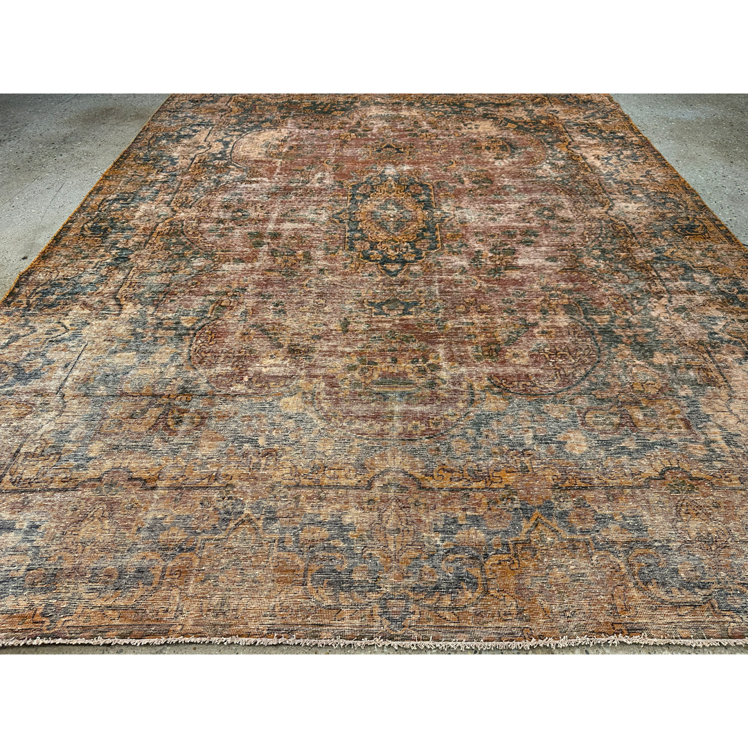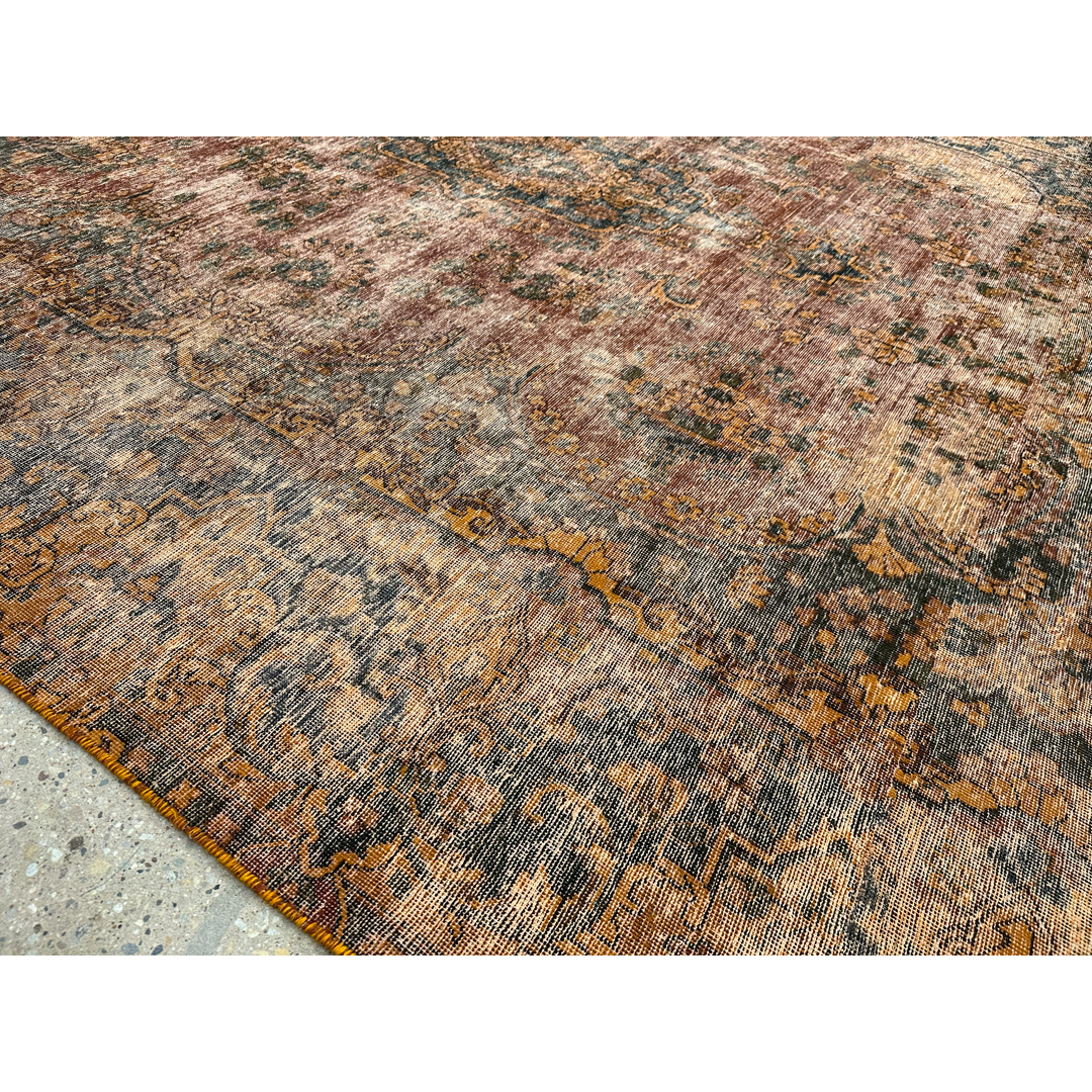 This 9’8″ x 12’4″ ft. rug is an original work of art, created from a vintage Persian Tabriz and skillfully overdyed in a deep, warm rust color. This modern transformation enhances the rug’s character, with heavy distressing revealing the intricate “ghost” of the original design beneath. Faint traces of the classic Tabriz medallion and floral patterns peek through in muted shades of blue, orange, and brown, creating a complex, layered texture. This one-of-a-kind piece is a perfect, soulful anchor for a living or dining room, blending a rich, storied history with a bold, contemporary color palette.