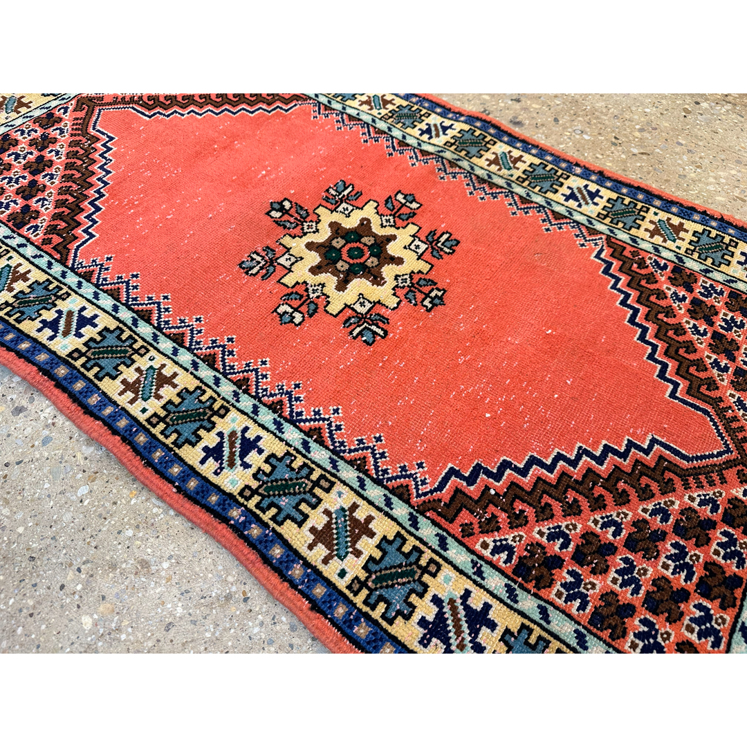 Infuse your space with the vibrant warmth of this outstanding 2’9″ x 4’10” ft. antique Moroccan rug. Hand-knotted in the 1940s, this piece features a luminous, saturated orange field that instantly energizes a room. The composition centers on a striking hexagonal medallion containing a geometric star motif, rendered in contrasting shades of ivory, espresso, and slate blue. The corners are filled with intricate checkerboard and latch-hook patterns, while a crisp border of repeating geometric abstract shapes frames the bold interior. This plush and colorful rug is an ideal statement piece for a bohemian living area, a cheerful nursery, or a welcoming entryway.