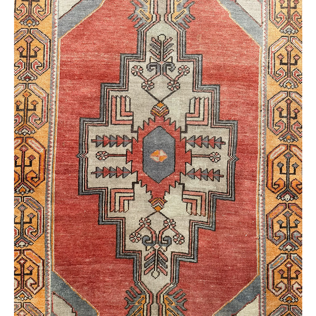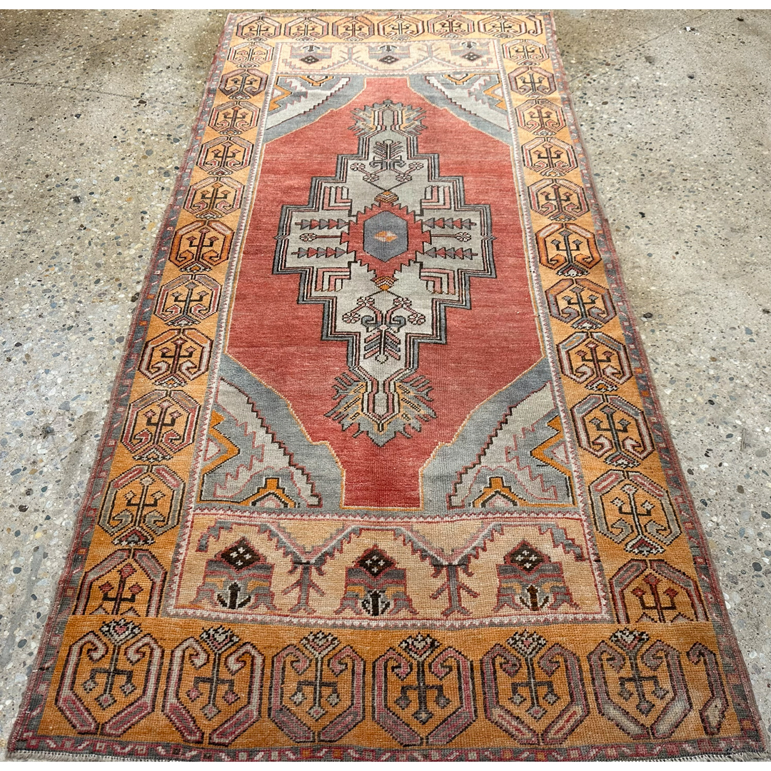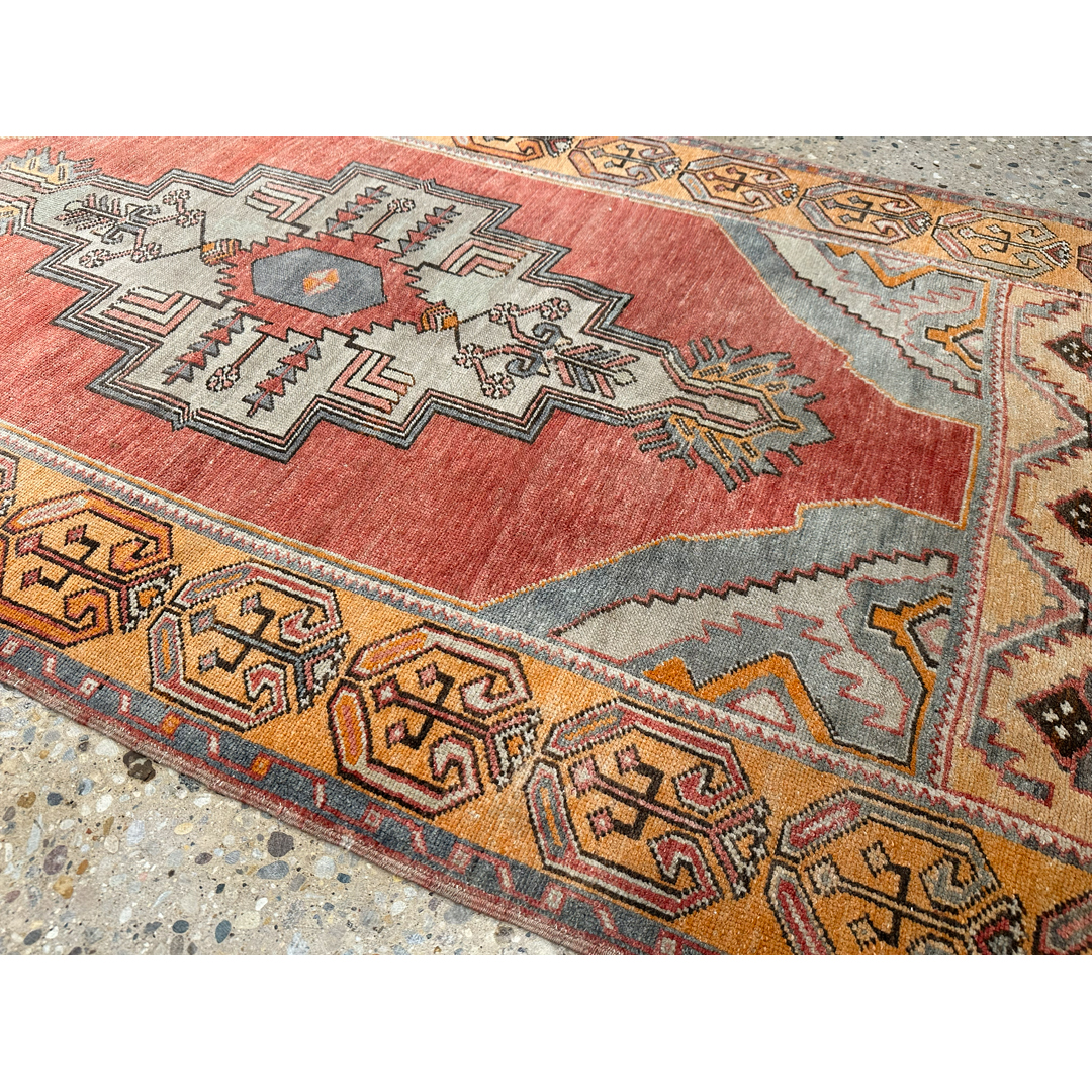 This vintage Turkish Oushak runner features a bold geometric composition that immediately commands attention. Measuring 3’8″ x 8′ ft., the rug is defined by a vibrant terracotta red field that serves as a backdrop for a striking, elongated central medallion. This stepped medallion, rendered in cool tones of slate blue and dove grey, creates a dynamic contrast against the warm ground and contains stylized botanical motifs. The field is framed by jagged corner spandrels in matching cool tones, adding to the angular aesthetic. Enclosing the design is a broad border in a golden amber hue, decorated with a repeating series of ornate, shield-like geometric patterns that provide a structured finish to this distinctive Anatolian piece.