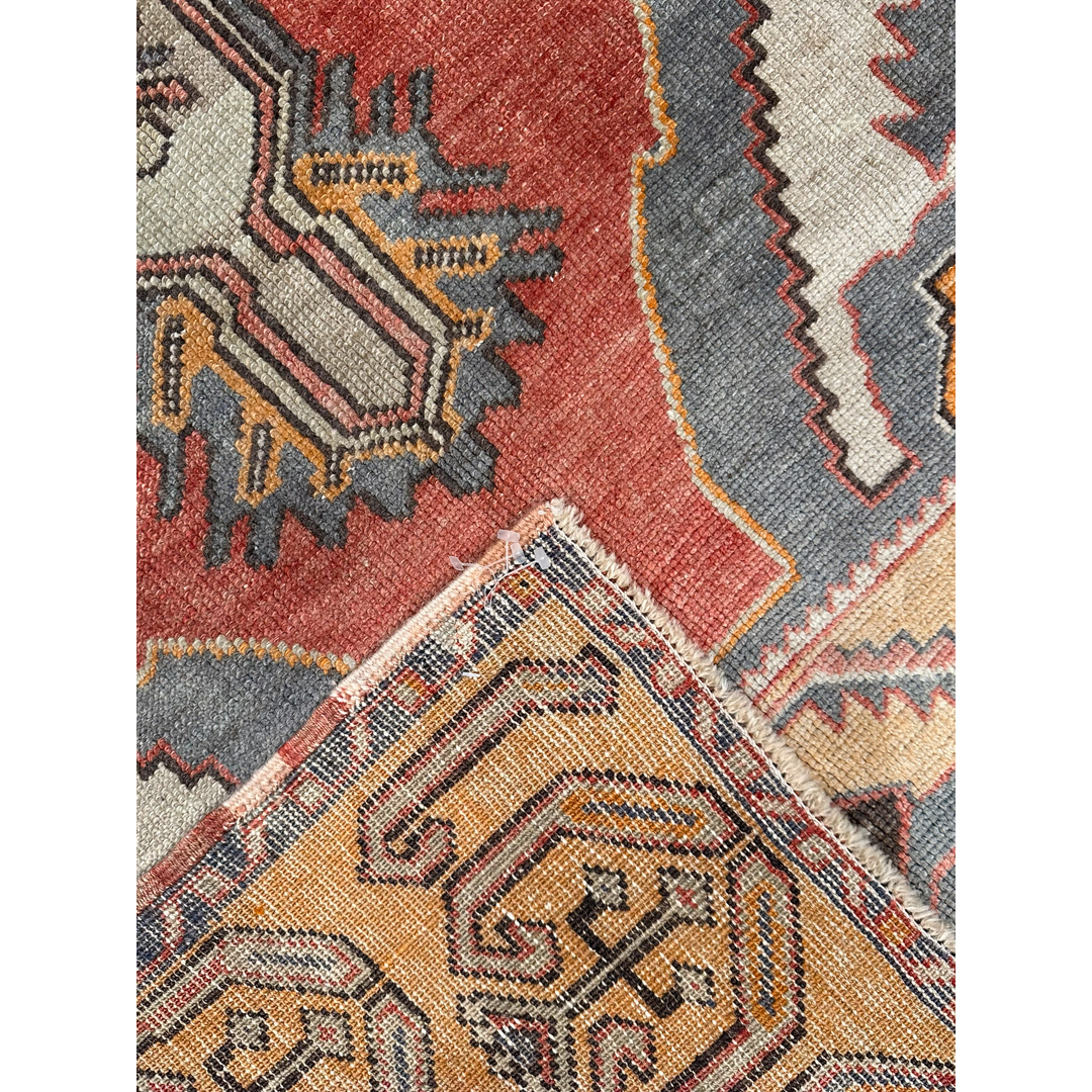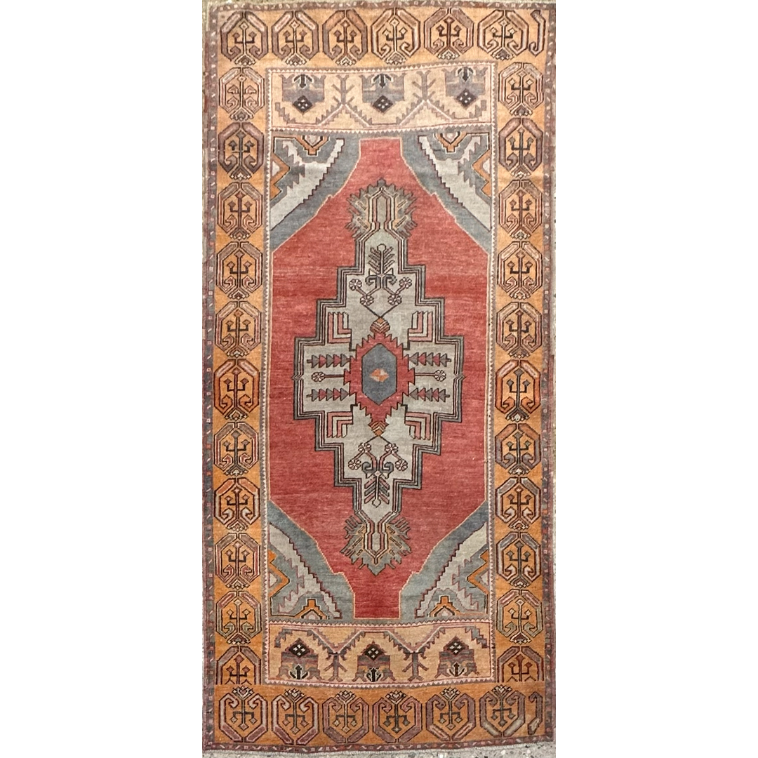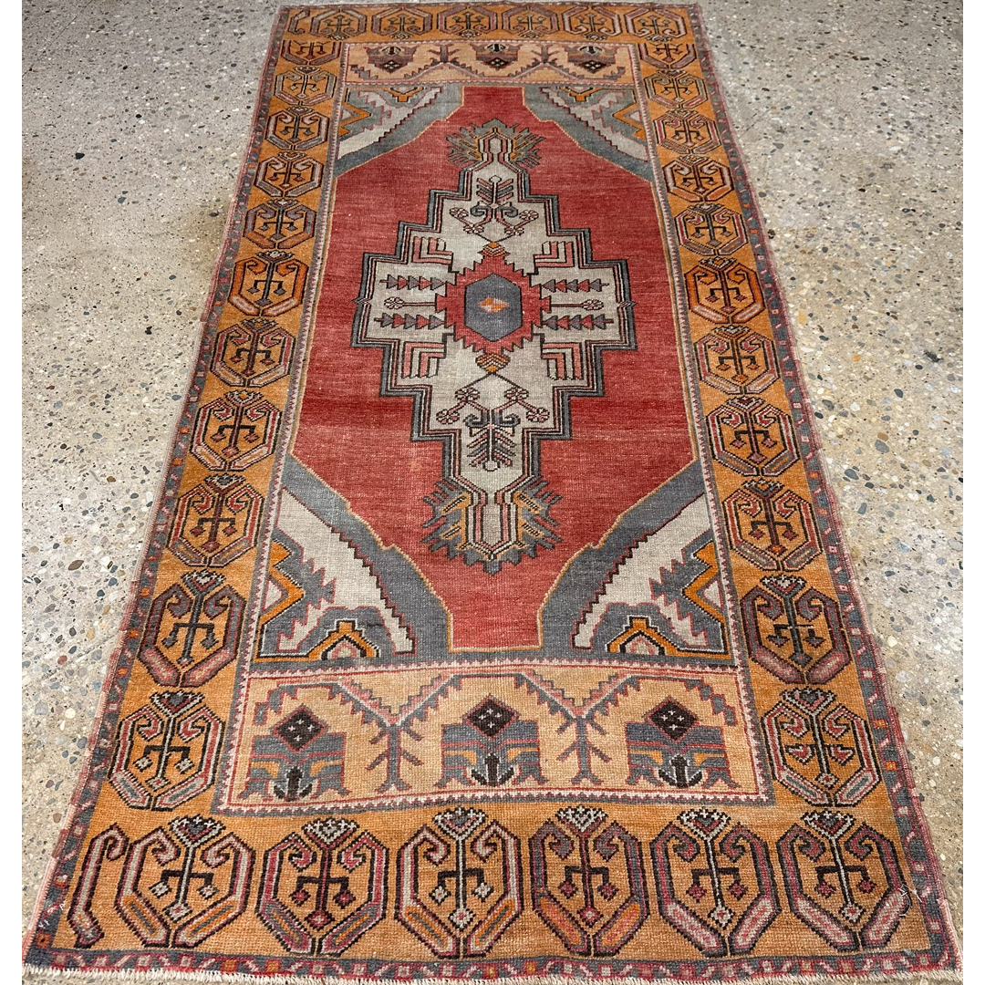 This vintage Turkish Oushak runner features a bold geometric composition that immediately commands attention. Measuring 3’8″ x 8′ ft., the rug is defined by a vibrant terracotta red field that serves as a backdrop for a striking, elongated central medallion. This stepped medallion, rendered in cool tones of slate blue and dove grey, creates a dynamic contrast against the warm ground and contains stylized botanical motifs. The field is framed by jagged corner spandrels in matching cool tones, adding to the angular aesthetic. Enclosing the design is a broad border in a golden amber hue, decorated with a repeating series of ornate, shield-like geometric patterns that provide a structured finish to this distinctive Anatolian piece.