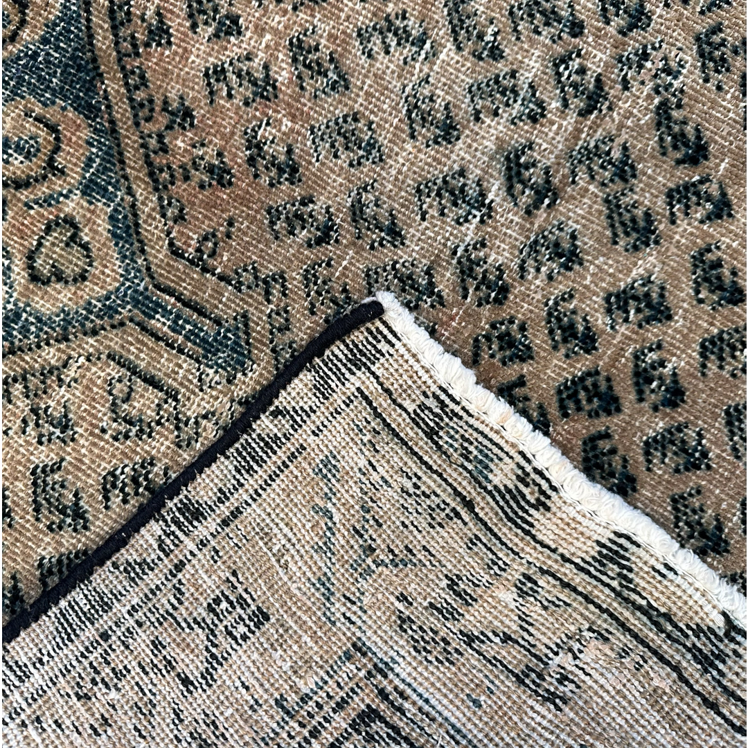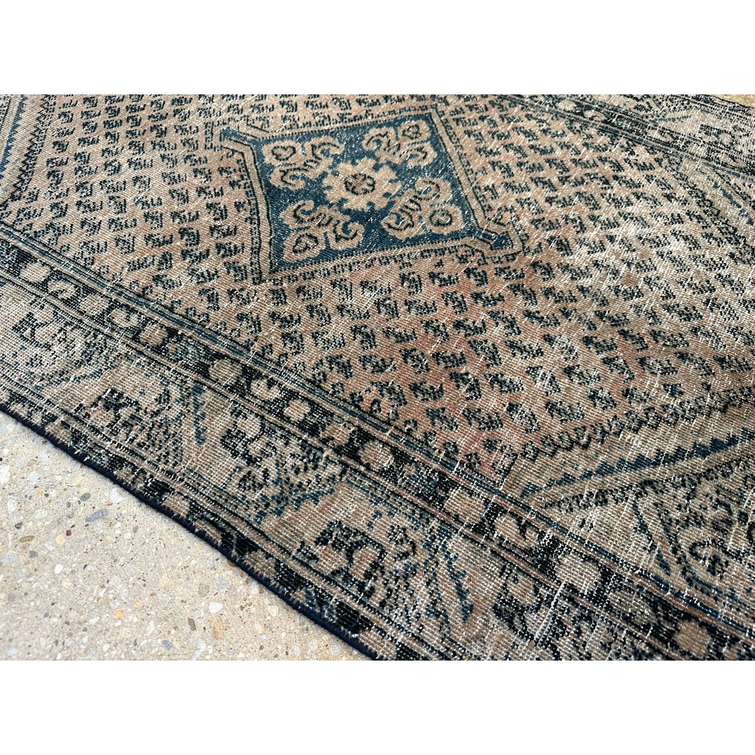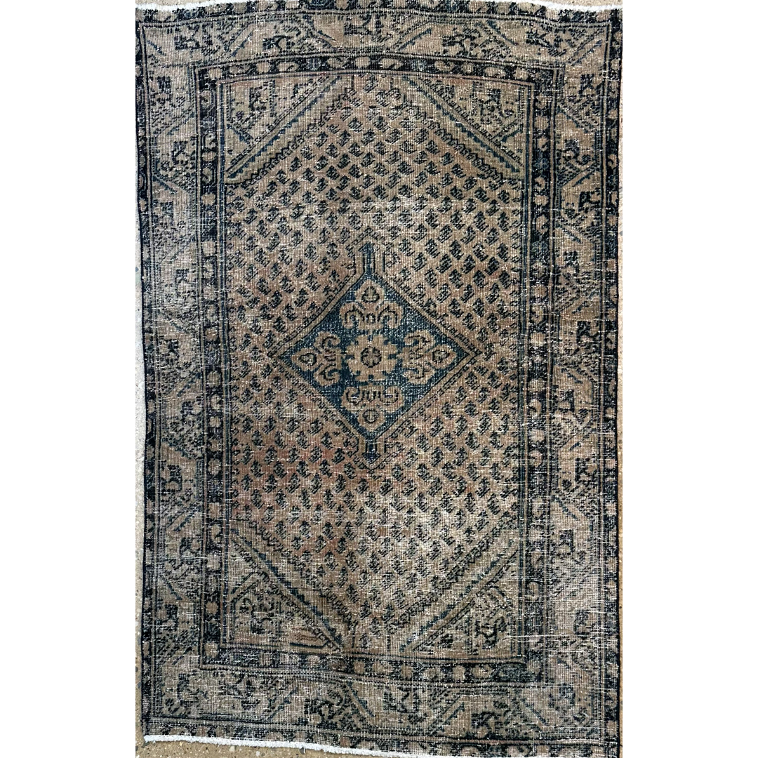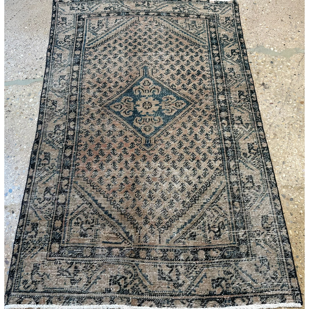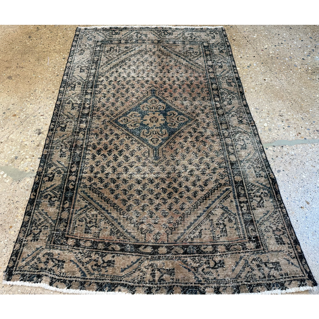 Bring a rugged, curated look to your space with this outstanding 3’4″ x 5’2″ ft. antique Persian Hamadan rug. Hand-knotted in the 1930s, this piece has been expertly distressed to achieve a weathered, vintage aesthetic that highlights the enduring quality of its craftsmanship. The color palette is a sophisticated, earthy mix of sand, warm taupe, and deep charcoal, created by the fading of the original dyes over time. A striking central diamond medallion, outlined in dark indigo, anchors the design, while the surrounding field is filled with a faint, repeating geometric lattice pattern that adds texture without overwhelming the eye. Framed by a structured border featuring stylized botanical motifs, this durable rug offers an industrial-chic vibe perfect for a high-traffic entryway, kitchen, or private study.