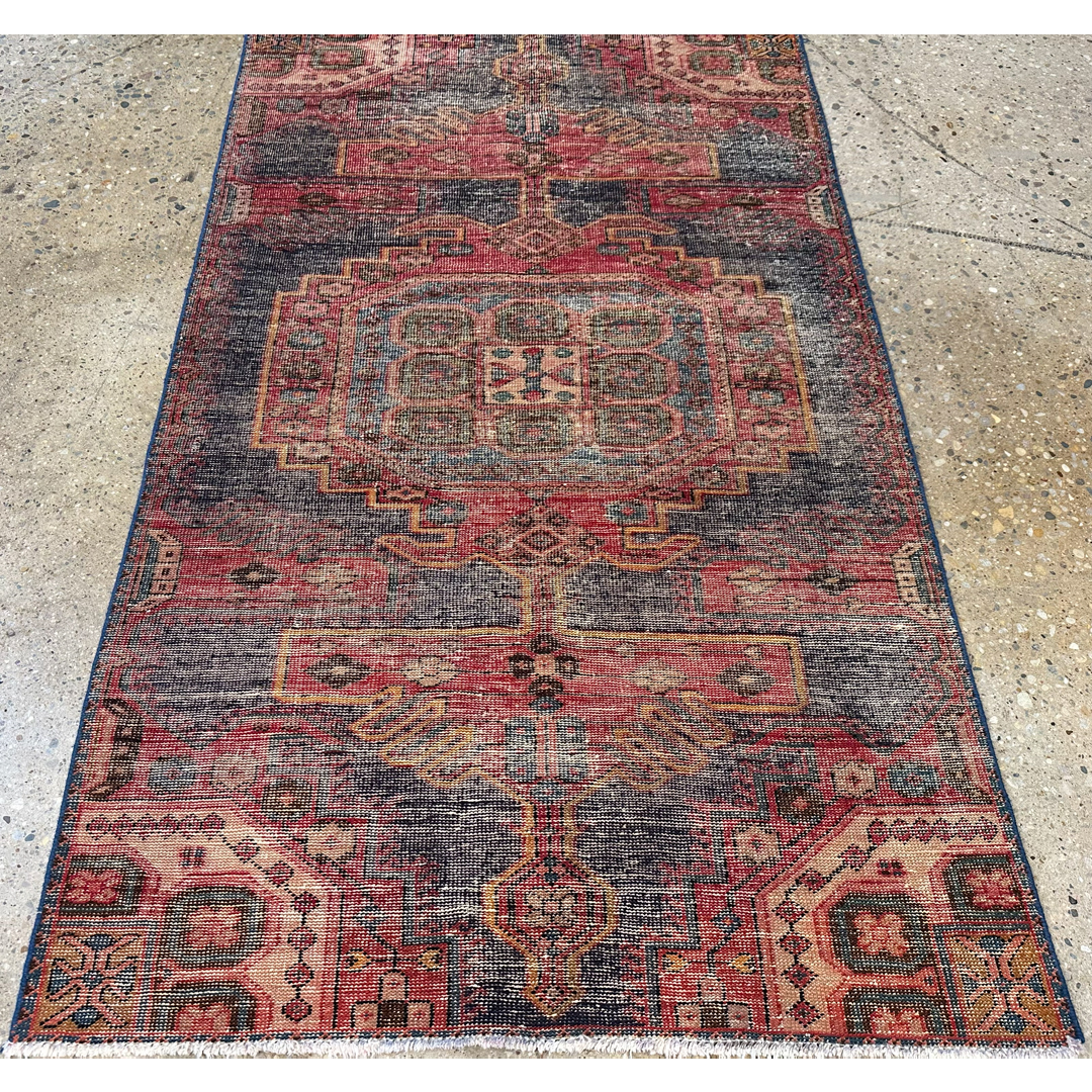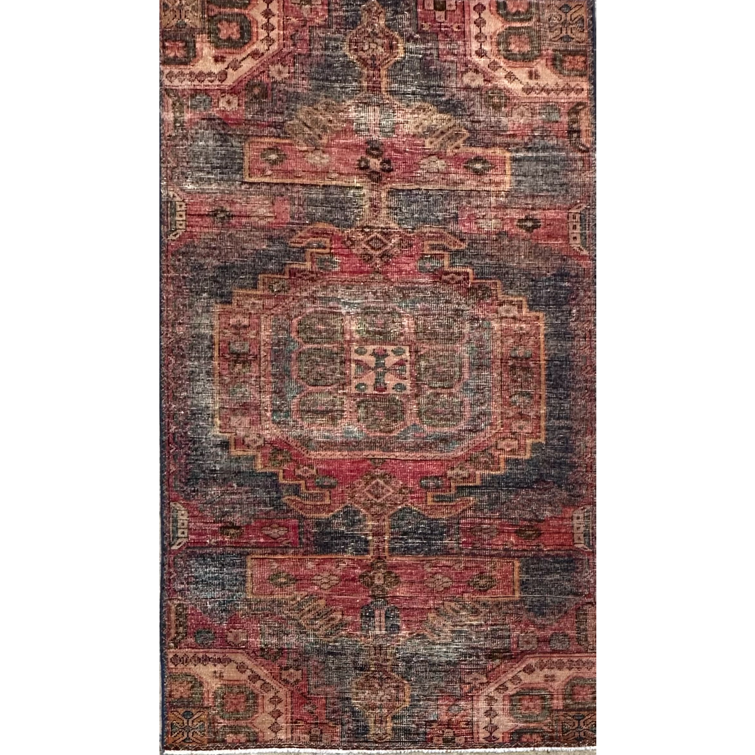 Imbue your space with the moody elegance of this outstanding 3’9″ x 6’4″ distressed vintage Turkish rug. Expertly overdyed to achieve a rich, saturated aesthetic, this unique hand-knotted piece features a dramatic palette of deep eggplant purple, dark indigo, and oxidized rust-red. Beneath the bold wash of color, a traditional geometric design remains visible, anchored by a large, stepped central medallion and flanked by angular tribal motifs that add depth and texture. This durable, low-pile rug offers a sophisticated fusion of old-world pattern and modern color, making it an ideal statement piece for a private study, entryway, or eclectic living area.