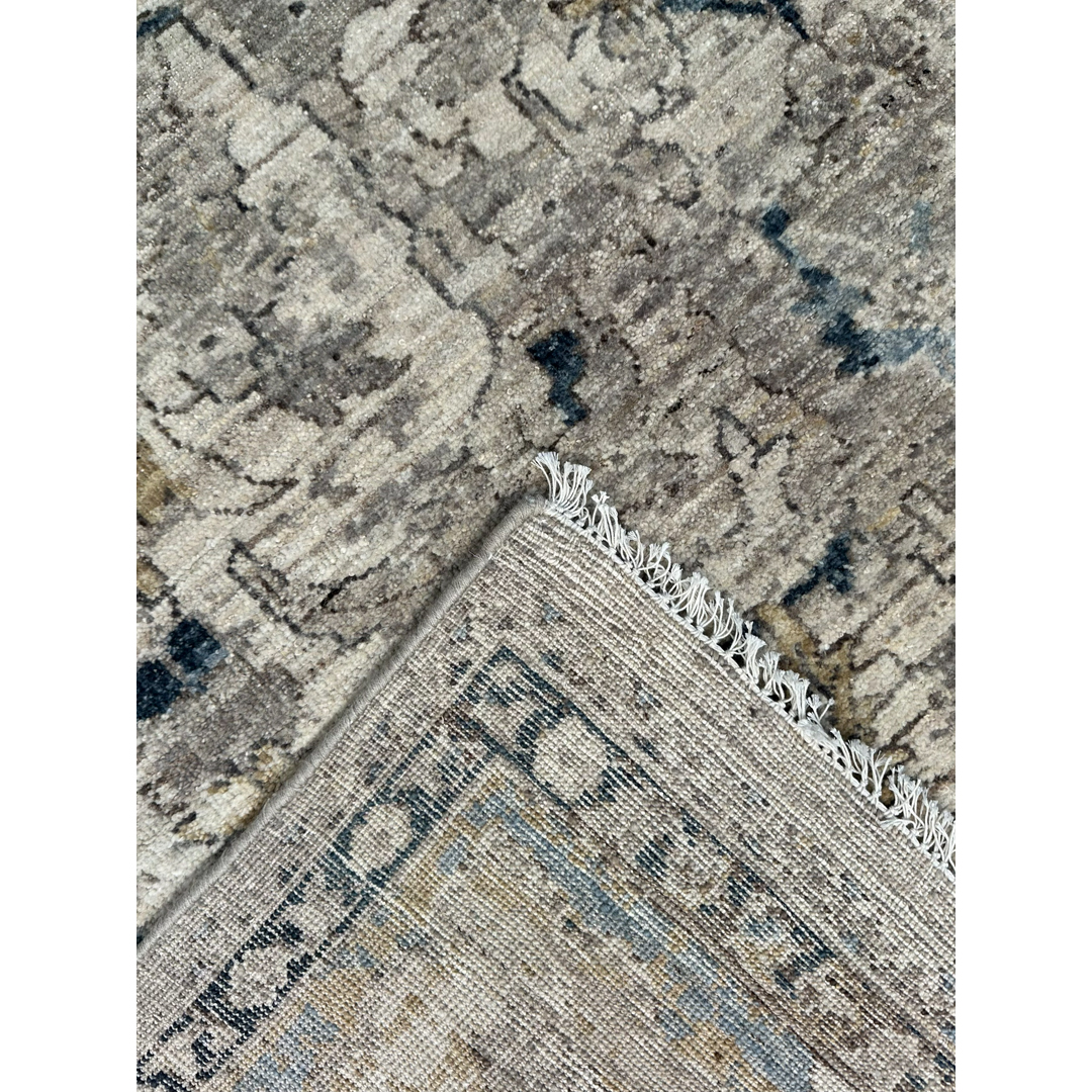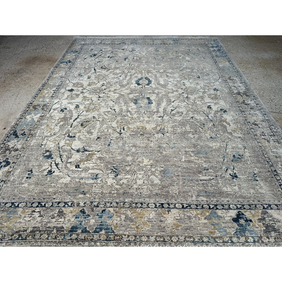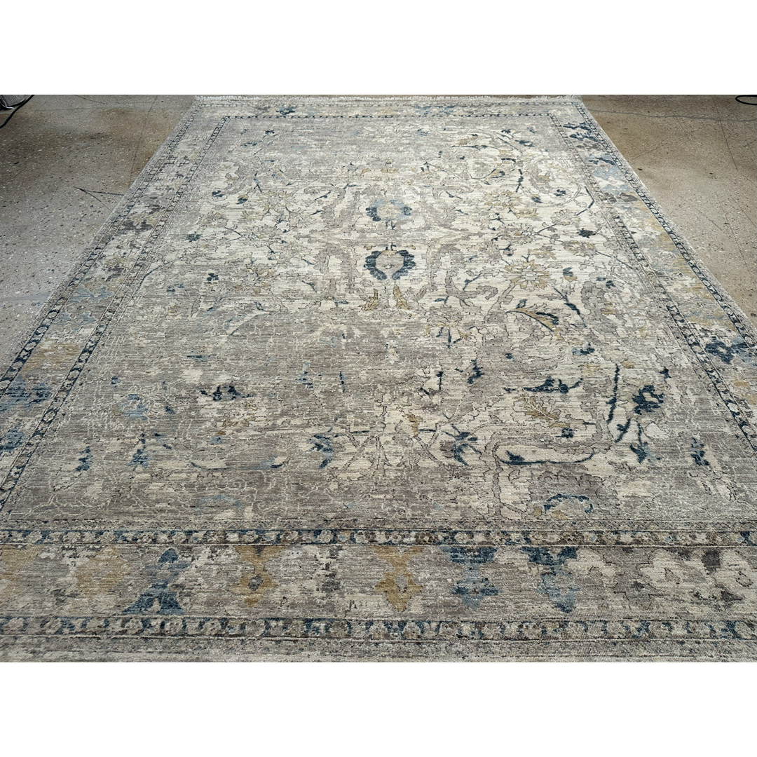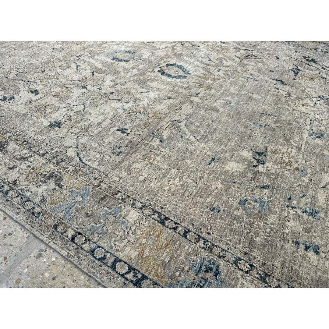 Embrace the soulful elegance of a bygone era with the Outstanding Overdyed, a genuine vintage distressed floral rug. Measuring 8’10” x 12′ ft., this 9×12 area rug has been masterfully transformed, its original Persian floral design artfully faded to a ghostly, textural memory. The entire piece is washed in a sophisticated, neutral palette of soft grays, beiges, and taupes, with subtle hints of the original deep blue and brown peeking through, creating a stunning ‘erased’ effect. This captivating interplay between historic artistry and modern minimalism provides incredible visual depth. With its low, sleek pile, it’s the perfect foundation for a transitional living room or an elegant dining space, blending the soul of an antique with a serene, contemporary aesthetic.