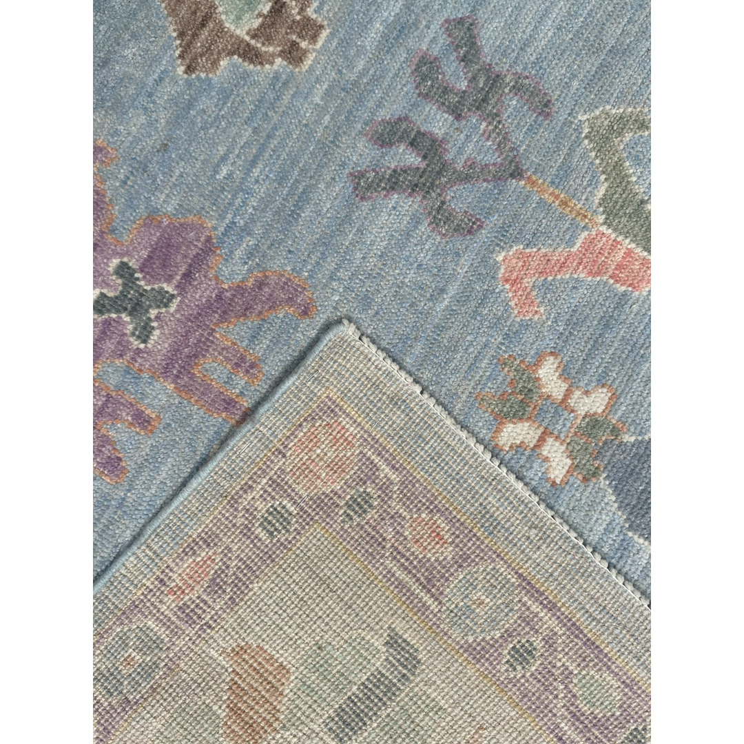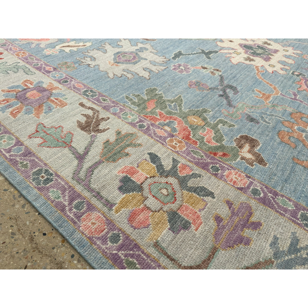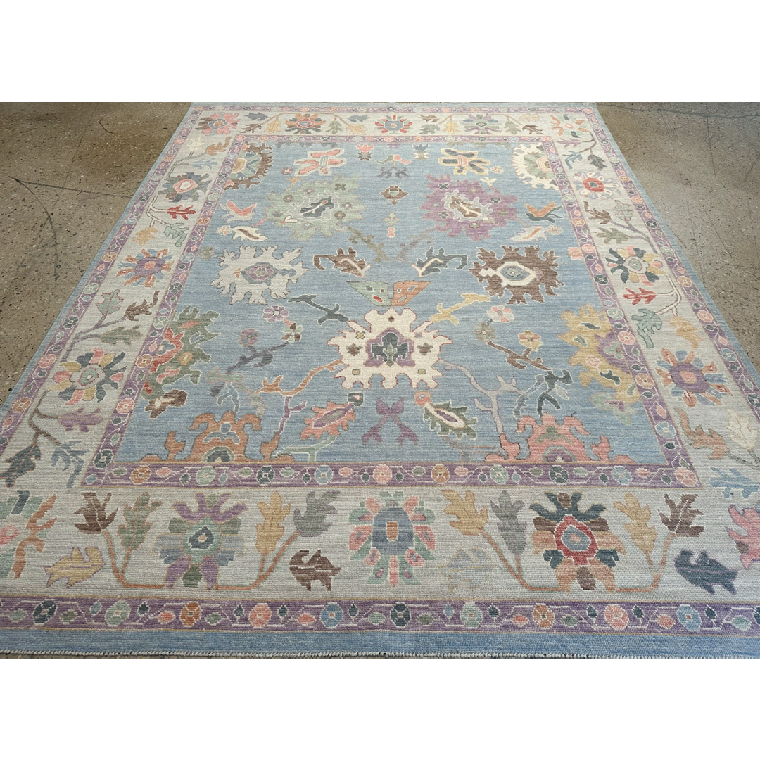 This hand-knotted rug features a refined interpretation of the classic Oushak aesthetic. The field is rendered in a soft, luminous sky-blue tone, providing a tranquil backdrop for a variety of oversized, stylized floral palmettes and scrolling vine-work. The patterns are executed in a delicate pastel palette including soft lavender, sage green, terracotta, and muted gold, lending the piece an airy and elegant presence. The design is framed by a wide, ivory-ground border that mirrors the intricate botanical motifs of the field, creating a balanced and cohesive composition. Woven with high-quality wool, the rug offers a soft pile and a slightly weathered finish that mimics the charm of an antique. Its sophisticated colorway and playful pattern make it an ideal choice for adding a touch of character to a bedroom or formal living room.