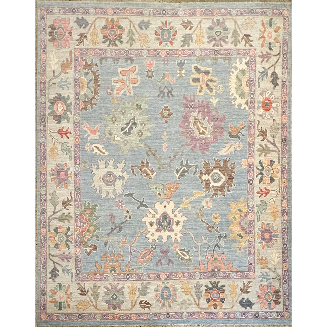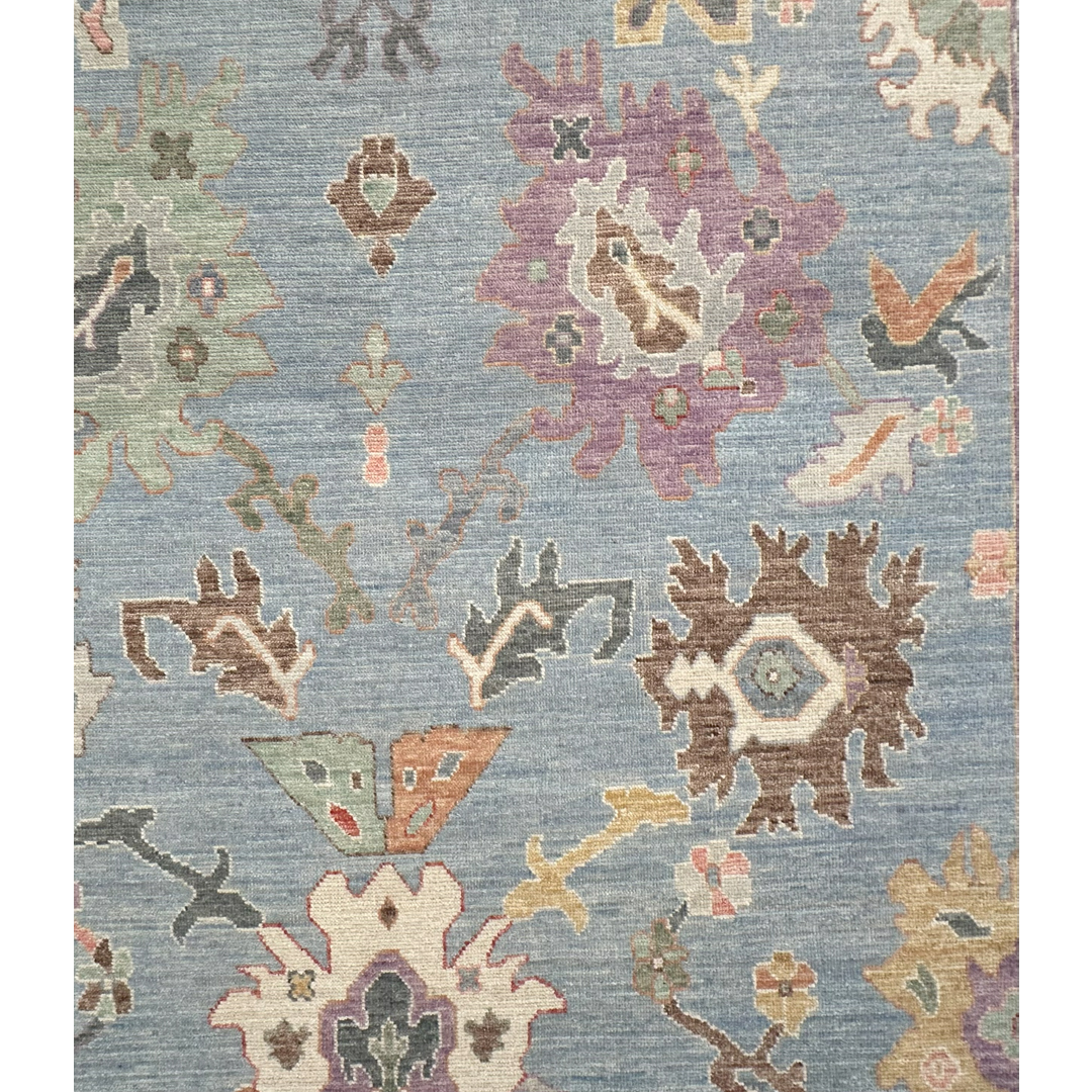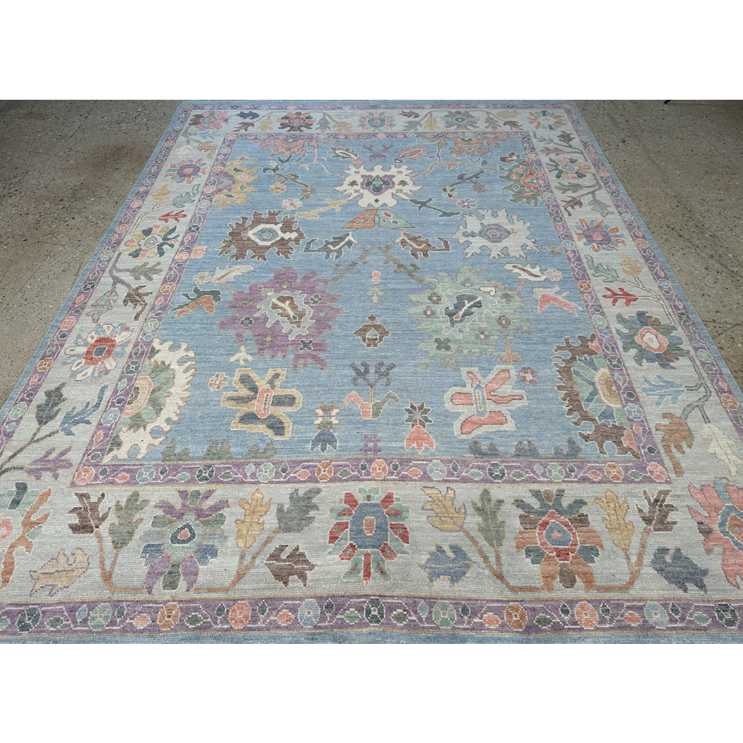 This hand-knotted rug features a refined interpretation of the classic Oushak aesthetic. The field is rendered in a soft, luminous sky-blue tone, providing a tranquil backdrop for a variety of oversized, stylized floral palmettes and scrolling vine-work. The patterns are executed in a delicate pastel palette including soft lavender, sage green, terracotta, and muted gold, lending the piece an airy and elegant presence. The design is framed by a wide, ivory-ground border that mirrors the intricate botanical motifs of the field, creating a balanced and cohesive composition. Woven with high-quality wool, the rug offers a soft pile and a slightly weathered finish that mimics the charm of an antique. Its sophisticated colorway and playful pattern make it an ideal choice for adding a touch of character to a bedroom or formal living room.