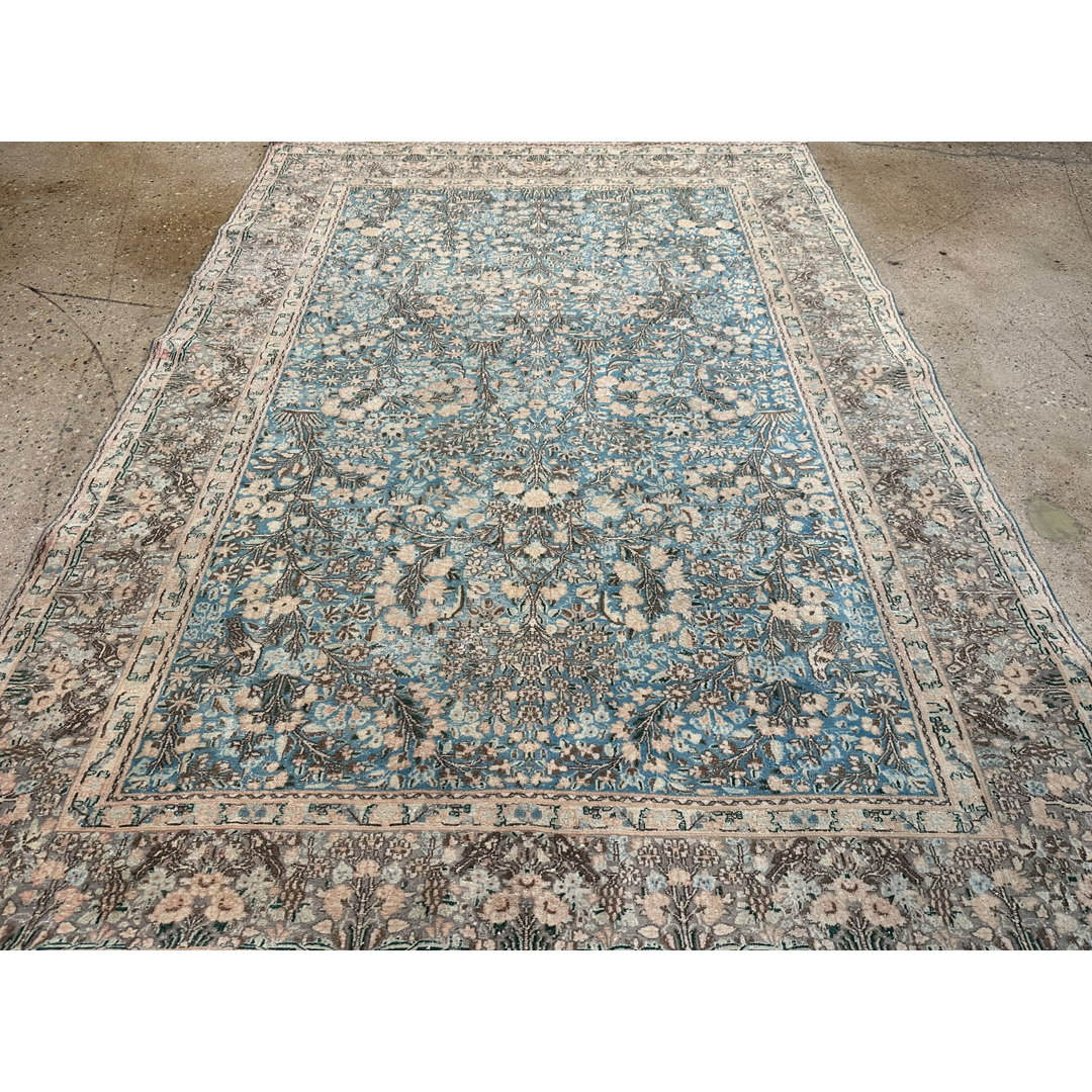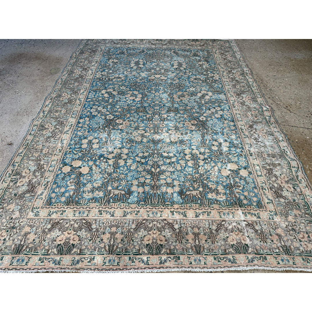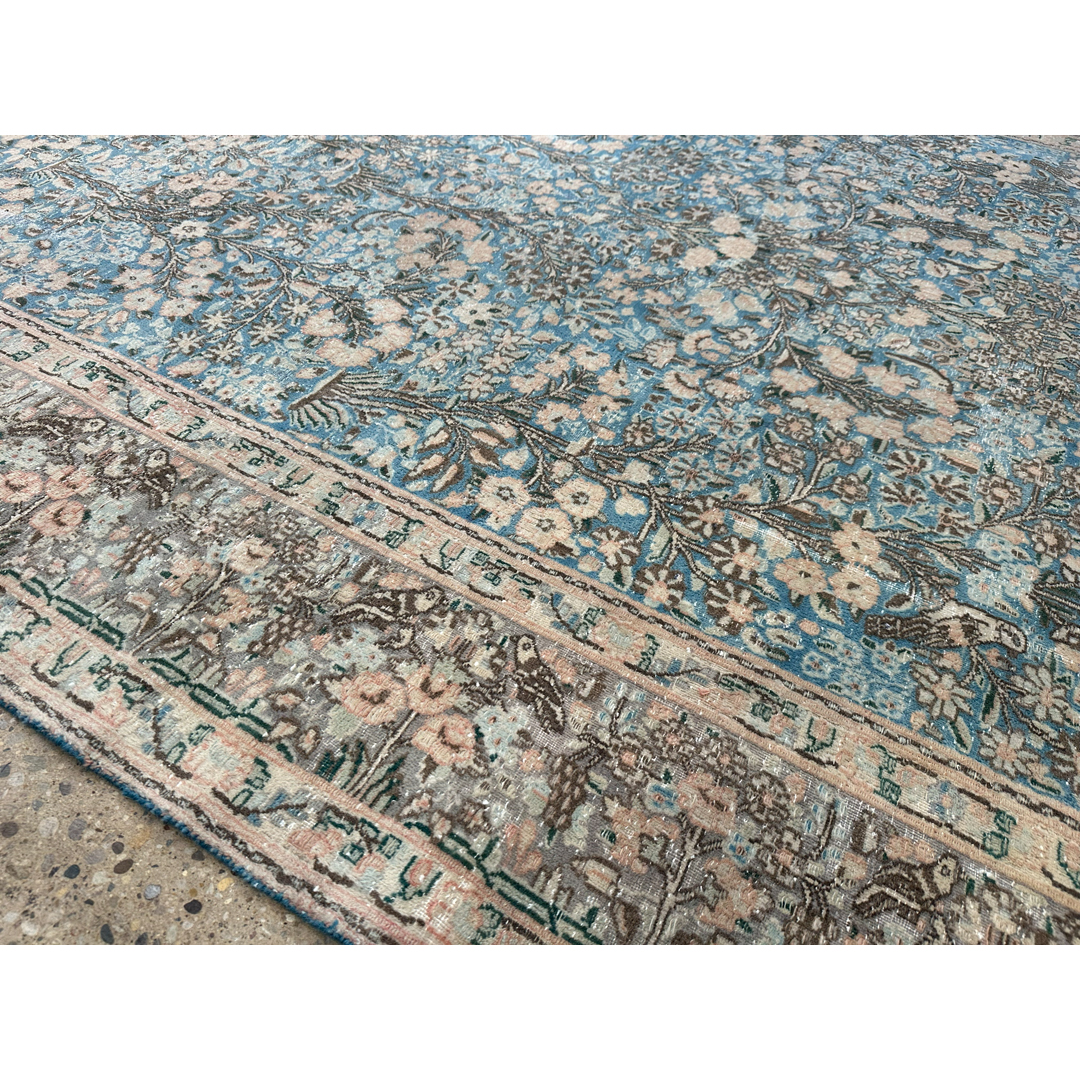 This vintage Persian Tabriz rug features a sophisticated, weathered aesthetic characterized by a heavily distressed finish. The piece utilizes a palette of muted pastel tones, primarily soft blues and cream, which lend a contemporary feel to its traditional craftsmanship. The design consists of an intricate field of floral motifs and scrolling vine-work, framed by a complex border that remains visible despite the intentional distressing. The low, sheared pile creates a unique low texture, emphasizing its lived-in, antique character. This rug serves as a versatile anchor for interiors ranging from classic to modern-transitional, offering the storied history of a Tabriz with a softened, neutral presence.