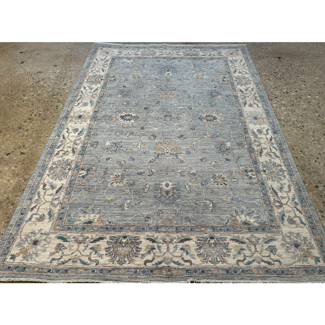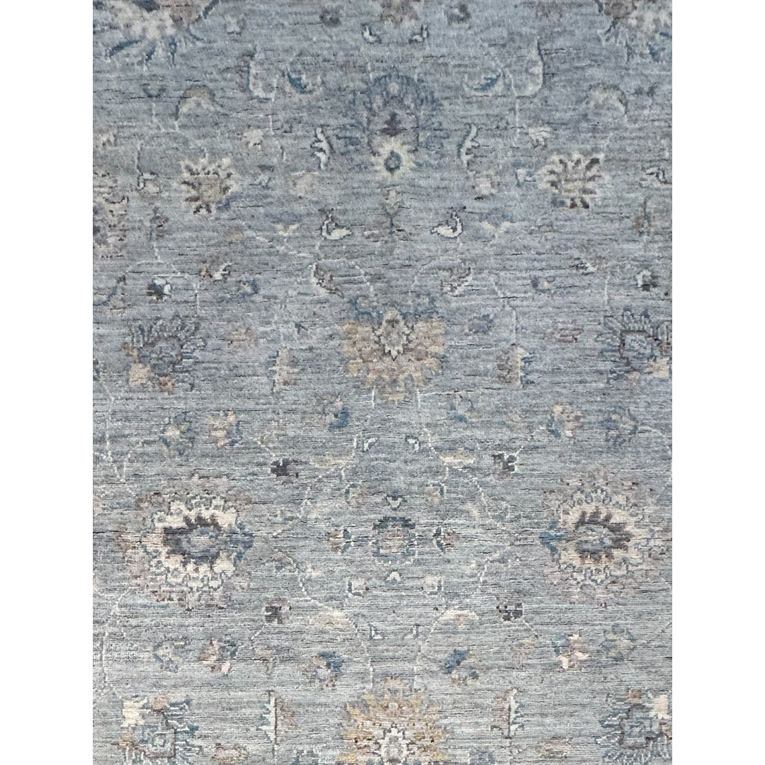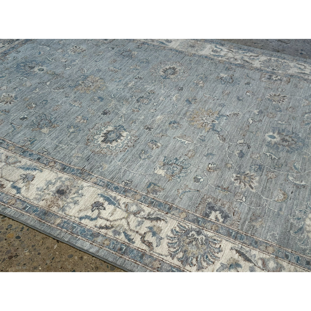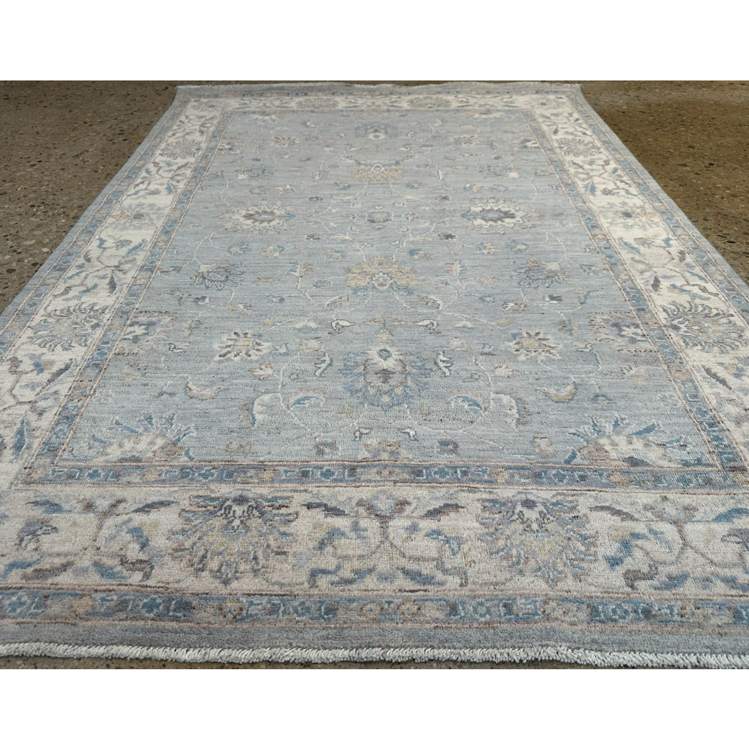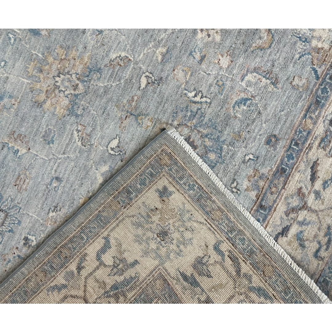 This elegant hand-knotted Pakistani rug offers a breathtaking, transitional interpretation of classic Peshawar design, prized for its incredibly soft finish and airy botanical motifs. The incredibly graceful composition features a spacious, all-over network of delicate scrolling vines, stylized floral palmettes, and sweeping arabesques. These classic elements appear to float effortlessly across a luminous, highly textural field of heathered slate-blue and soft silver. The cool, serene central field is beautifully framed by a wide, contrasting border in creamy ivory, adorned with repeating botanical elements rendered in coordinating shades of muted navy, soft taupe, and pale gray. It is flawlessly scaled to bring a sense of tailored calm and crisp, classic elegance to a bright foyer, a refined home office, or a luxurious bedroom reading nook.