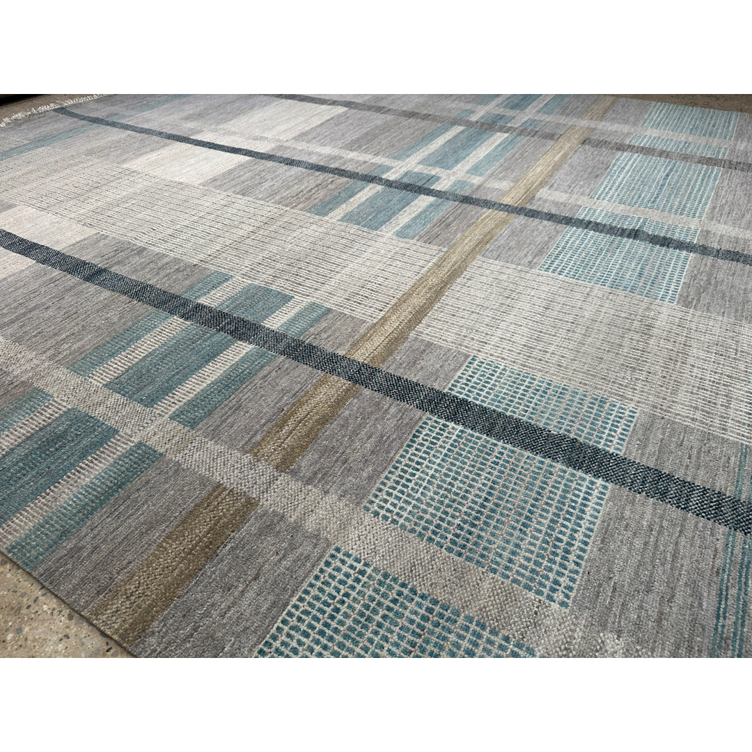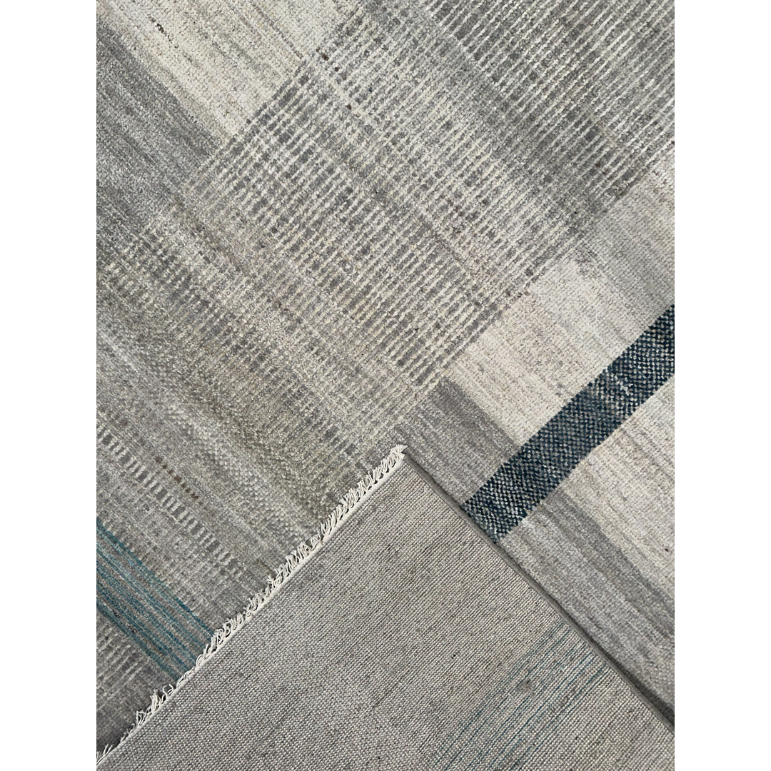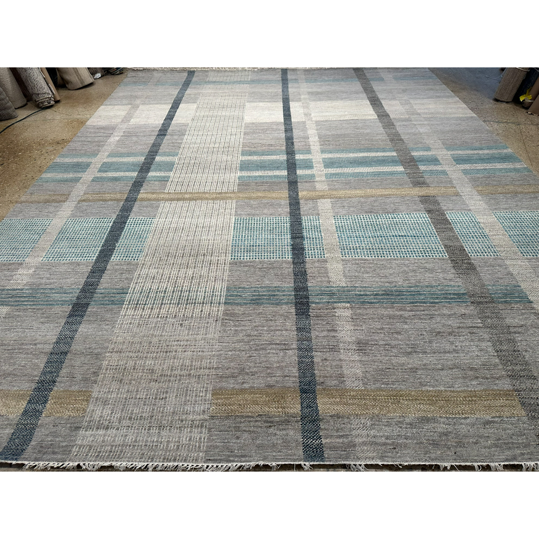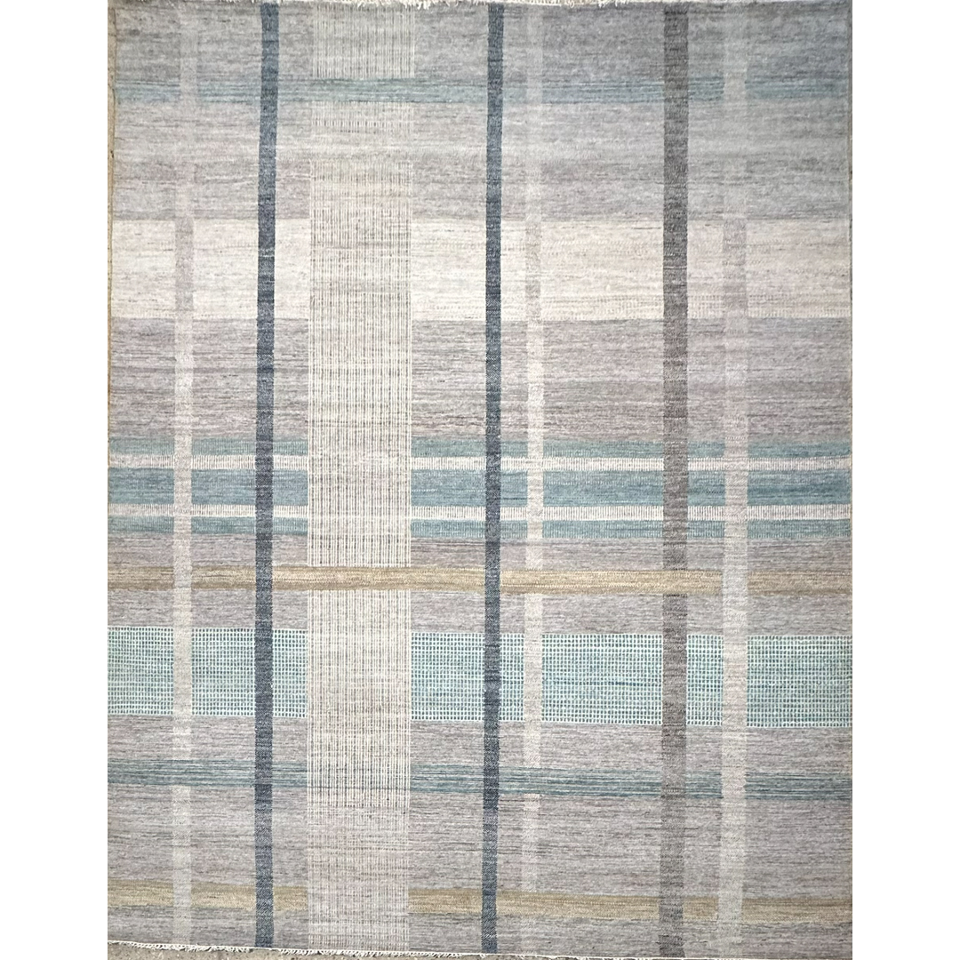 A perfect blend of structure and softness, this contemporary carpet reimagines the traditional plaid motif for the modern home. Hand-knotted in India, the design utilizes an asymmetric grid pattern to create visual interest and depth without overwhelming a space. The color story is cool and sophisticated, featuring intersected bands of denim blue, seafoam, and taupe on a gray and ivory background. The “heathered” texture of the wool adds warmth and dimension, making this an ideal foundation for transitional or coastal-modern interiors. Its generous dimensions allow for substantial furniture placement, effectively unifying large architectural spaces.