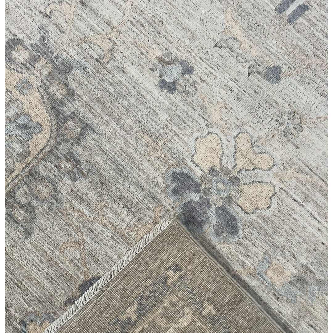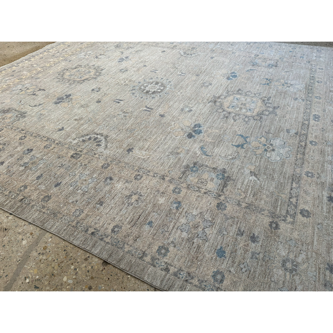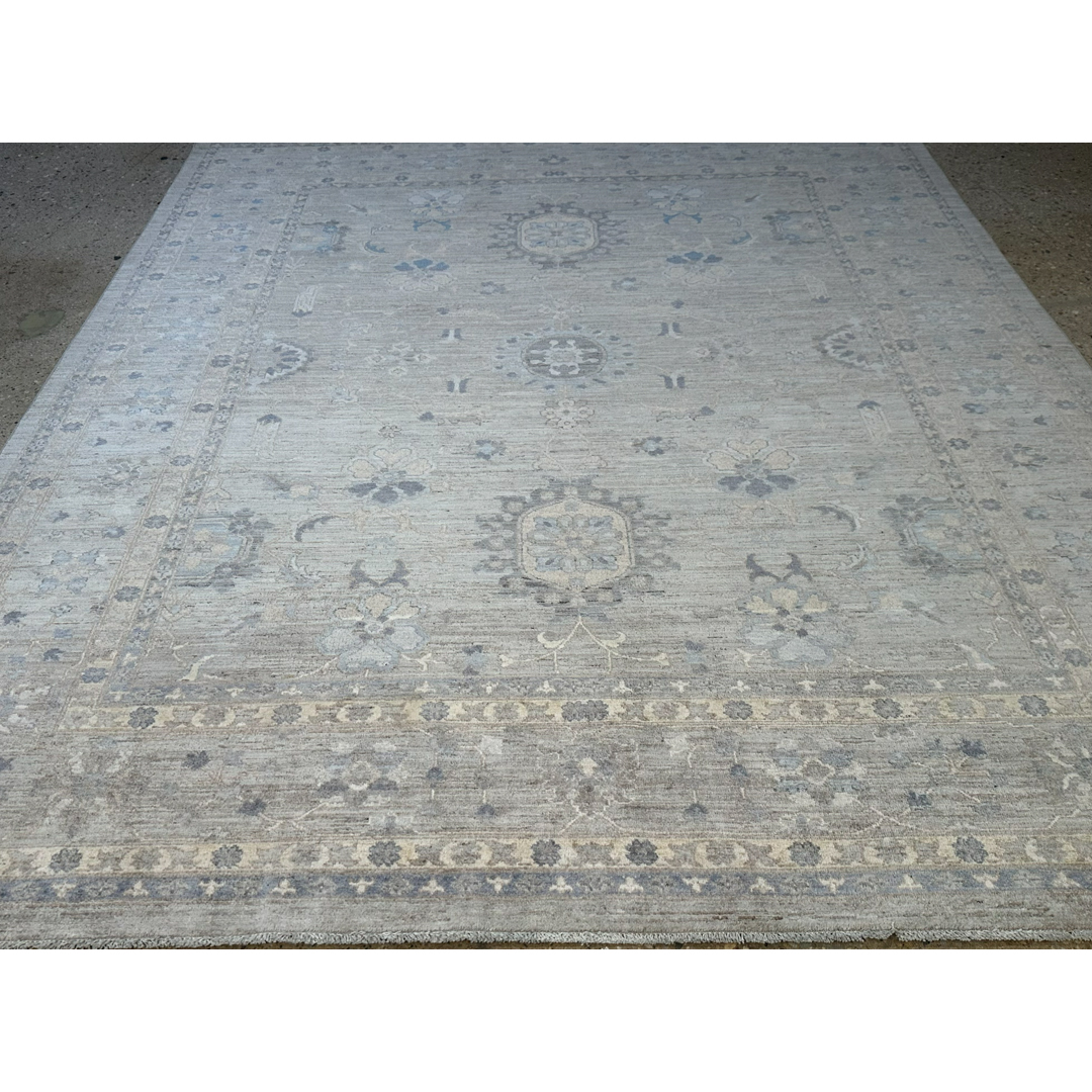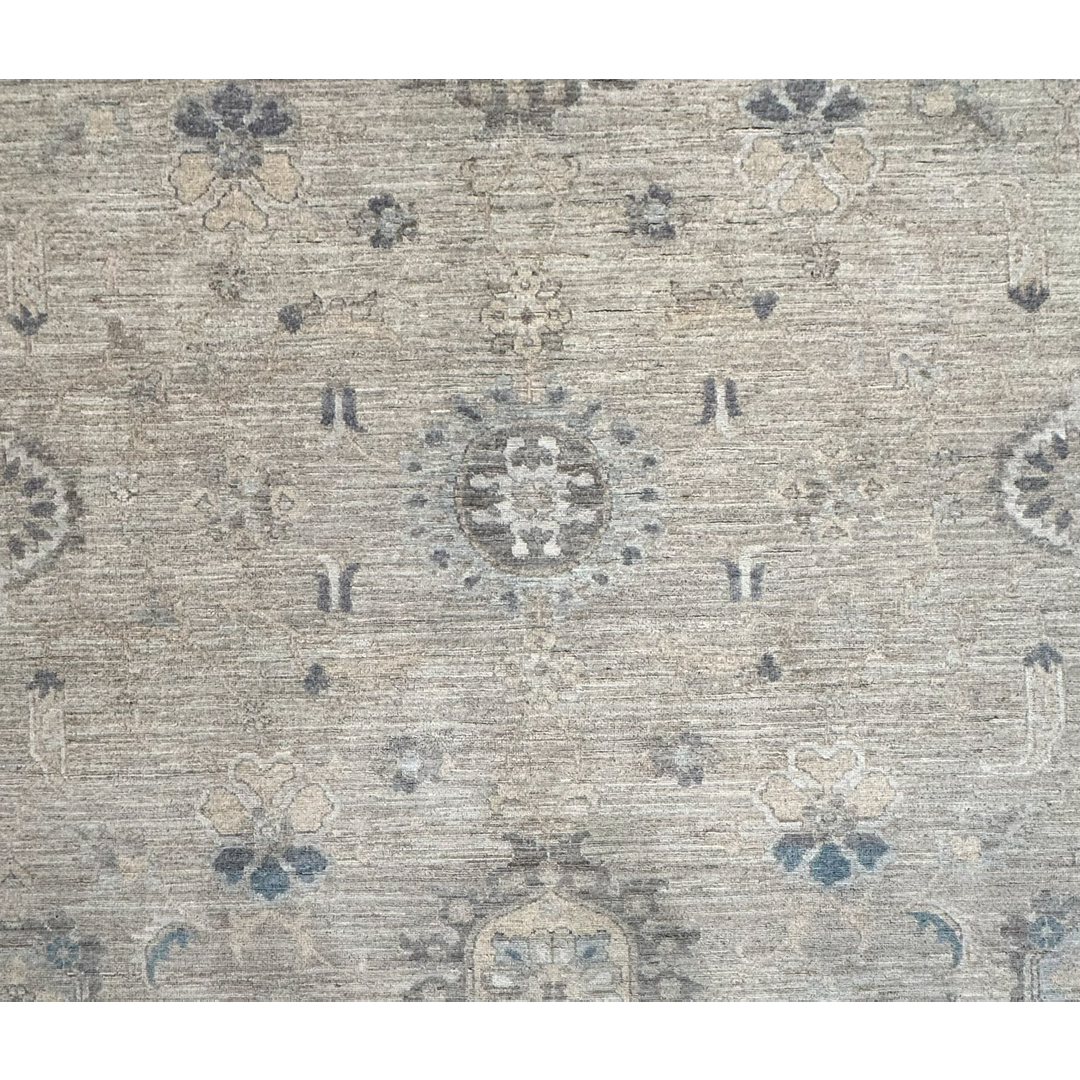 This exceptionally beautiful hand-knotted Pakistani rug represents the epitome of relaxed sophistication, offering a flawless transitional take on the classic Oushak aesthetic. The airy composition features an elegant central vertical axis of geometric medallions, surrounded by scattered, highly stylized floral palmettes and delicate scrolling vines. Rendered in a serene, low-contrast palette of crisp ivory, faint charcoal, and muted slate blue, these traditional motifs float elegantly across a luminous field of warm, heathered greige.