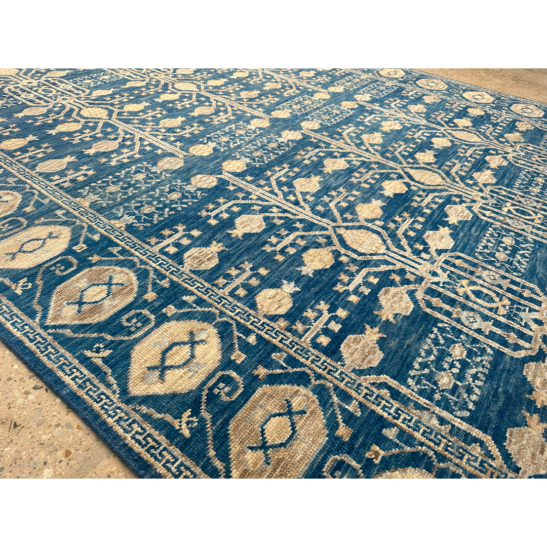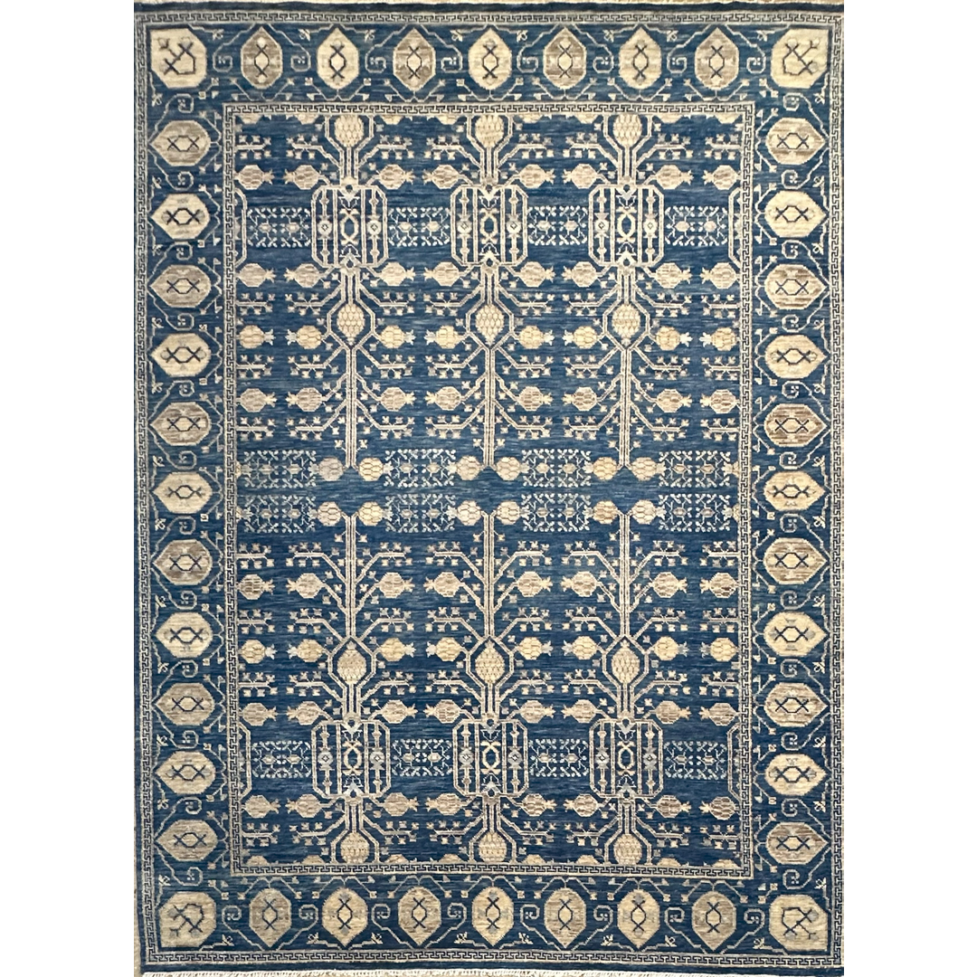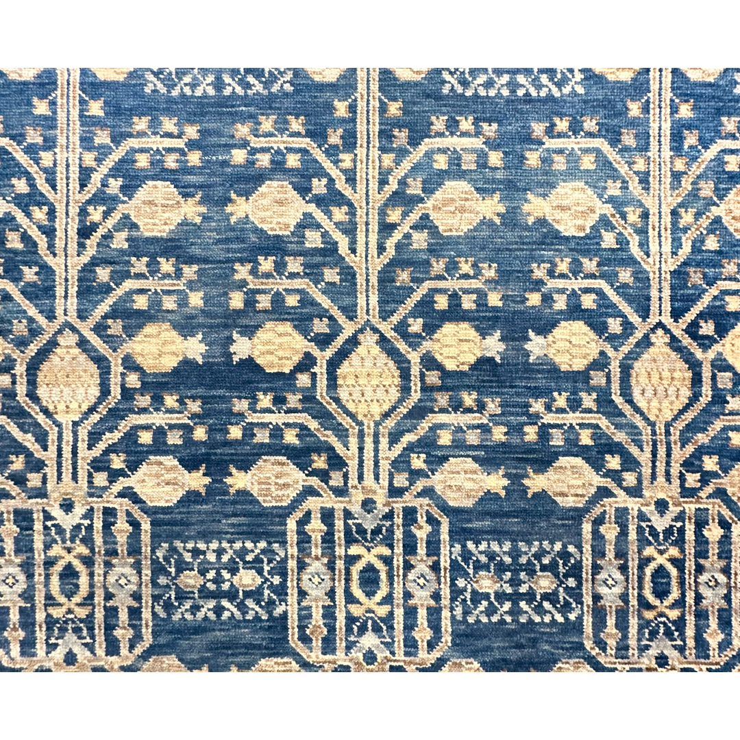 This hand-knotted rug from the Anatolian Collection features a powerful, architectural design that artfully reinterprets traditional “Pomegranate” and “Vase” motifs. The deep indigo field is organized by a symmetrical grid of stylized pomegranate trees, symbols of abundance, rendered in a crisp ivory and soft taupe. The design utilizes a distinctive linear “abrash” texture throughout the navy field, providing organic depth and a sense of movement that softens the rigid geometric structure. The composition is framed by a grand, primary border featuring oversized hexagonal medallions, flanked by a delicate Greek key guard border that adds a classical, refined finish. Woven with high-quality wool, the rug offers a dense, durable pile that highlights the clarity of its tribal-inspired artistry. Its substantial 9′ x 12’2″ ft. scale and high-contrast palette make it a definitive statement piece, ideal for a grand dining room, a formal library, or a sophisticated transitional living area.