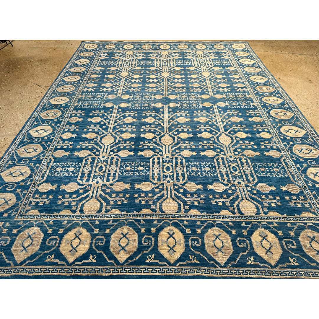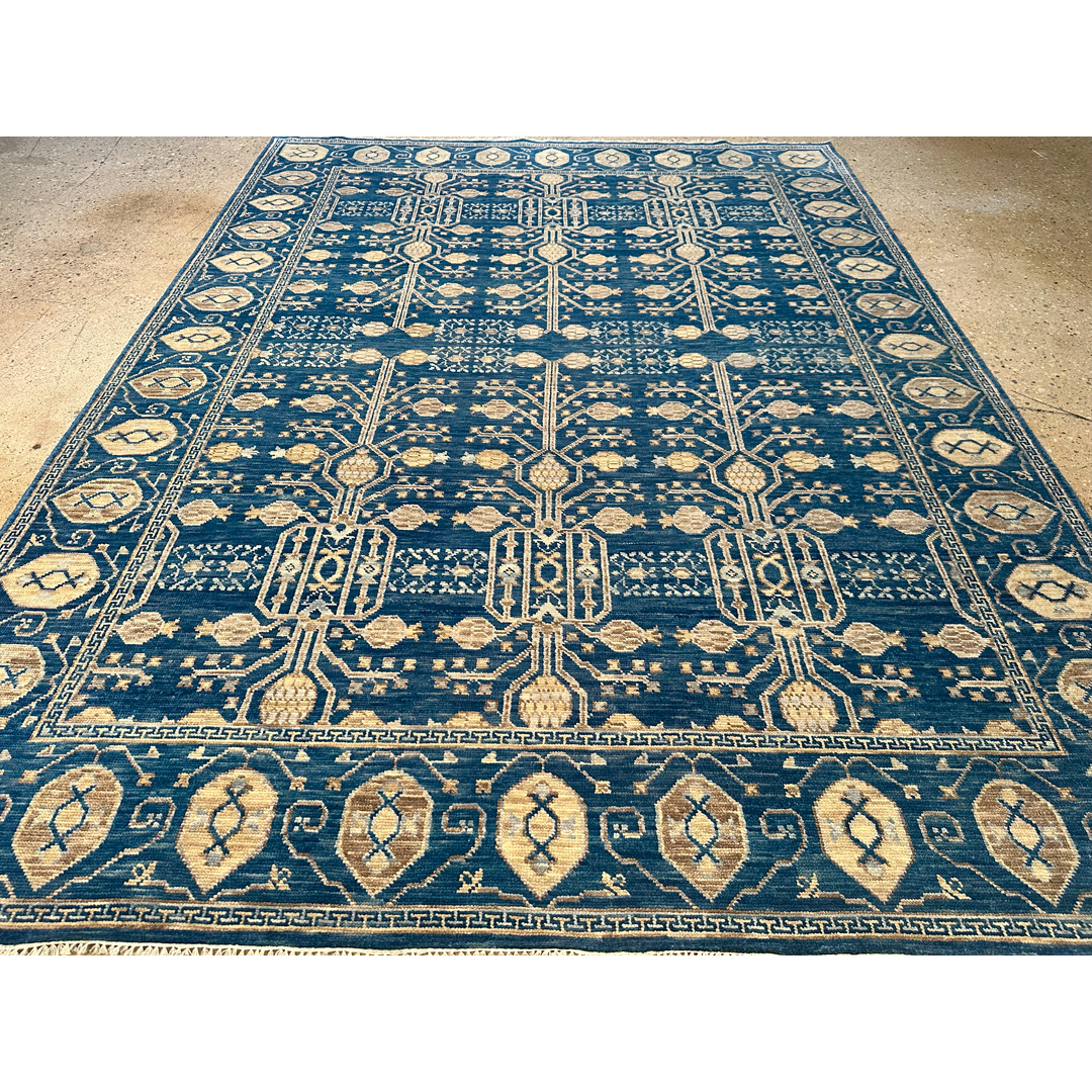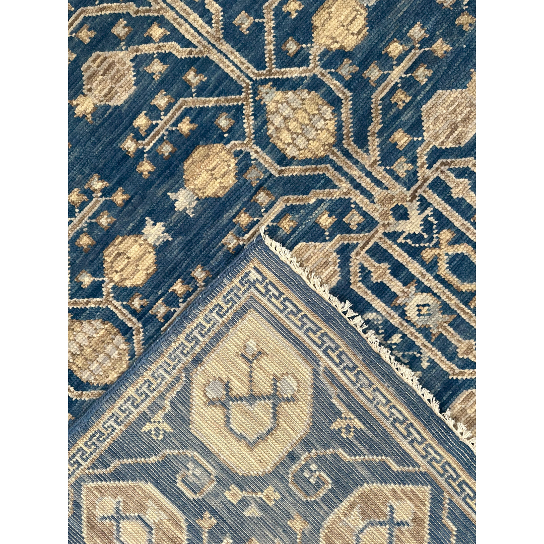 This hand-knotted rug from the Anatolian Collection features a powerful, architectural design that artfully reinterprets traditional “Pomegranate” and “Vase” motifs. The deep indigo field is organized by a symmetrical grid of stylized pomegranate trees, symbols of abundance, rendered in a crisp ivory and soft taupe. The design utilizes a distinctive linear “abrash” texture throughout the navy field, providing organic depth and a sense of movement that softens the rigid geometric structure. The composition is framed by a grand, primary border featuring oversized hexagonal medallions, flanked by a delicate Greek key guard border that adds a classical, refined finish. Woven with high-quality wool, the rug offers a dense, durable pile that highlights the clarity of its tribal-inspired artistry. Its substantial 9′ x 12’2″ ft. scale and high-contrast palette make it a definitive statement piece, ideal for a grand dining room, a formal library, or a sophisticated transitional living area.