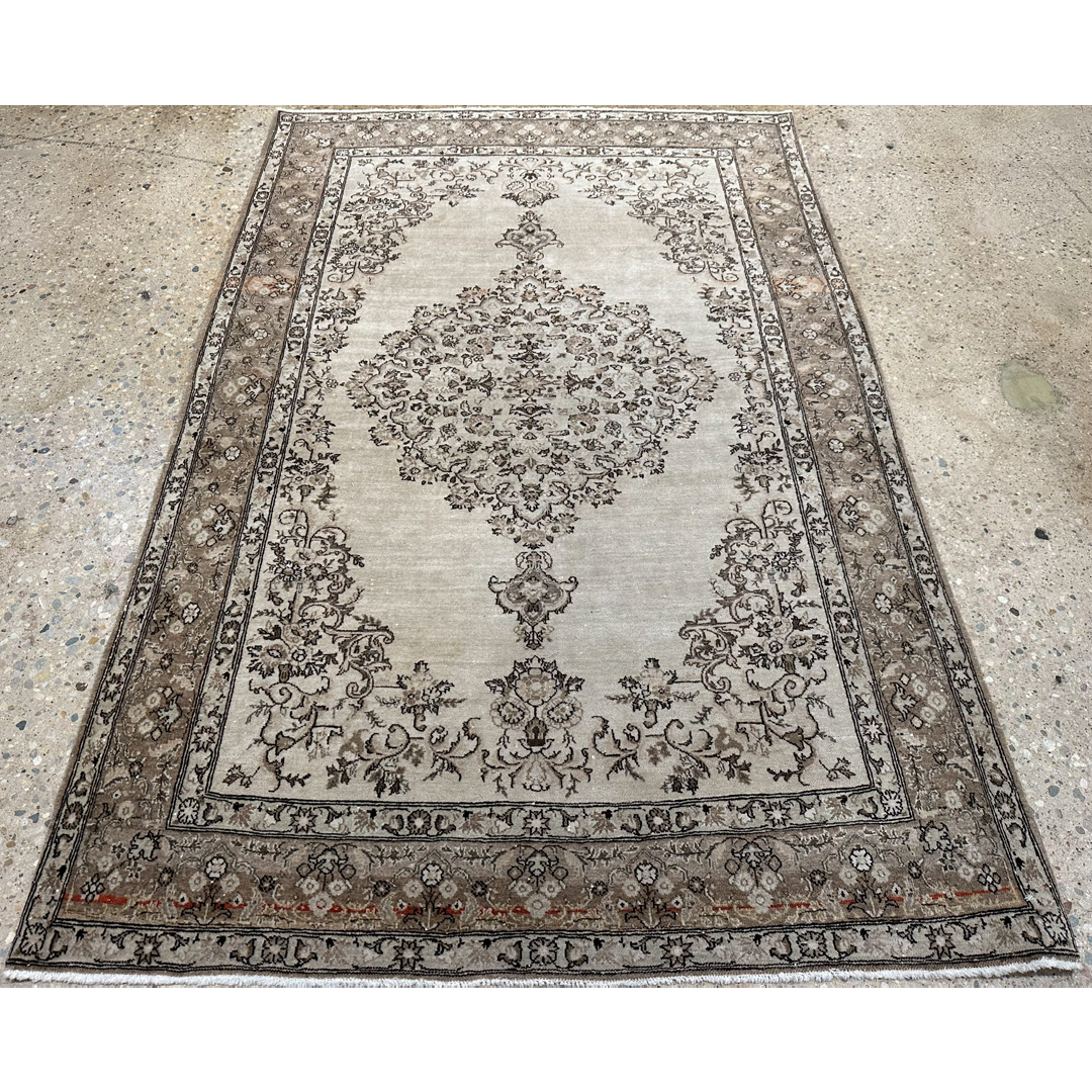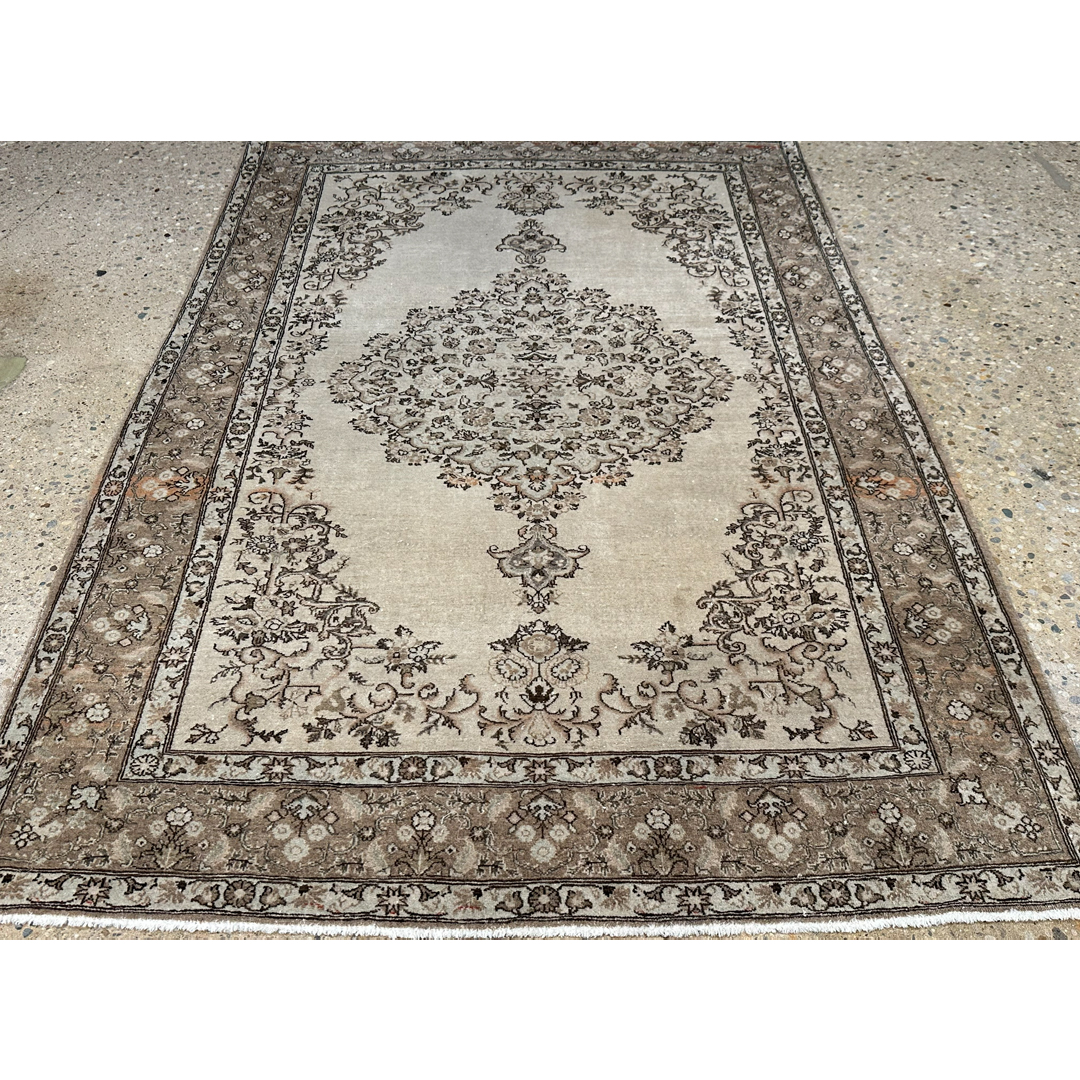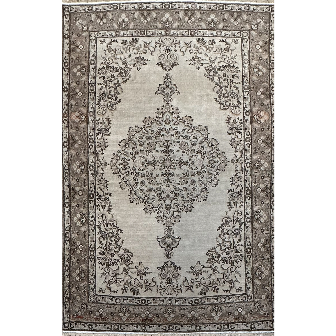 Introduce a layer of understated luxury to your home with this quality 4’8″ x 6’9″ ft. antique Persian Qum rug. A genuine hand-knotted treasure from the 1910s, this piece features a sophisticated, monochromatic aesthetic that aligns perfectly with modern tastes. The design centers on an intricate, medallion-and-corner layout rendered in a soothing palette of silvery-grey, mushroom, and soft taupe. The open field allows the delicate floral tracery and central motif to shine without overwhelming the eye, creating a serene and elegant atmosphere. Framed by a matching floral border, this refined wool rug offers a versatile and neutral foundation ideal for a bedroom, formal living room, or quiet study.