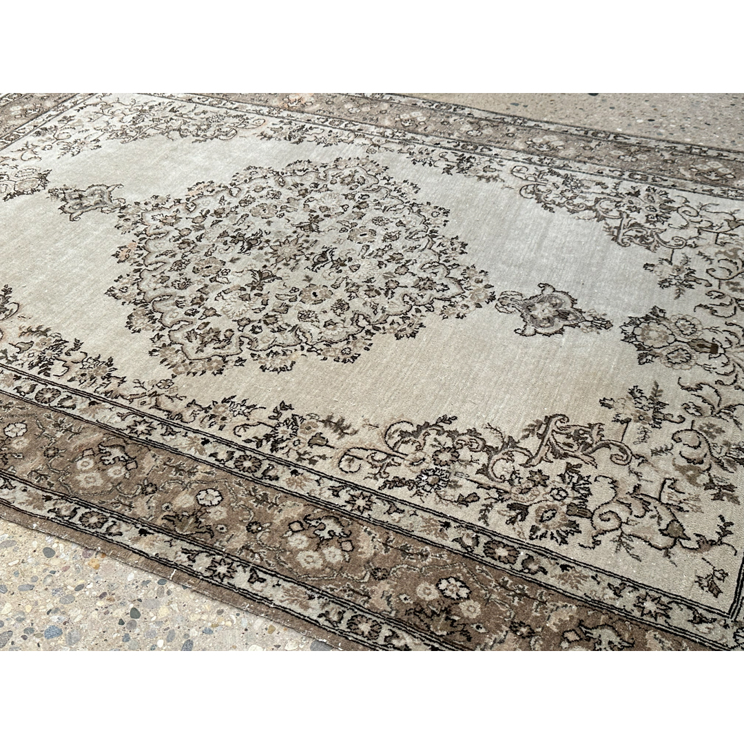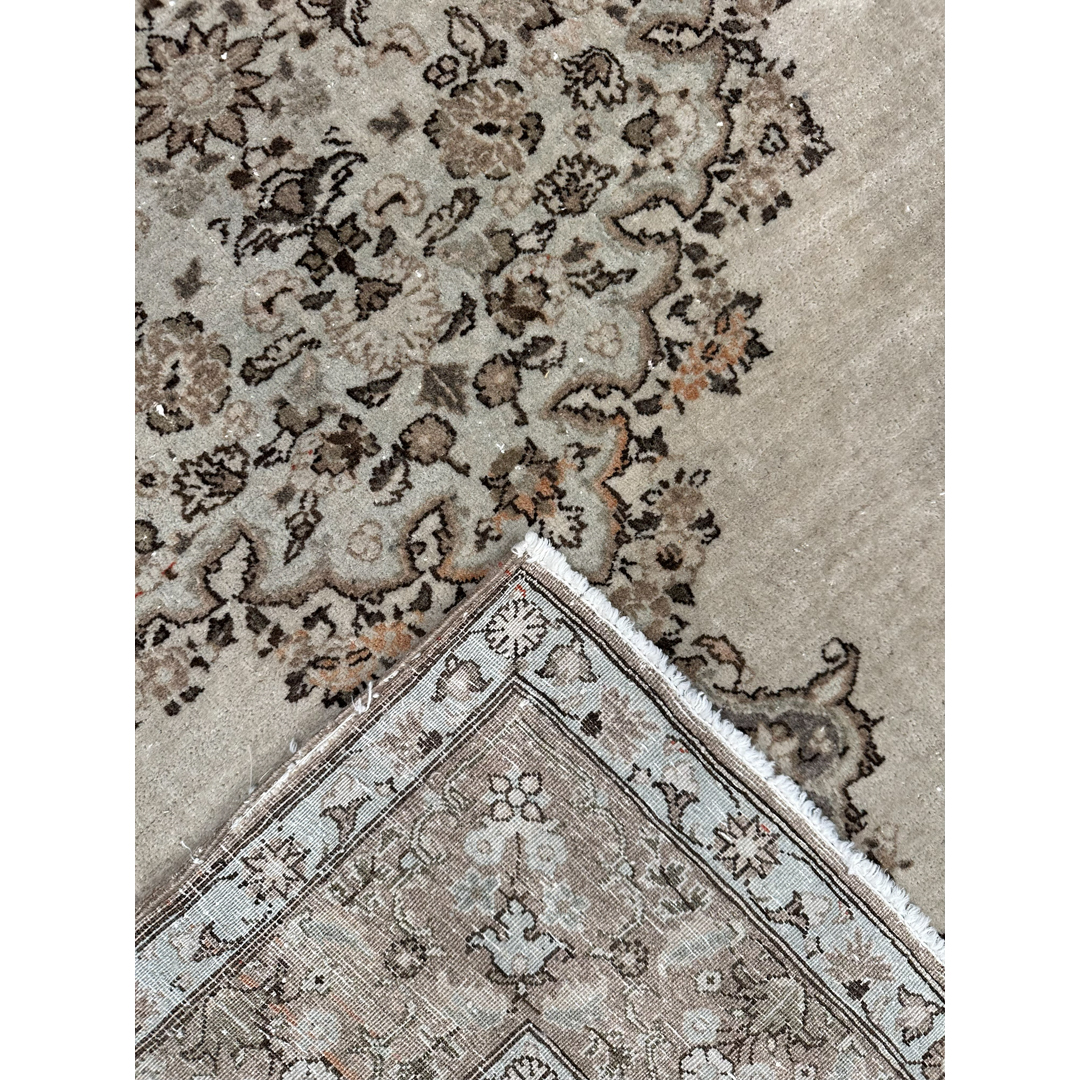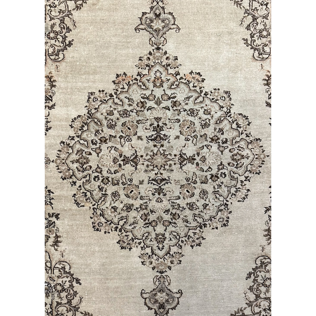 Introduce a layer of understated luxury to your home with this quality 4’8″ x 6’9″ ft. antique Persian Qum rug. A genuine hand-knotted treasure from the 1910s, this piece features a sophisticated, monochromatic aesthetic that aligns perfectly with modern tastes. The design centers on an intricate, medallion-and-corner layout rendered in a soothing palette of silvery-grey, mushroom, and soft taupe. The open field allows the delicate floral tracery and central motif to shine without overwhelming the eye, creating a serene and elegant atmosphere. Framed by a matching floral border, this refined wool rug offers a versatile and neutral foundation ideal for a bedroom, formal living room, or quiet study.
