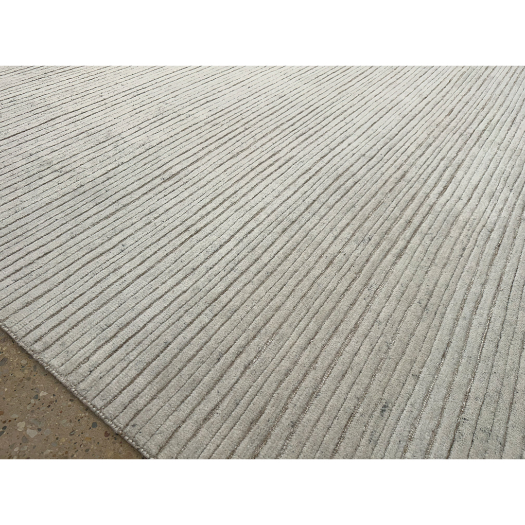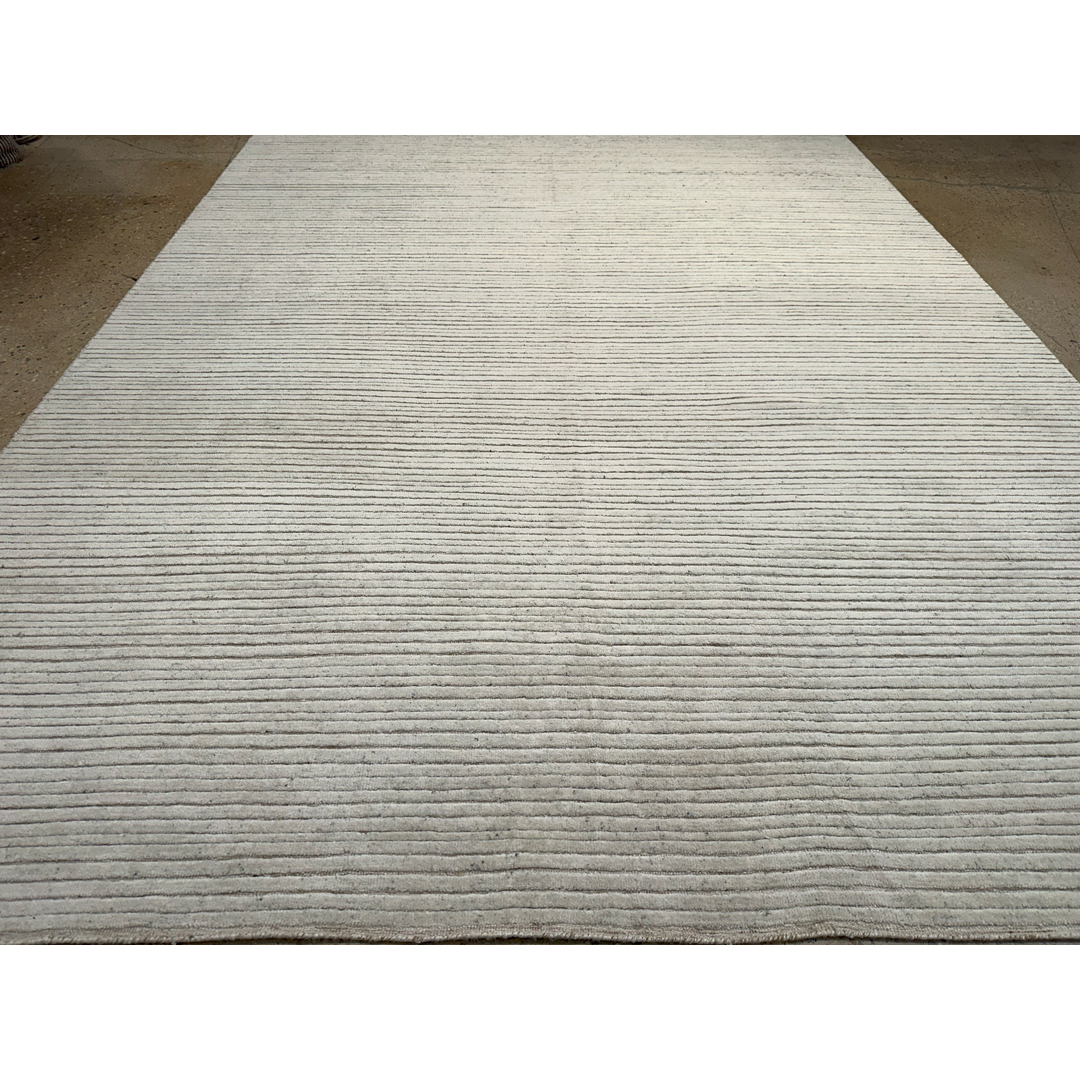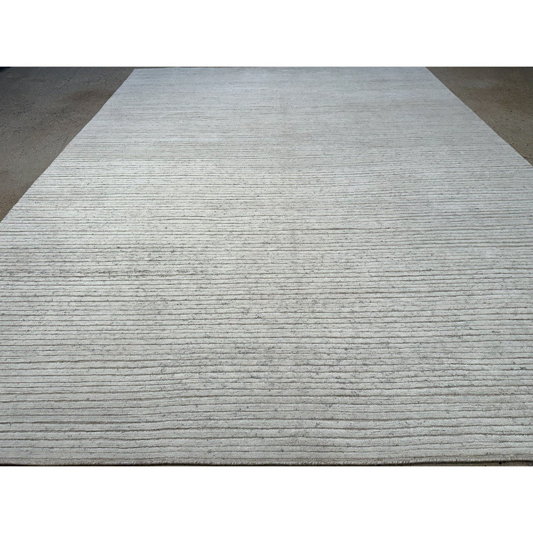 Establish a foundation of serene sophistication with this modern minimalist rug. Measuring a generous 10’2″ x 13’9″ ft., this large 10×14 area rug is defined by its beautiful and subtle texture. Its surface features fine, horizontal ribs, creating a gentle linear quality across a luminous field of soft ivory and light silver-gray. Expertly hand-loomed, the plush and inviting pile offers a layer of luxurious comfort underfoot. This rug is the ideal choice for a minimalist Moroccan, Scandinavian, or contemporary interior, providing a calm and cohesive backdrop for a spacious living room or master suite with its understated elegance.